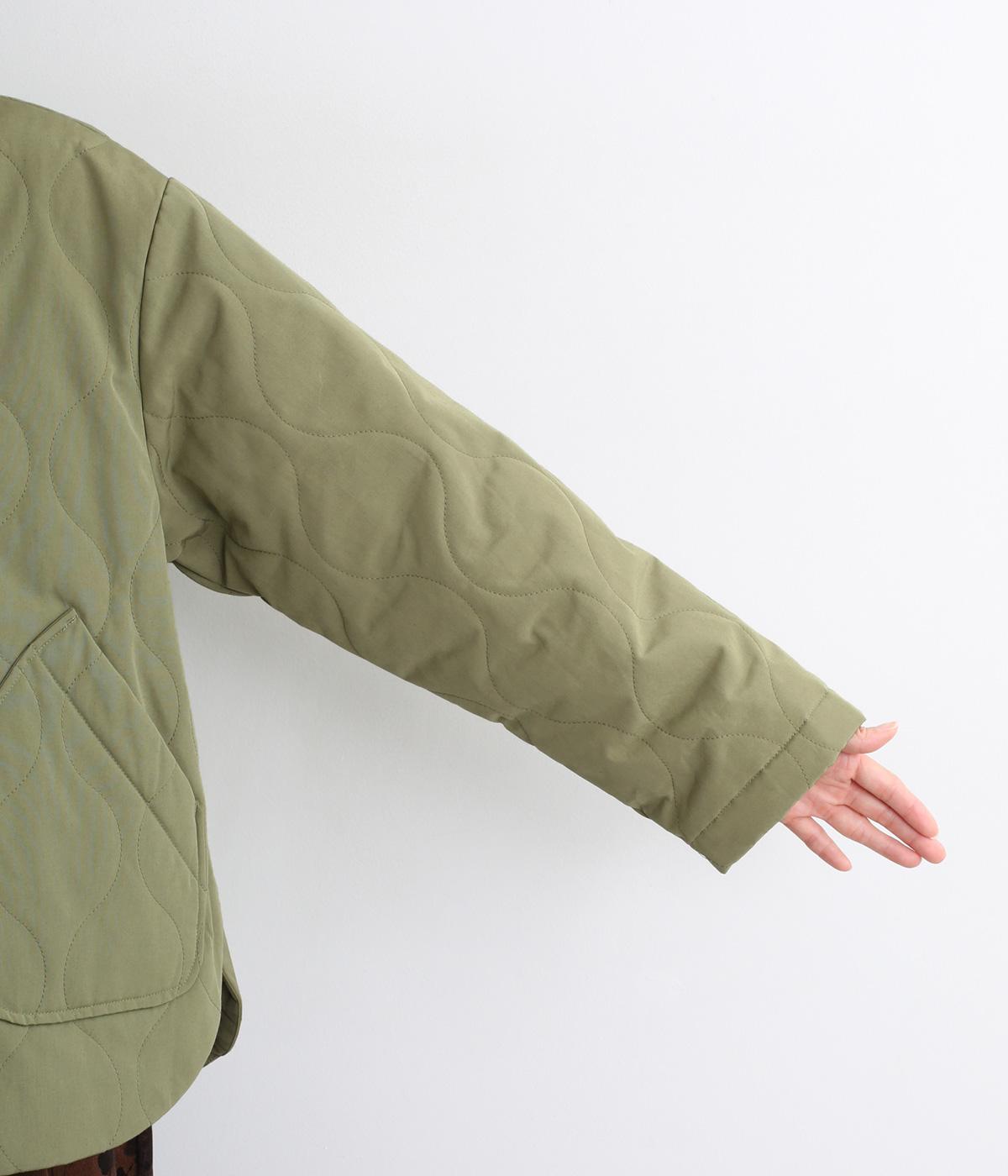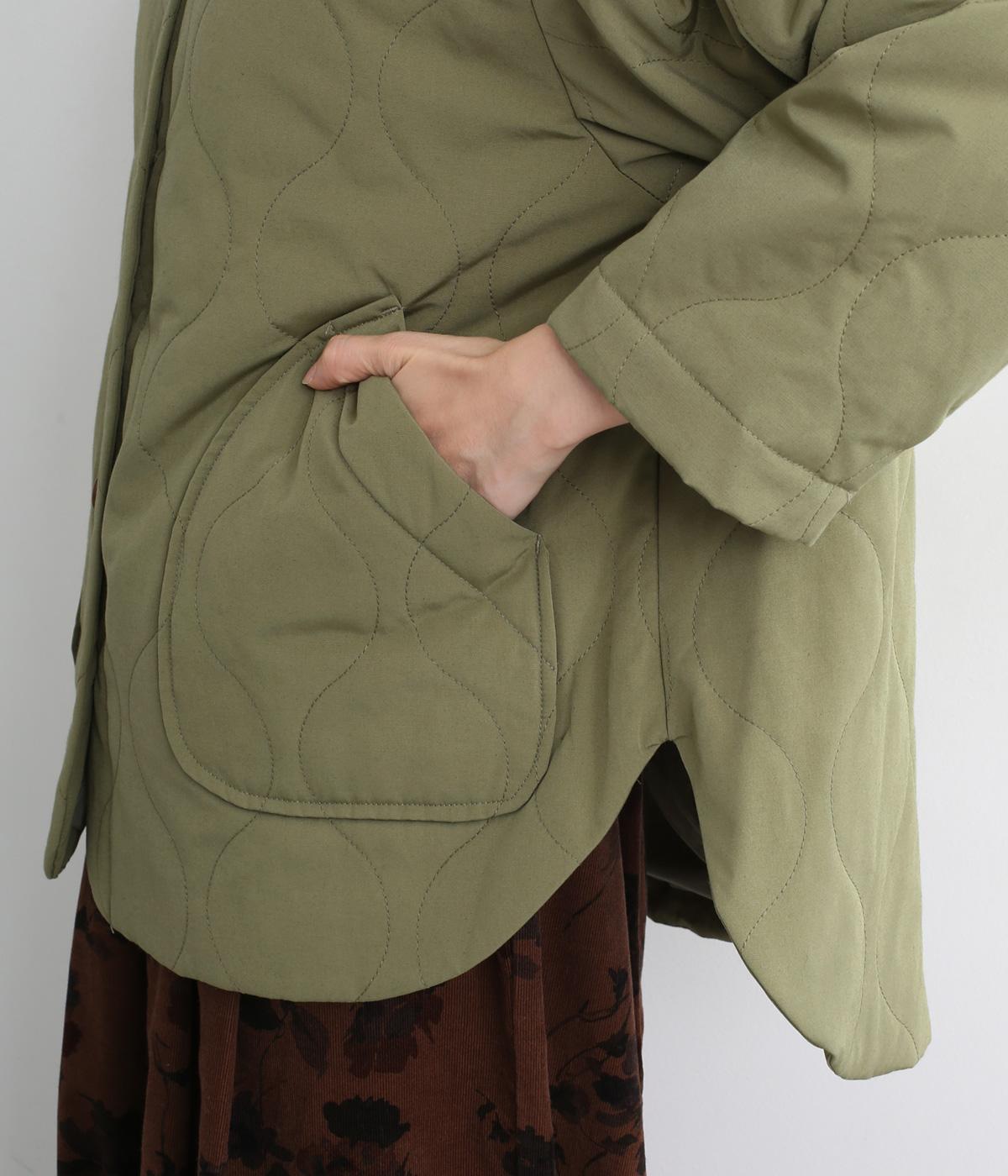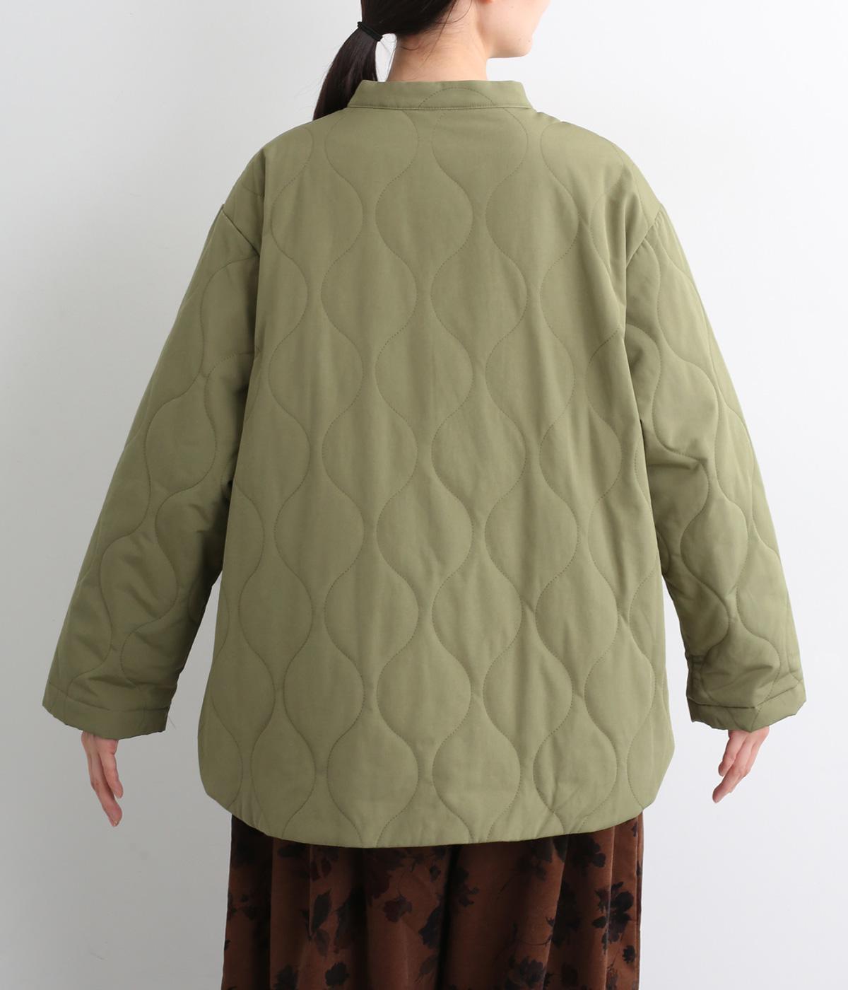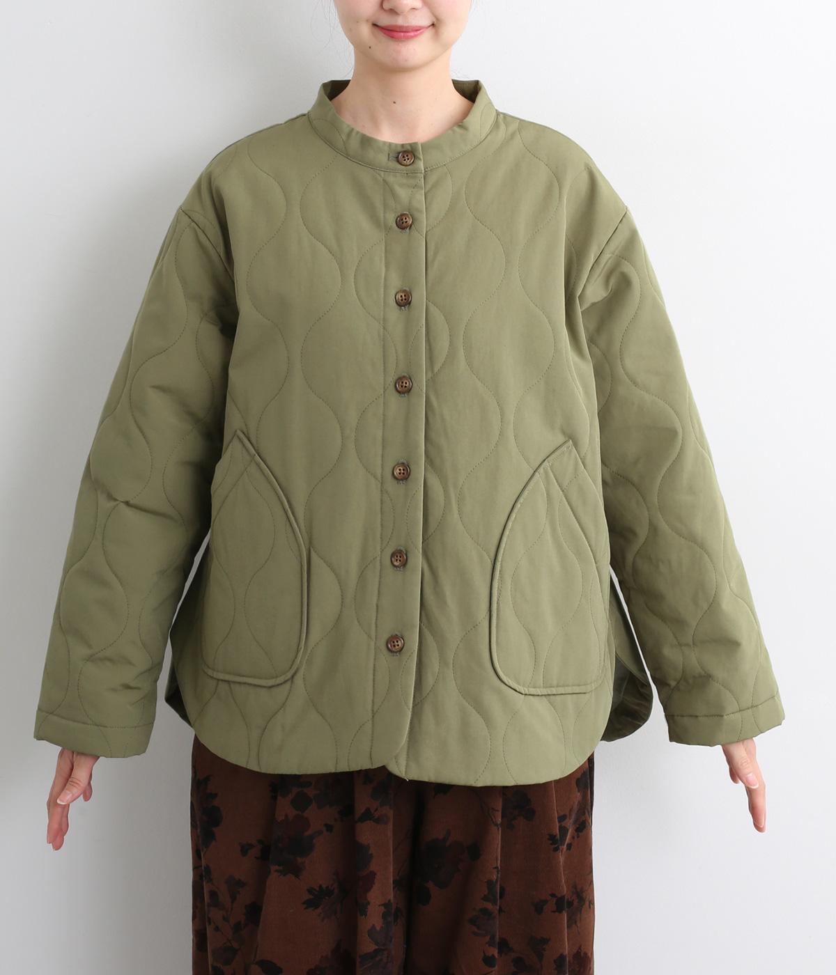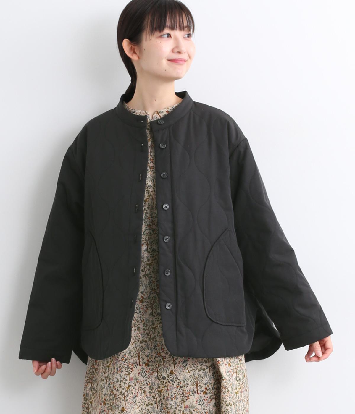ボタンやラウンドカットの裾、バンドカラーなど随所にシャツディティールを取り入れたジャケット。大きめのひょうたんキルト地でカジュアルに仕上げました。裾に前後差をもたせることで、丸みを帯びた女性らしいシルエットにしています。