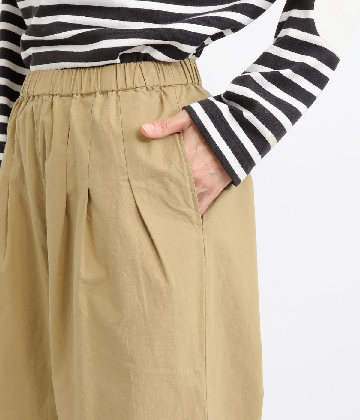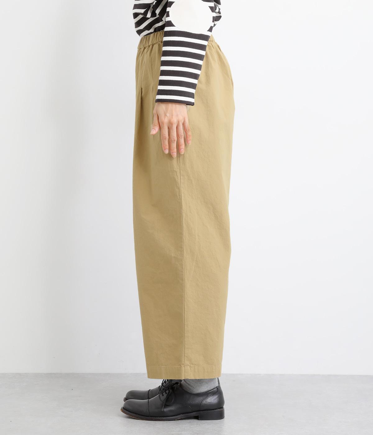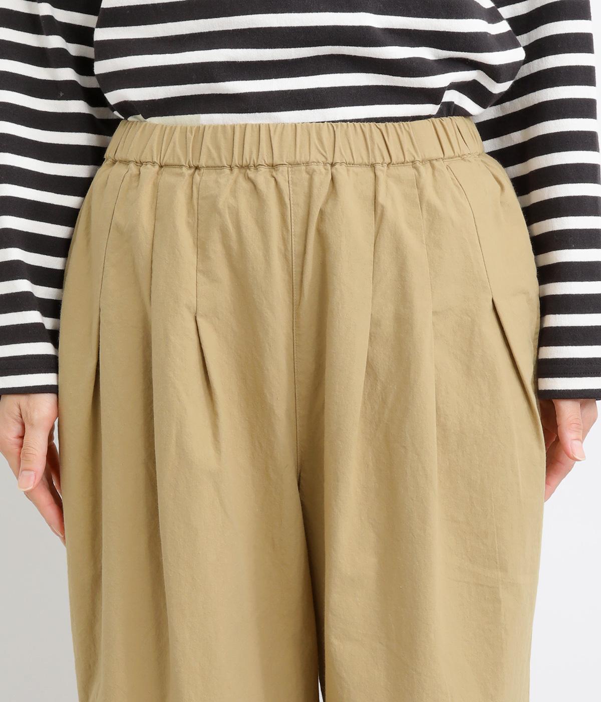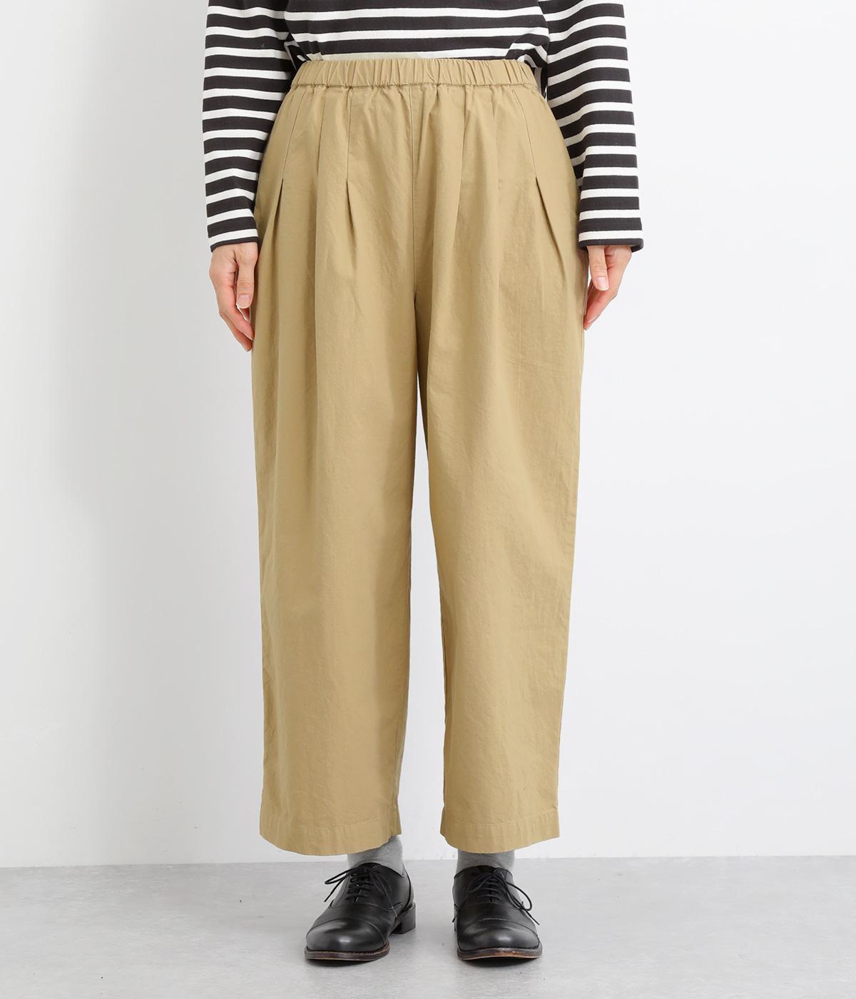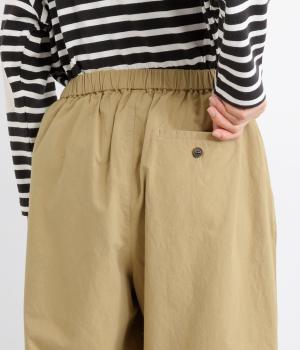 フロントのタックでゆとりをもたせ、ほどよくテーパードさせたラフになりすぎないシルエットが魅力。ボタンつきのヒップポケットで、スラックスのようなきちんと感をプラスしました。ウエストは総ゴム仕様、内紐つきで穿き心地も快適です。