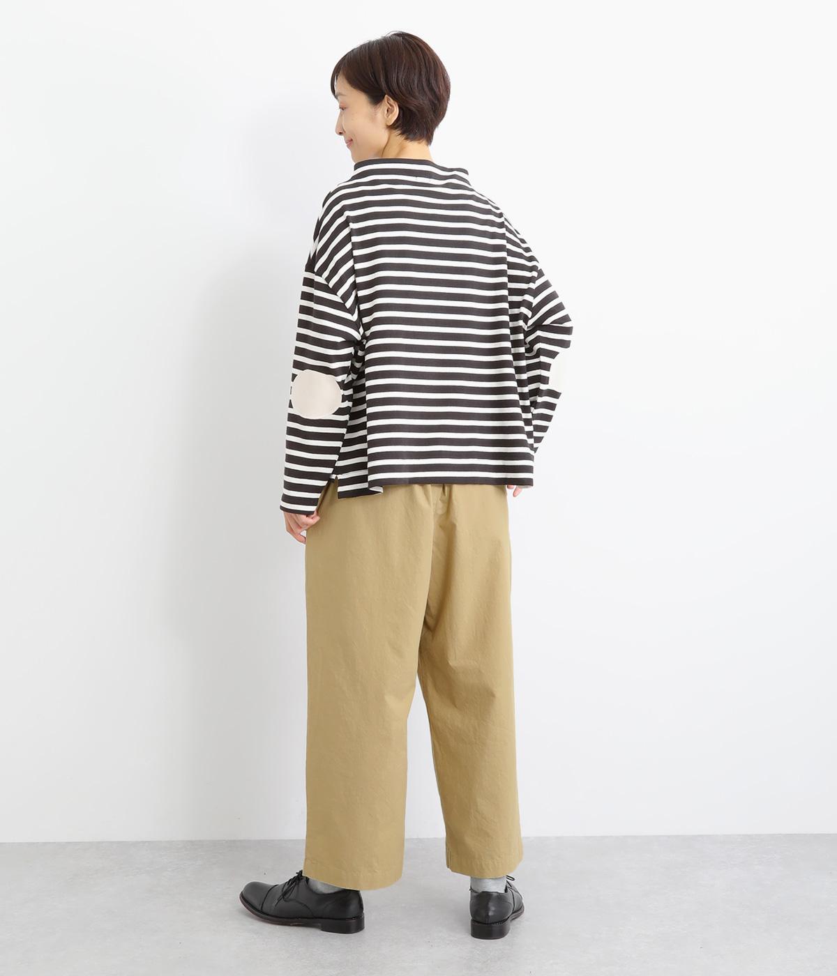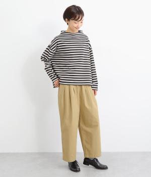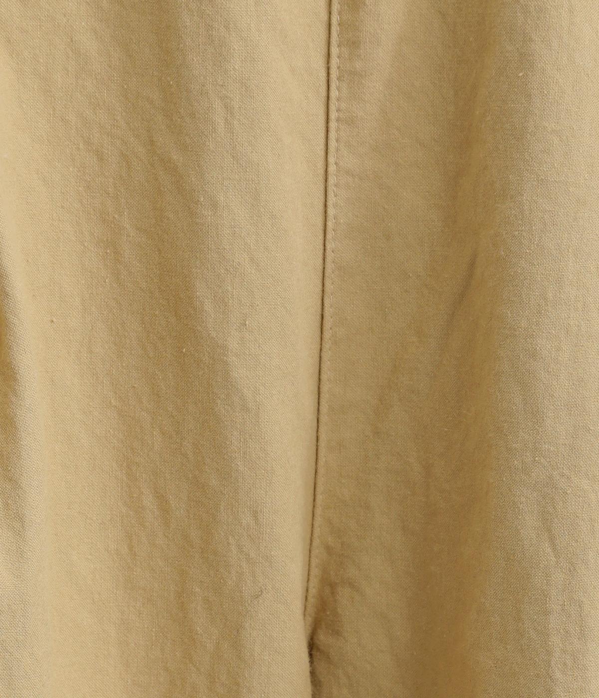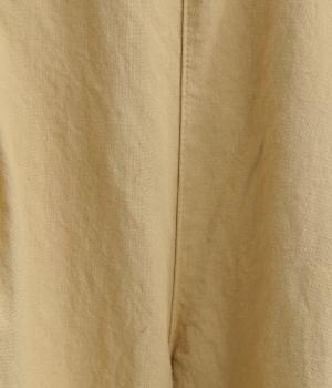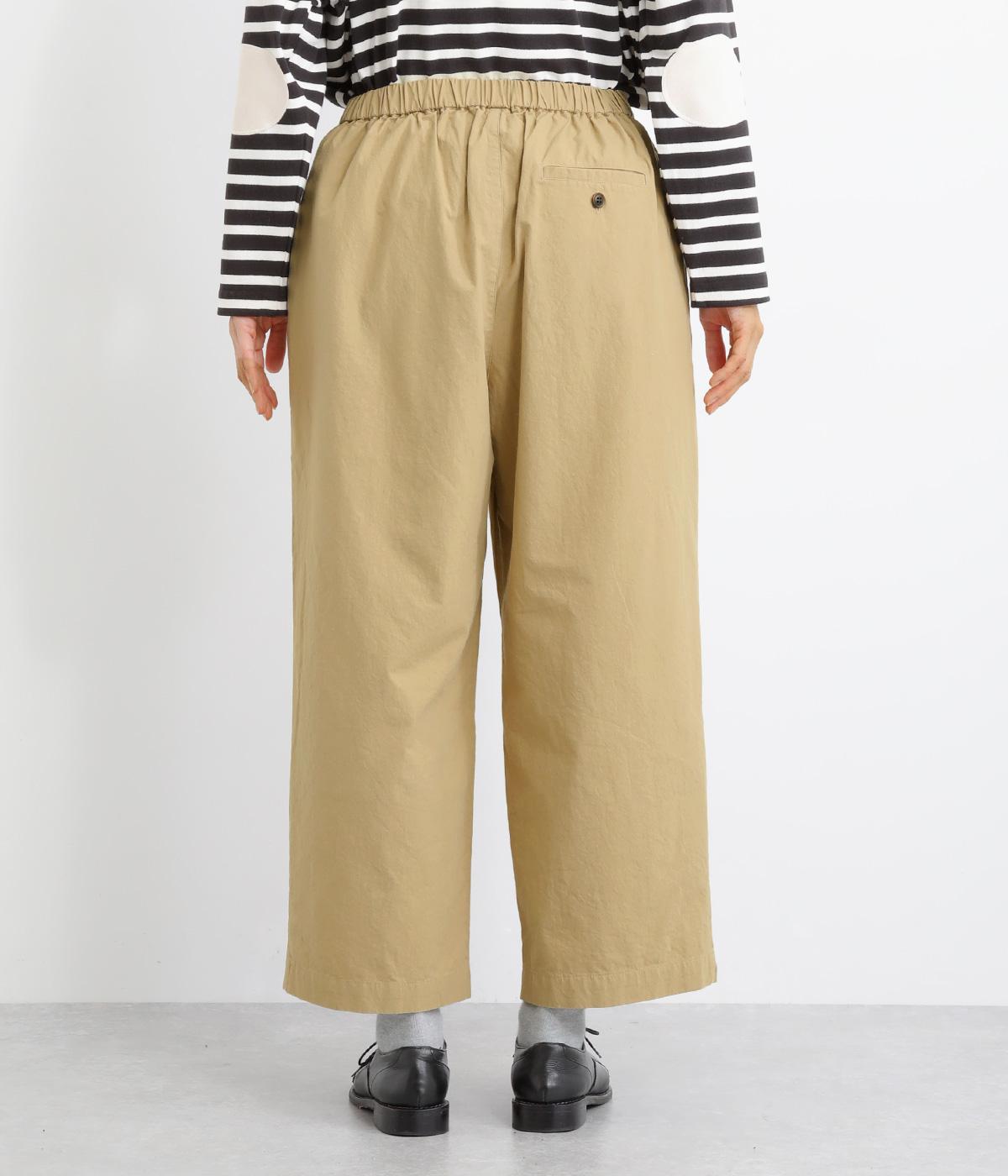 フロントのタックでゆとりをもたせ、ほどよくテーパードさせたラフになりすぎないシルエットが魅力。ボタンつきのヒップポケットで、スラックスのようなきちんと感をプラスしました。ウエストは総ゴム仕様、内紐つきで穿き心地も快適です。