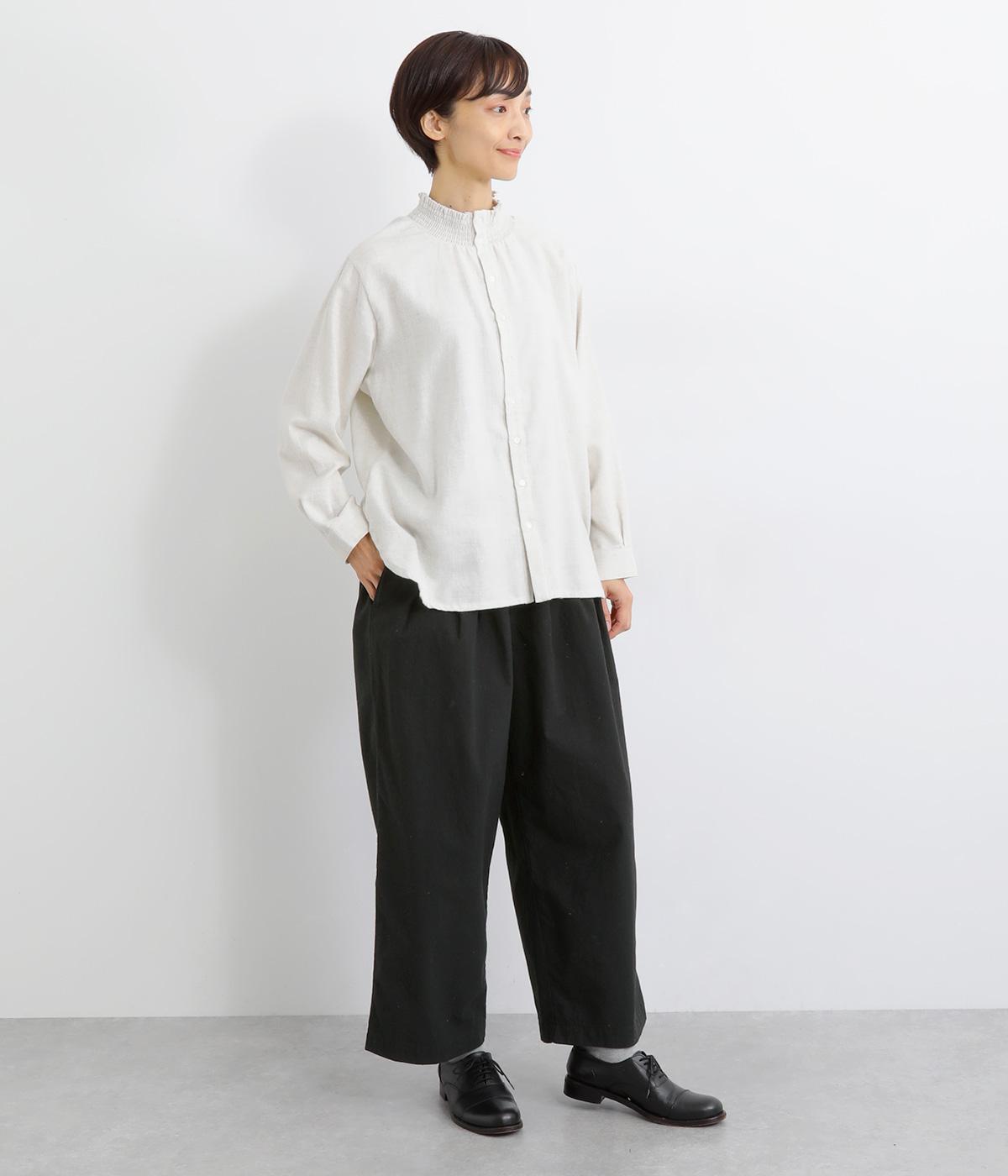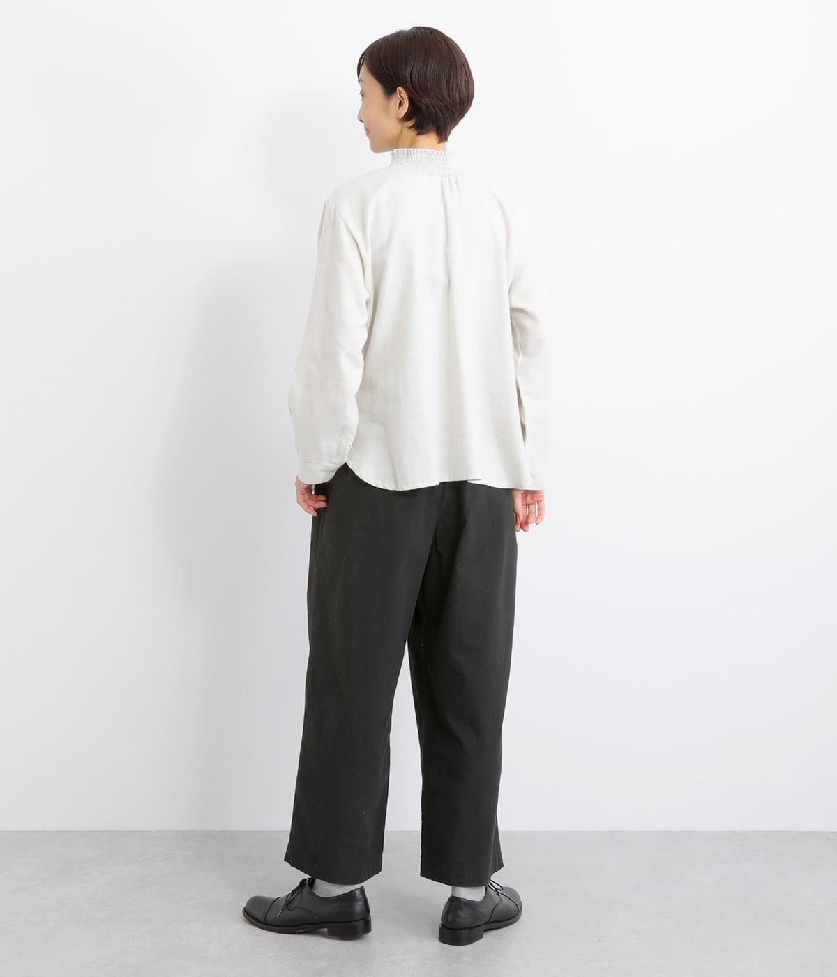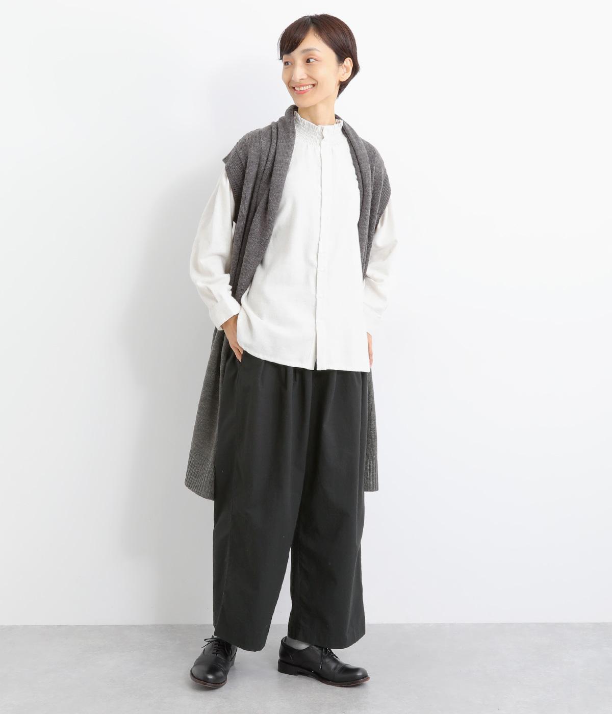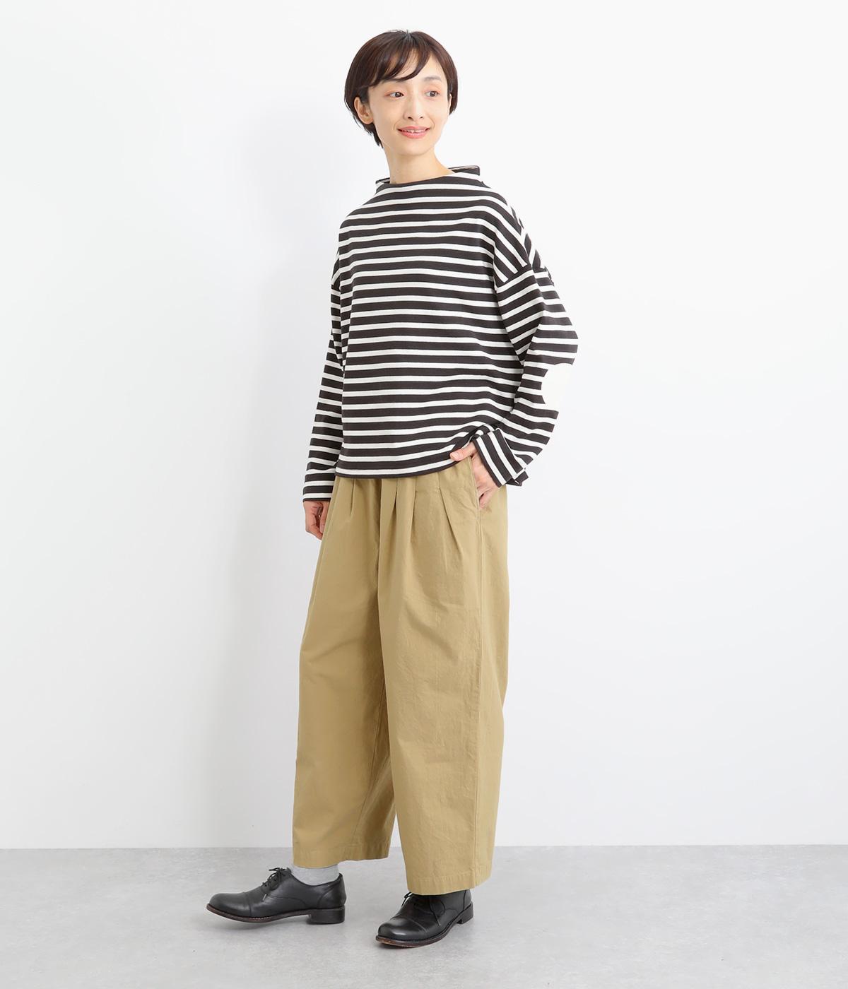 フロントのタックでゆとりをもたせ、ほどよくテーパードさせたラフになりすぎないシルエットが魅力。ボタンつきのヒップポケットで、スラックスのようなきちんと感をプラスしました。ウエストは総ゴム仕様、内紐つきで穿き心地も快適です。