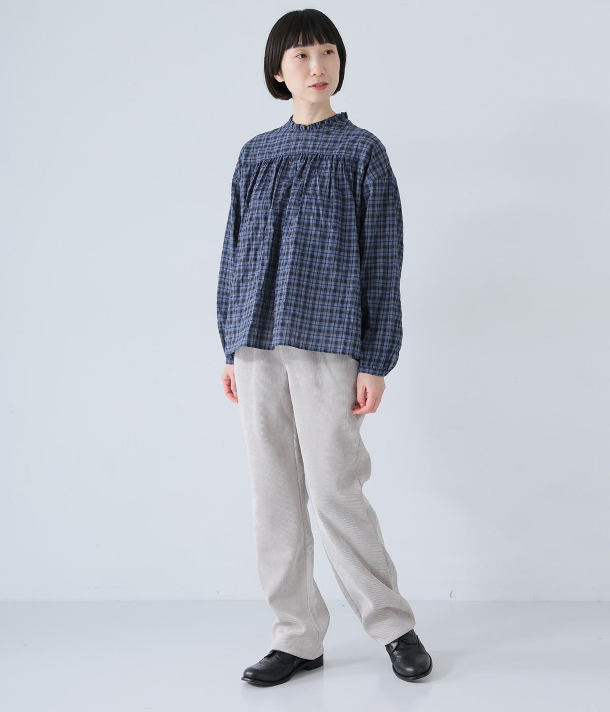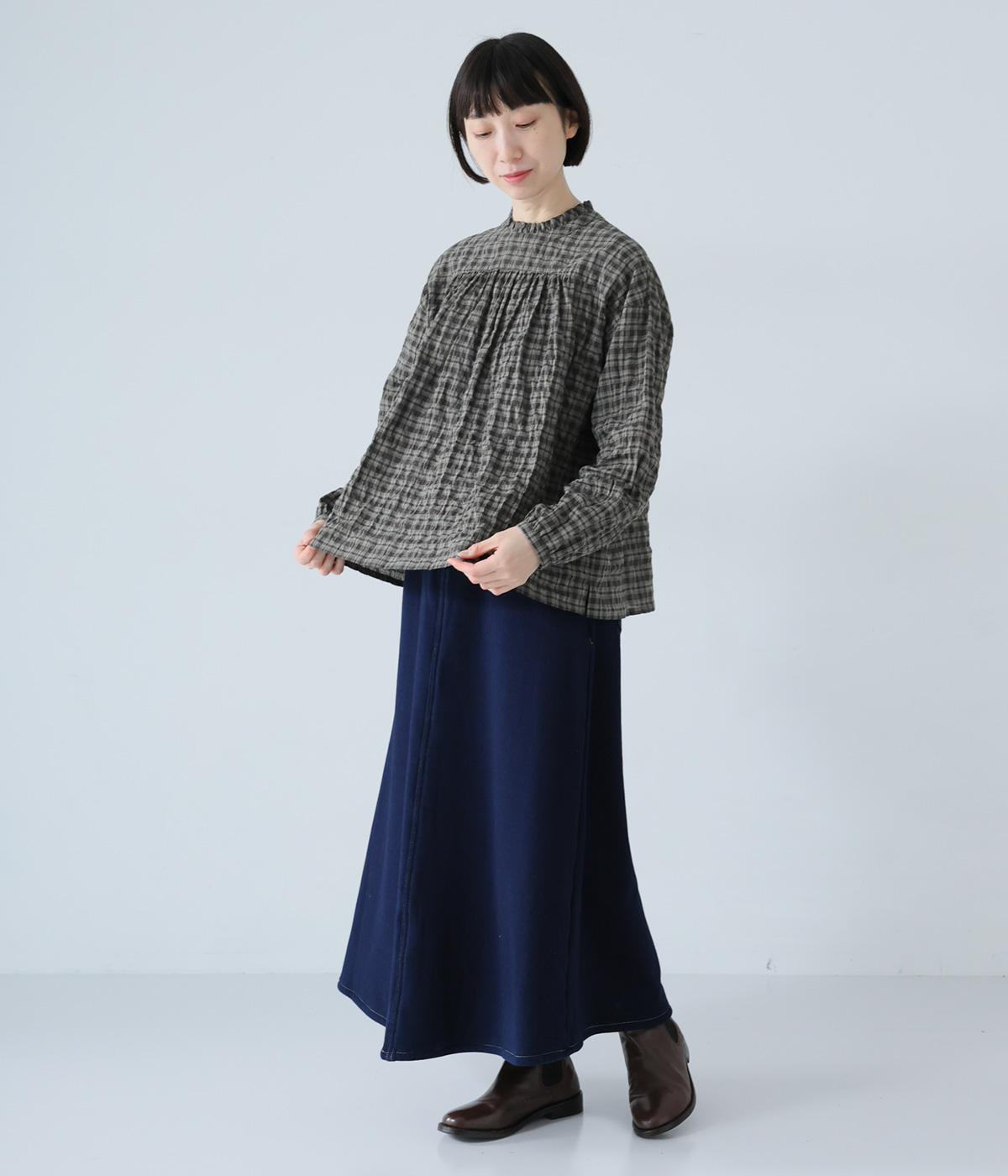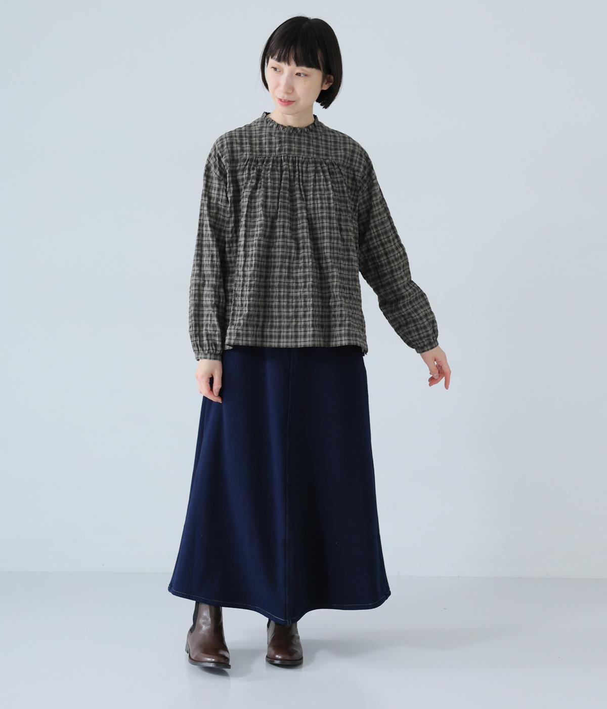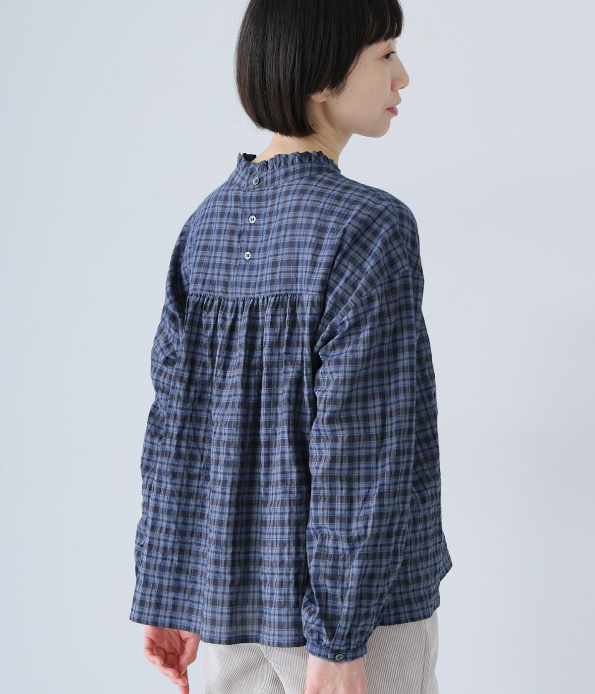 クシュっとした薄手のシャーリング生地にチェック柄をあしらいました。コットンならではの軽やかさと通気性の高さを存分に味わえる生地感です。