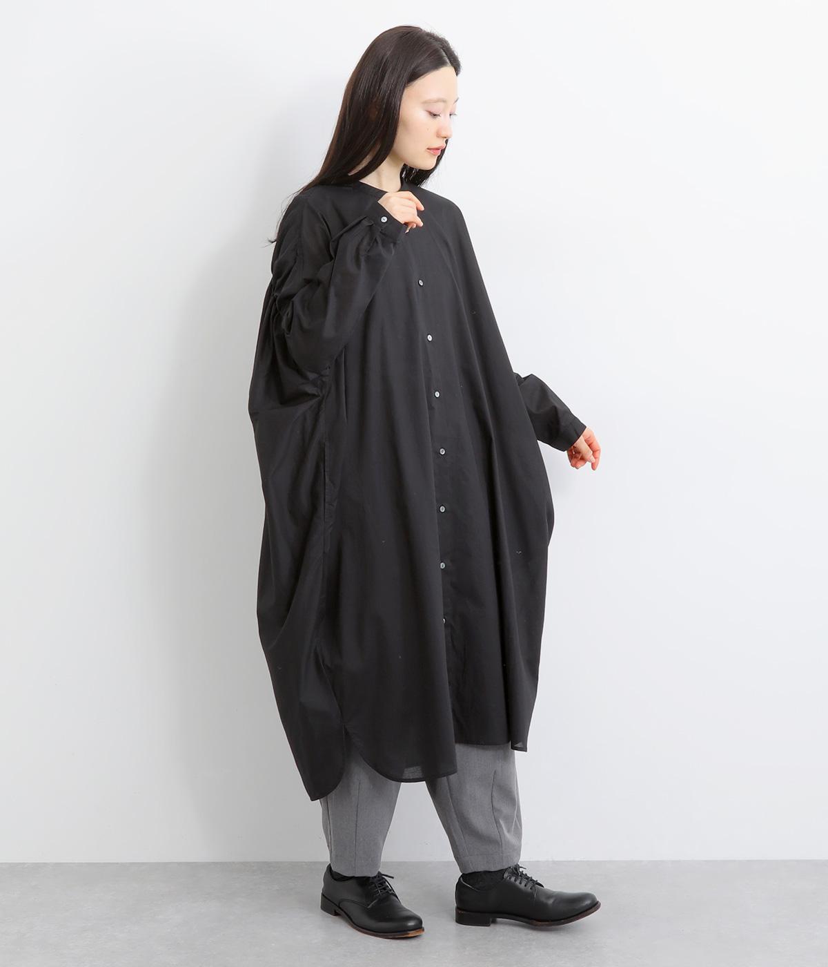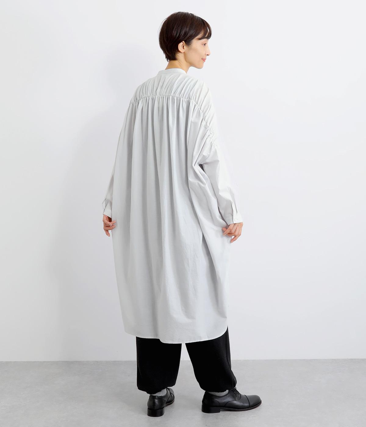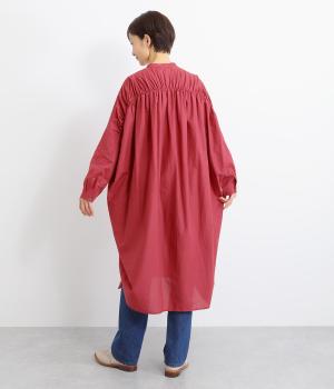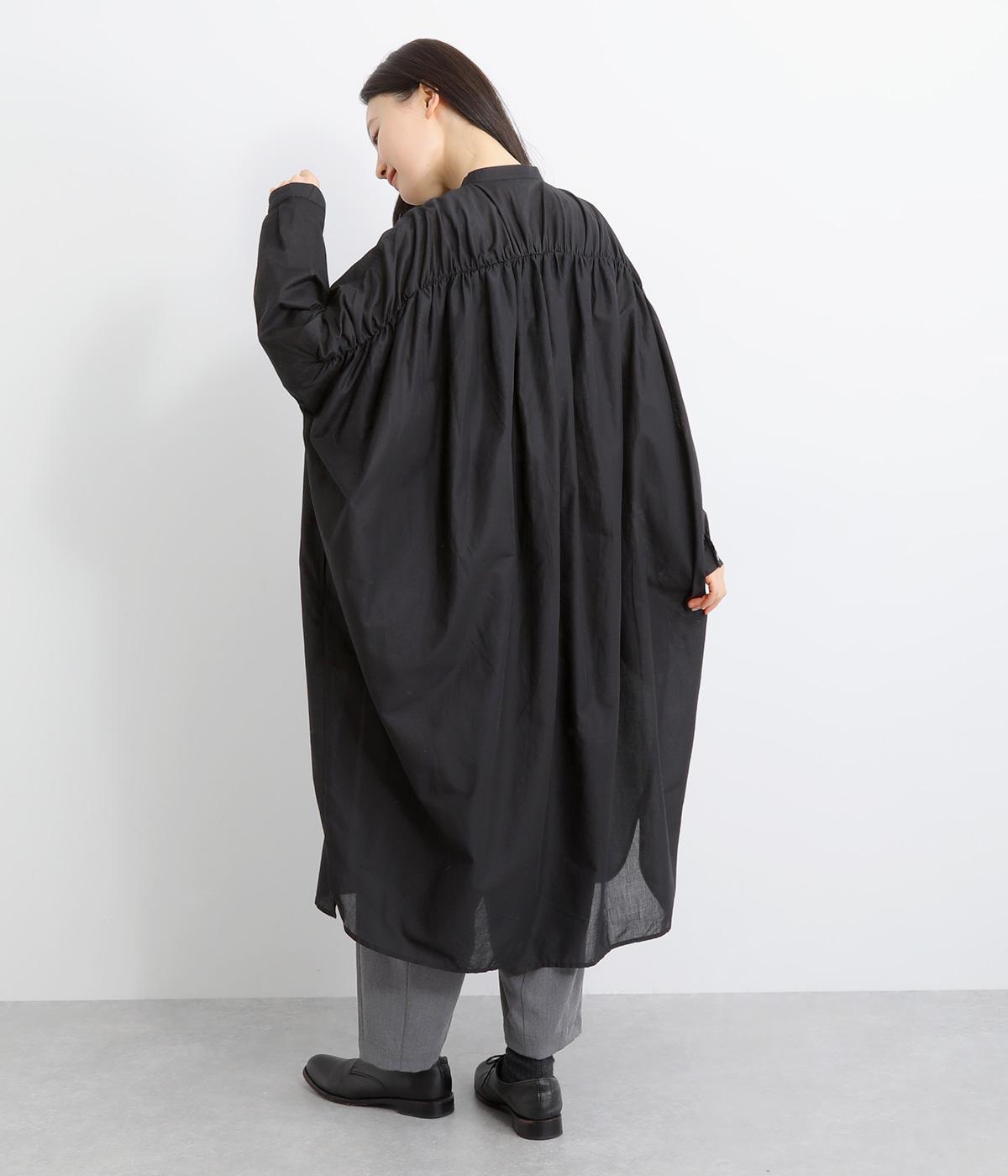 後ろ身頃の切り替えから上下にたっぷりとギャザーを入れてふんわりとさせたワンピース。前後差のあるラウンドヘムで、ボリュームシルエットも軽やかな雰囲気に仕上げました。小さな貝ボタンが繊細なムードをプラス。両サイドには便利なポケットをつけています。