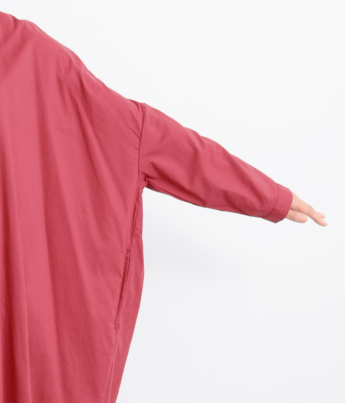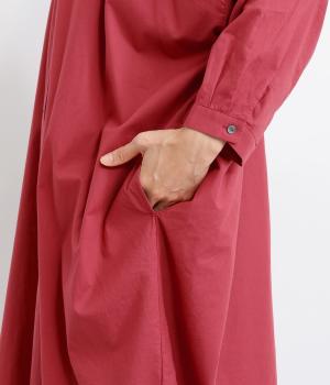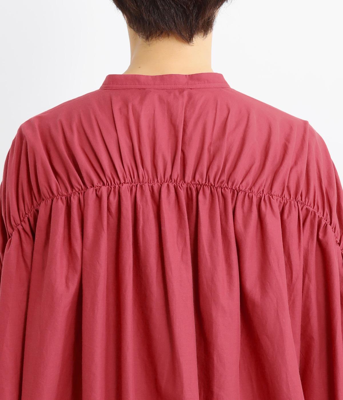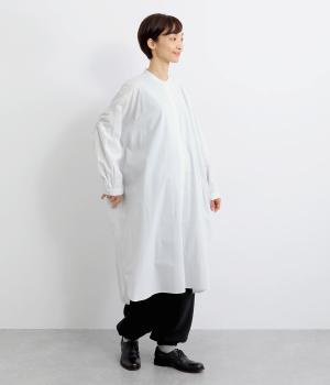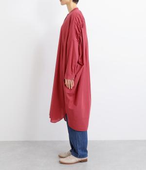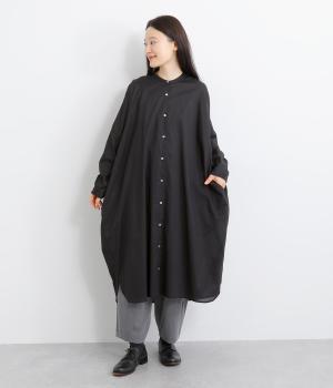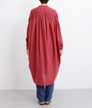 後ろ身頃の切り替えから上下にたっぷりとギャザーを入れてふんわりとさせたワンピース。前後差のあるラウンドヘムで、ボリュームシルエットも軽やかな雰囲気に仕上げました。小さな貝ボタンが繊細なムードをプラス。両サイドには便利なポケットをつけています。