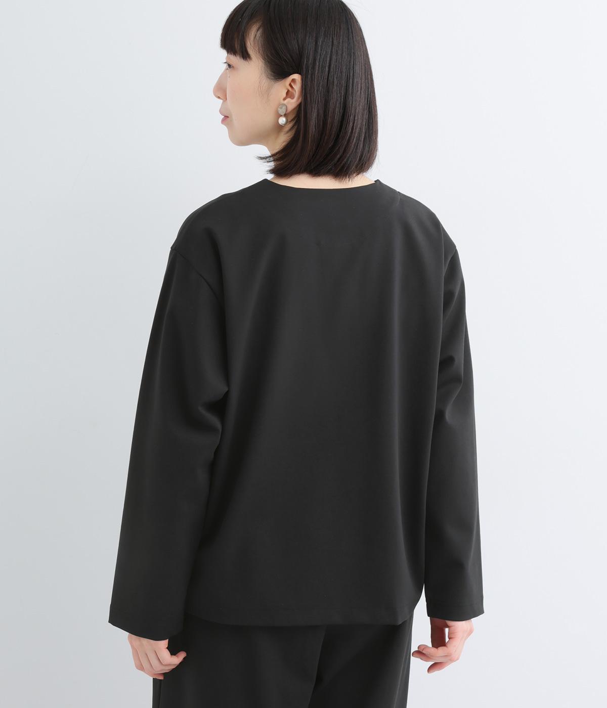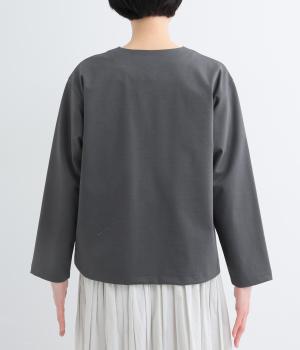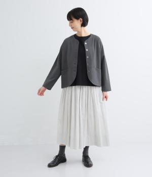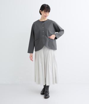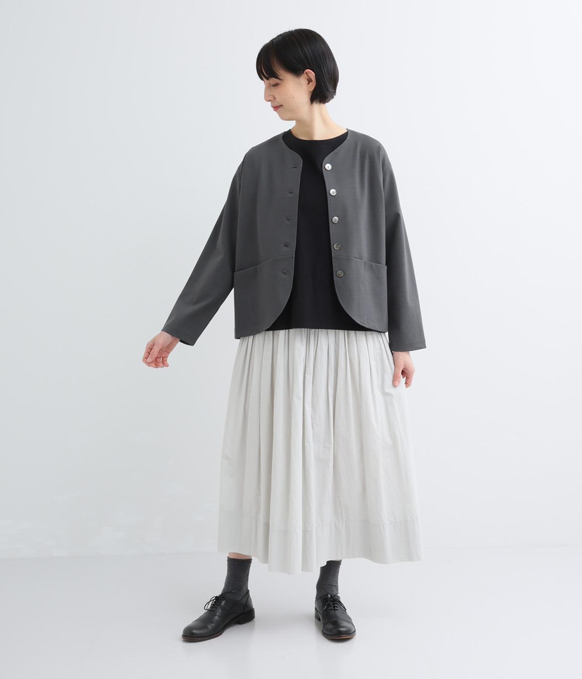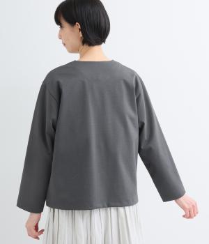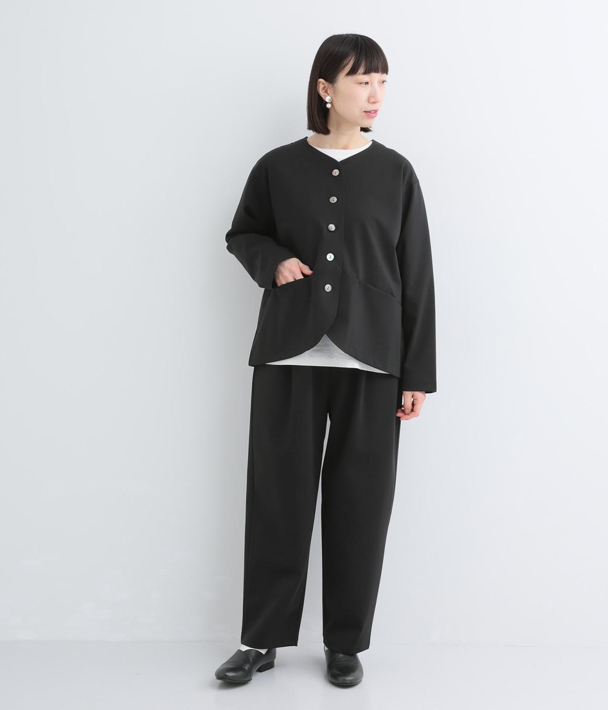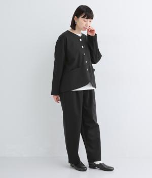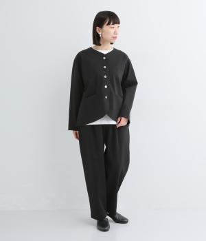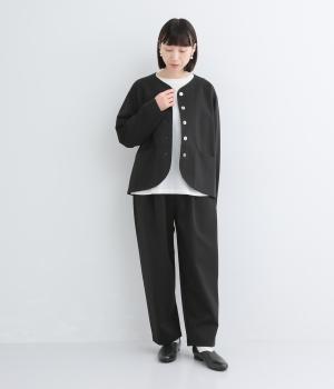 ストレッチの効いた、ほどよい厚みの混紡生地です。しなやかな落ち感でシワになりにくく、上品さと機能性を両立しました。リラックスした着心地ながらきちんと見えを叶えます。