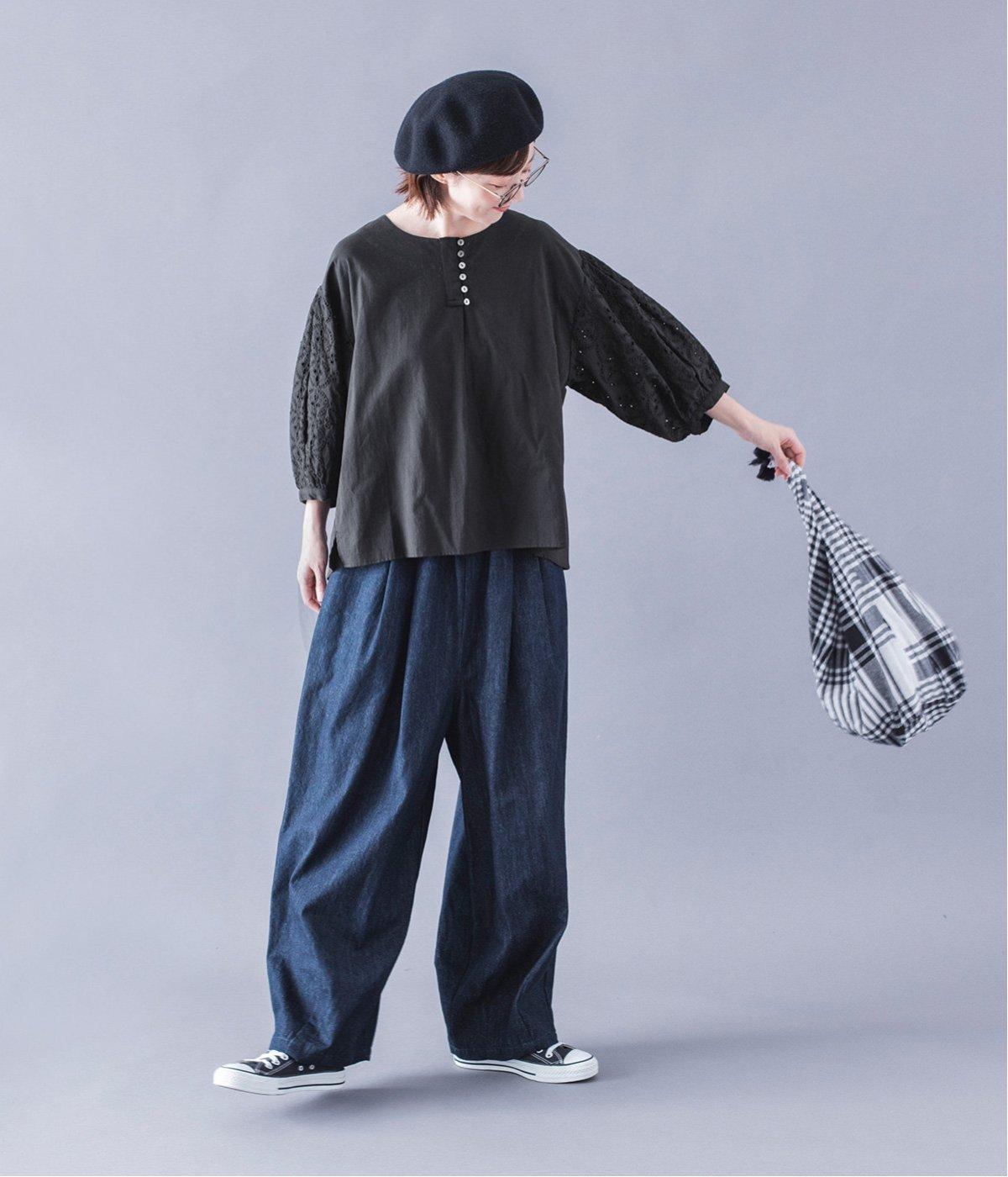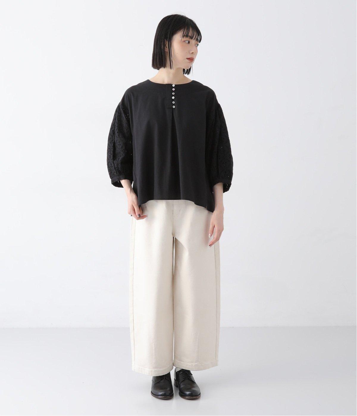模様を刺繍で縁取り、その内側を切り抜いて透かし模様をつくり出したカットワーク。ブラウスは袖に、パンツは裾にかけて贅沢にあしらいました。
