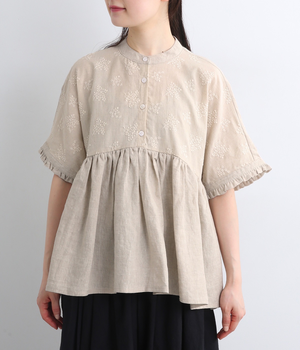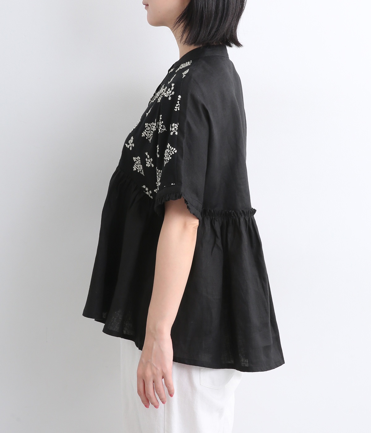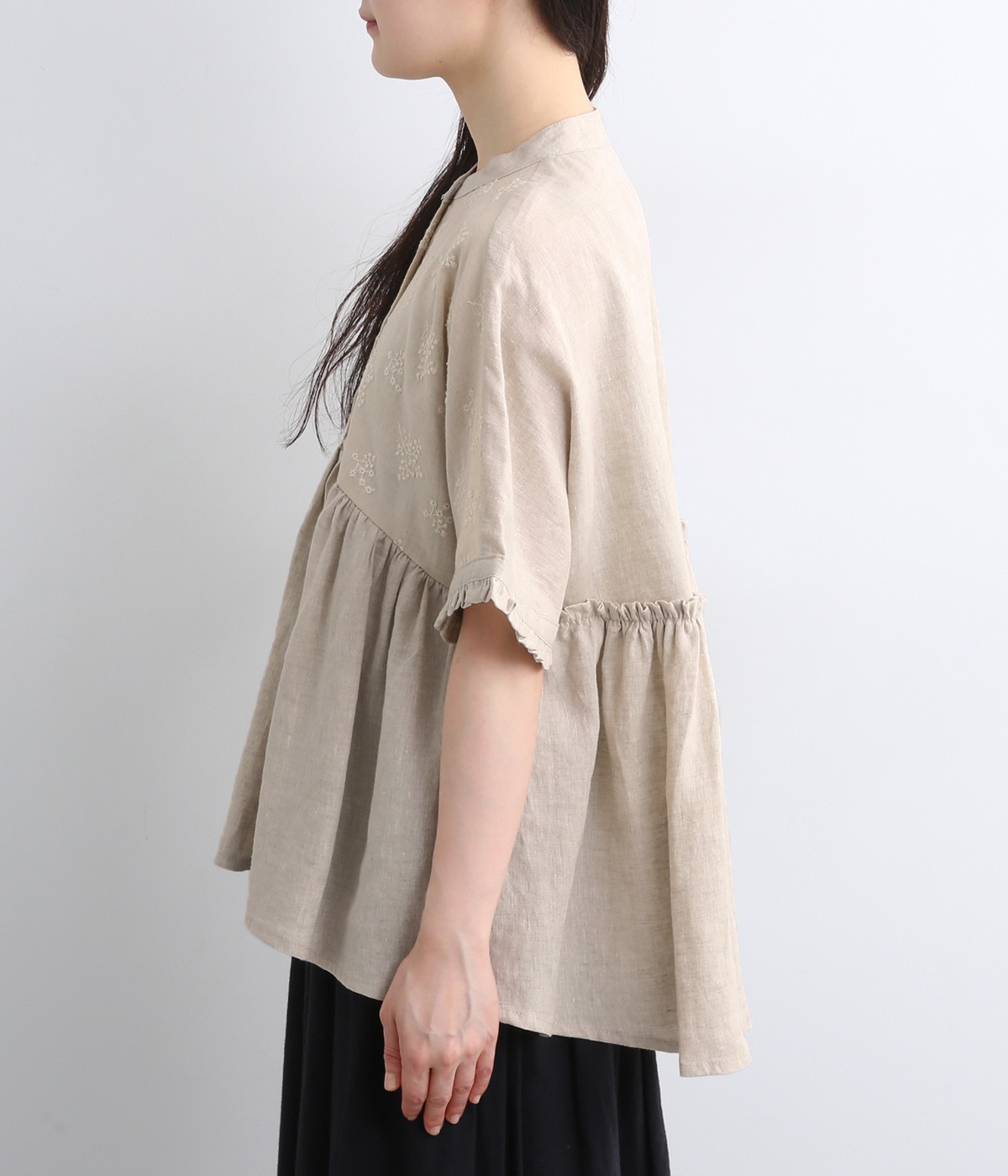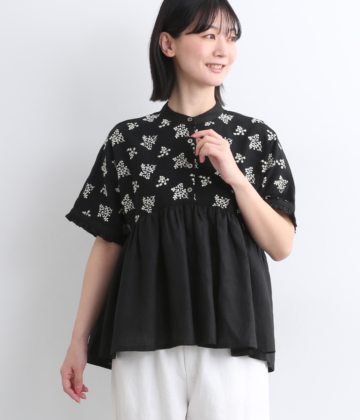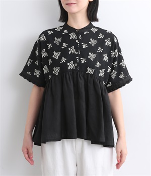 質感の絶妙なコントラストが楽しめるプルオーバー。トップには可憐な小花刺繍をあしらい、華やかなアクセントを添えました。袖口や背面のフリルがほんのり甘さをプラス。バスト下からやわらかなシルエットが広がり、女性らしい表情を引き立てます。