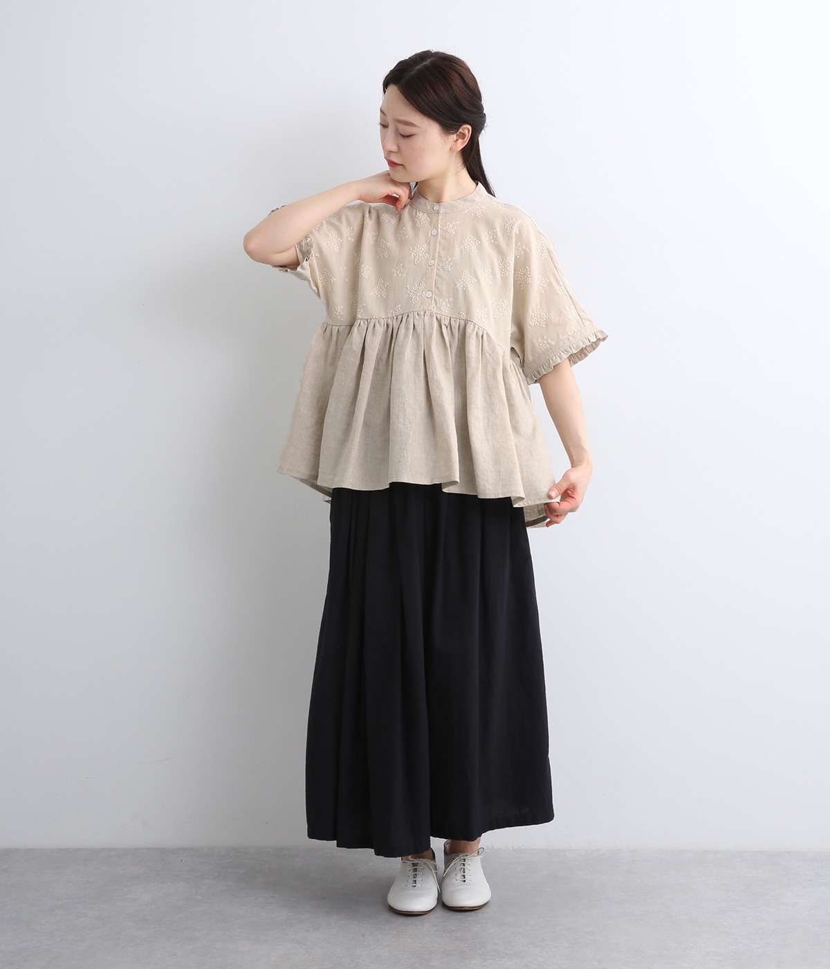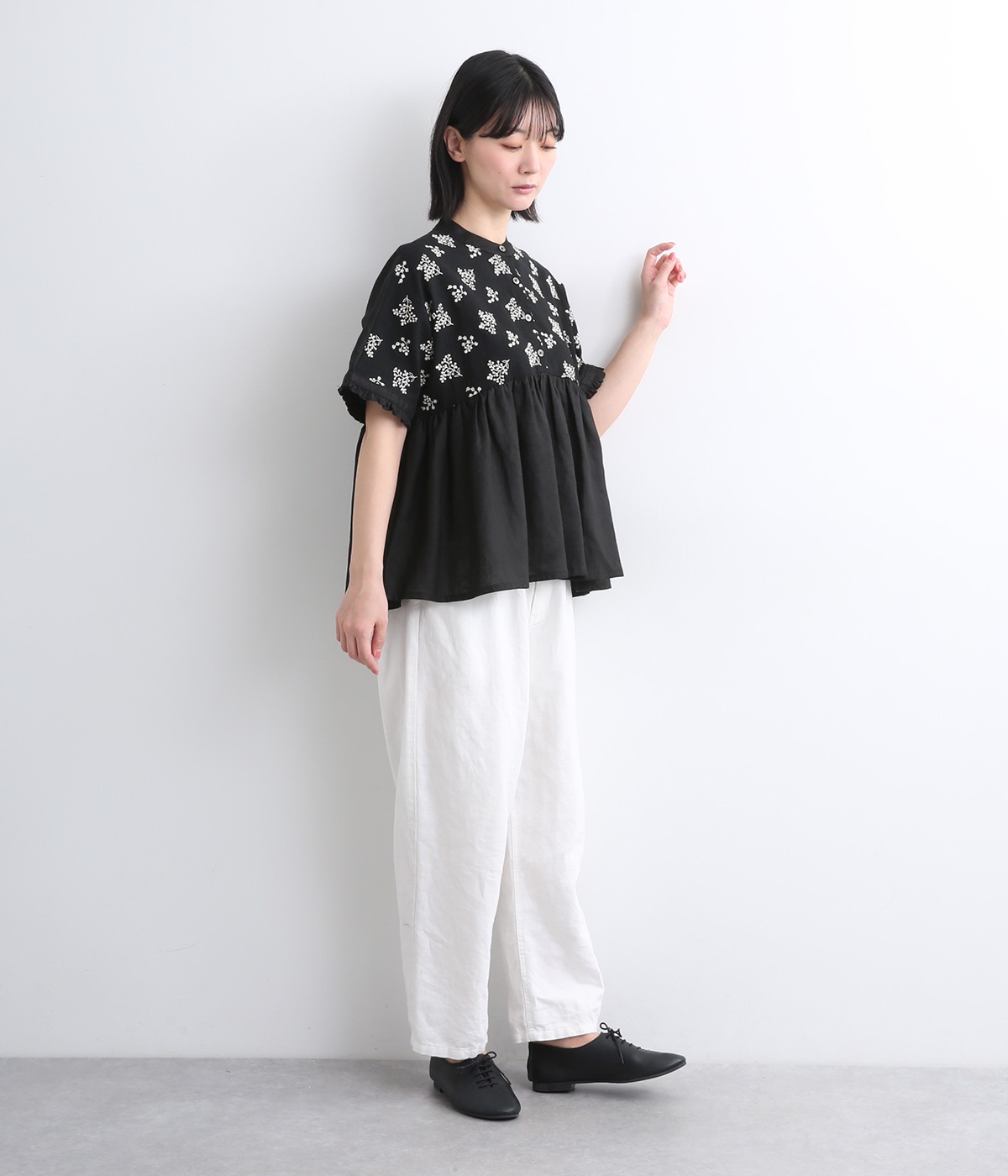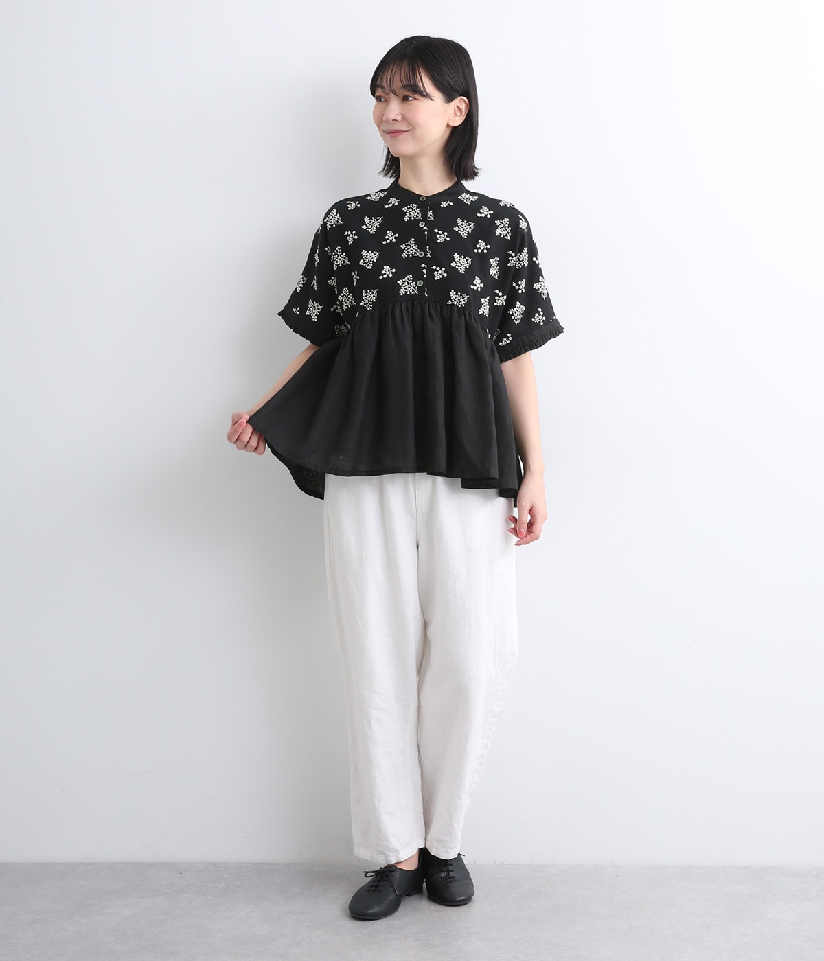 質感の絶妙なコントラストが楽しめるプルオーバー。トップには可憐な小花刺繍をあしらい、華やかなアクセントを添えました。袖口や背面のフリルがほんのり甘さをプラス。バスト下からやわらかなシルエットが広がり、女性らしい表情を引き立てます。