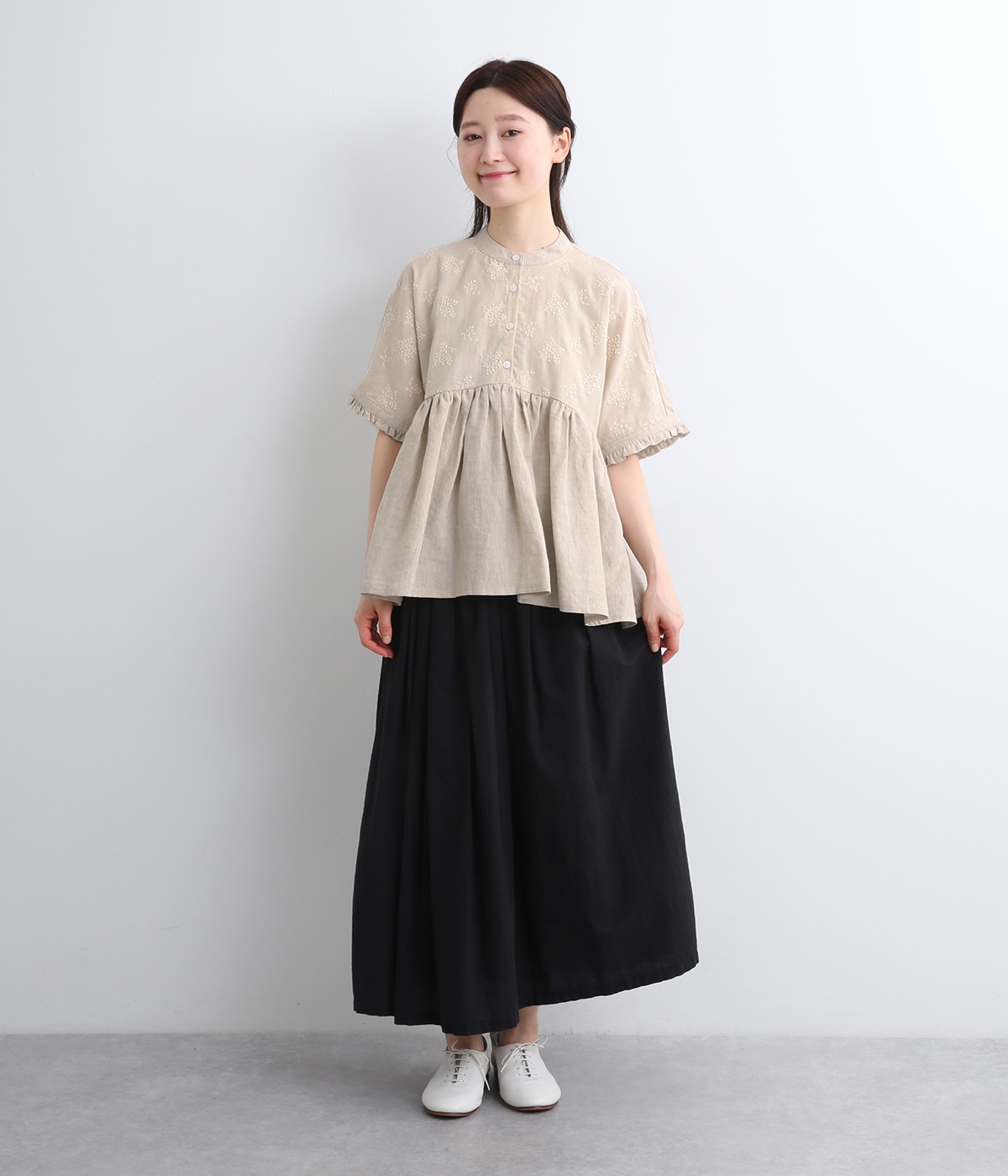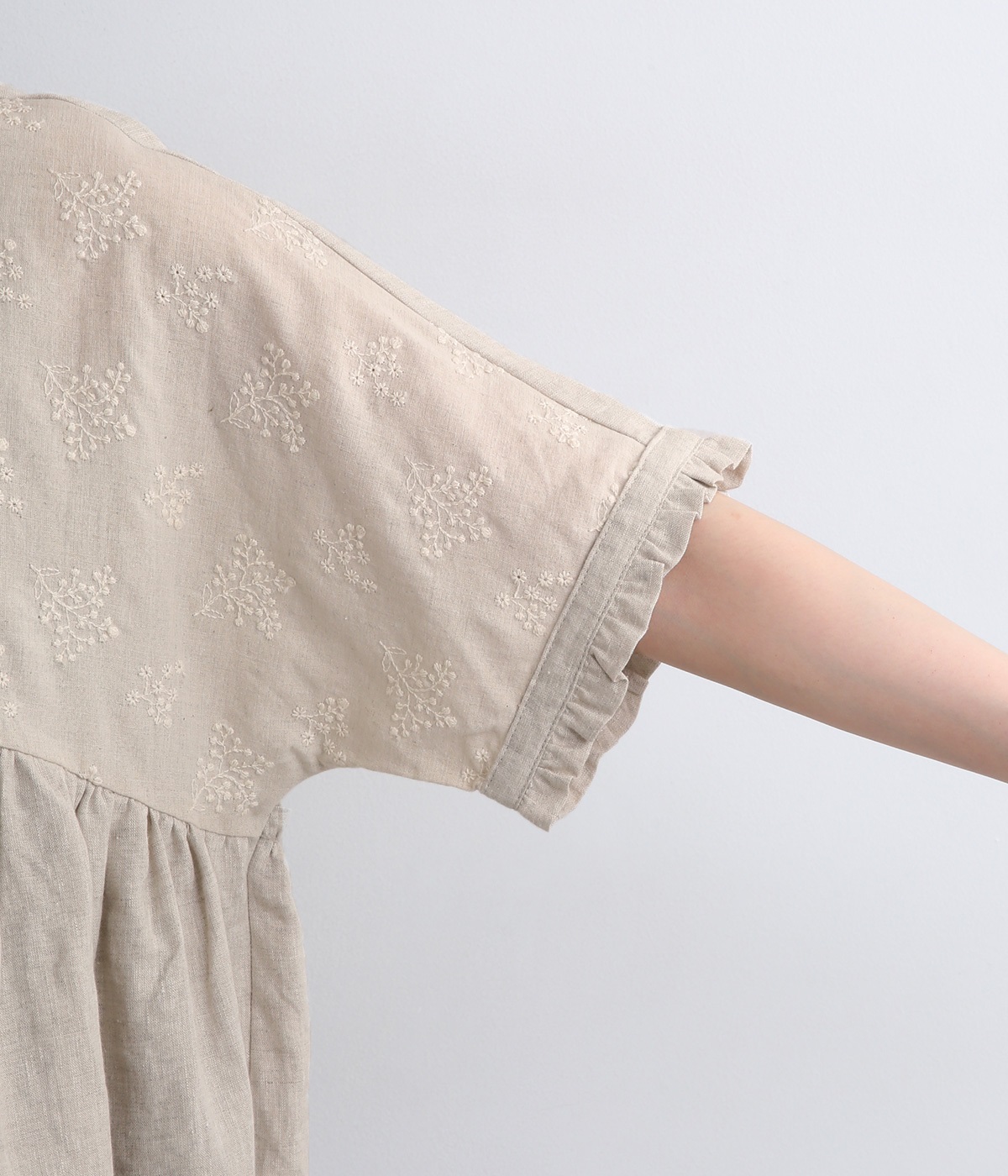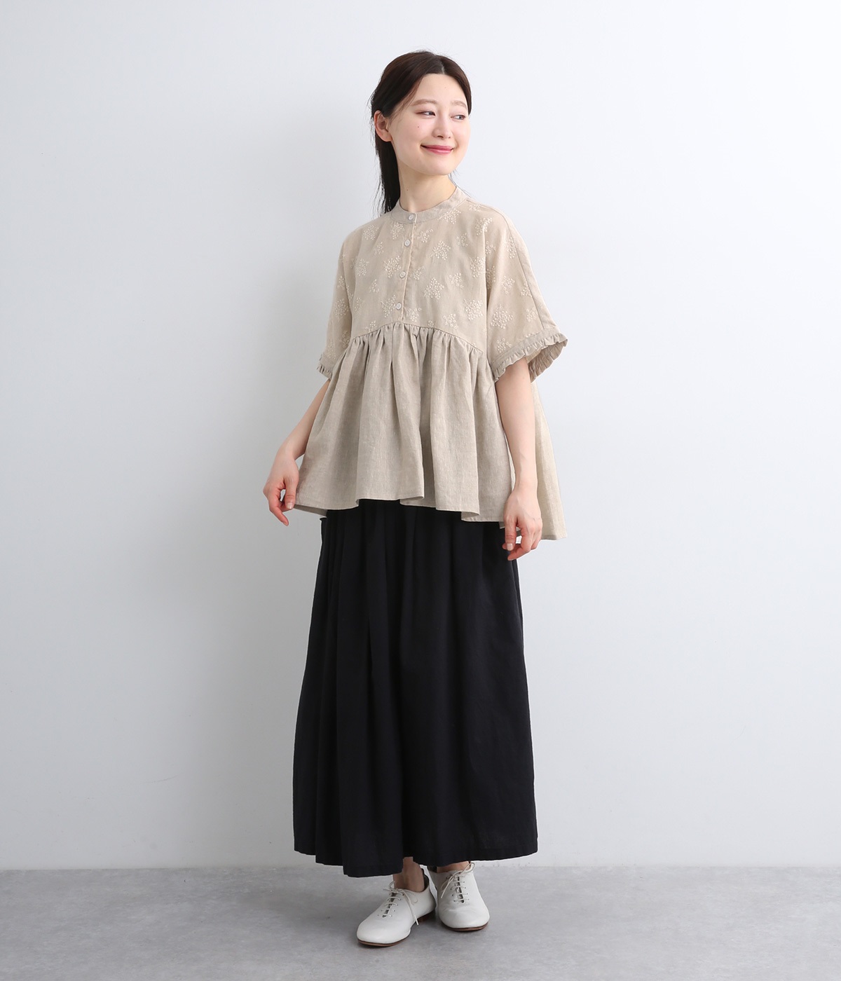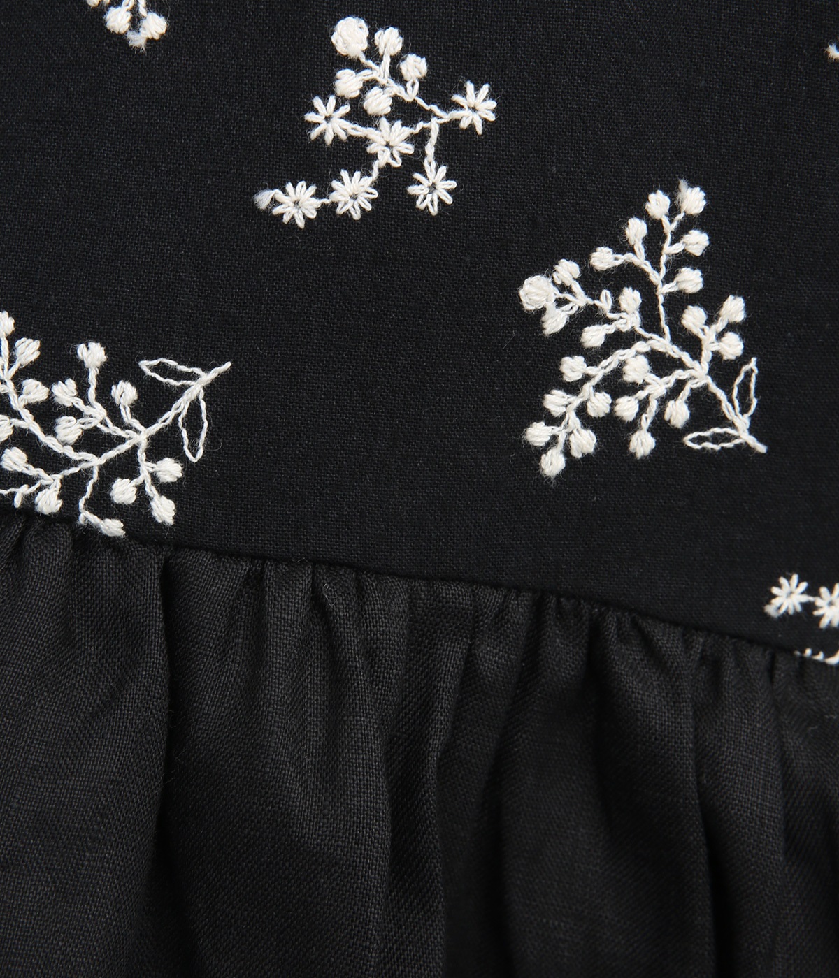 質感の絶妙なコントラストが楽しめるプルオーバー。トップには可憐な小花刺繍をあしらい、華やかなアクセントを添えました。袖口や背面のフリルがほんのり甘さをプラス。バスト下からやわらかなシルエットが広がり、女性らしい表情を引き立てます。