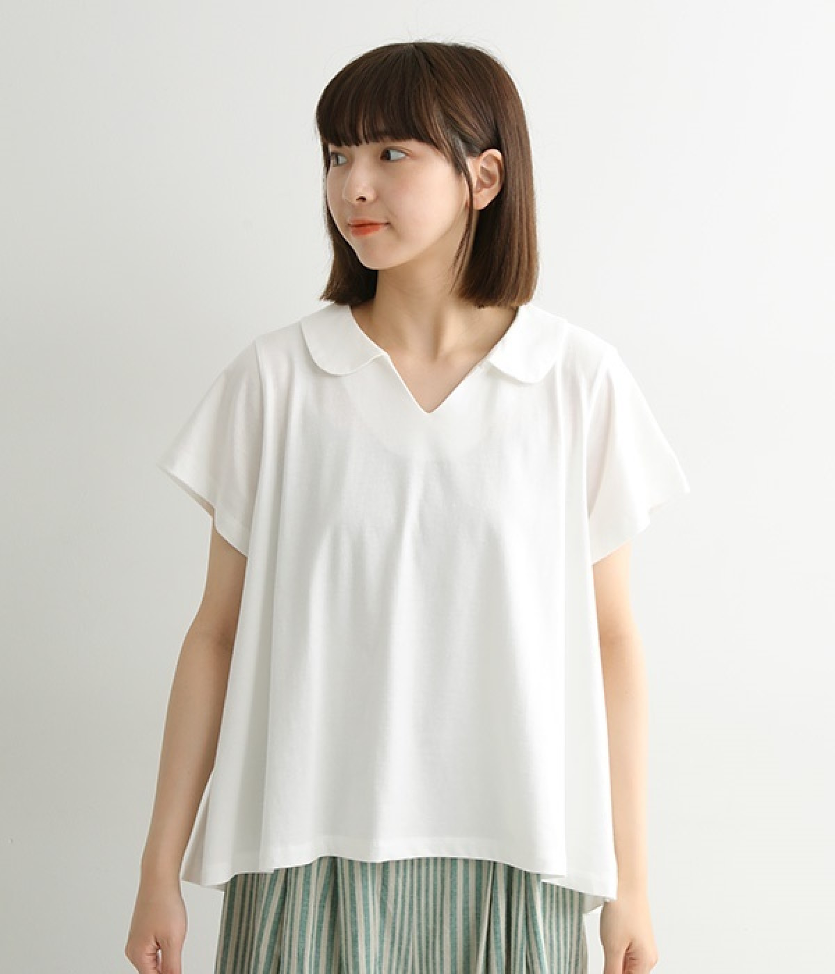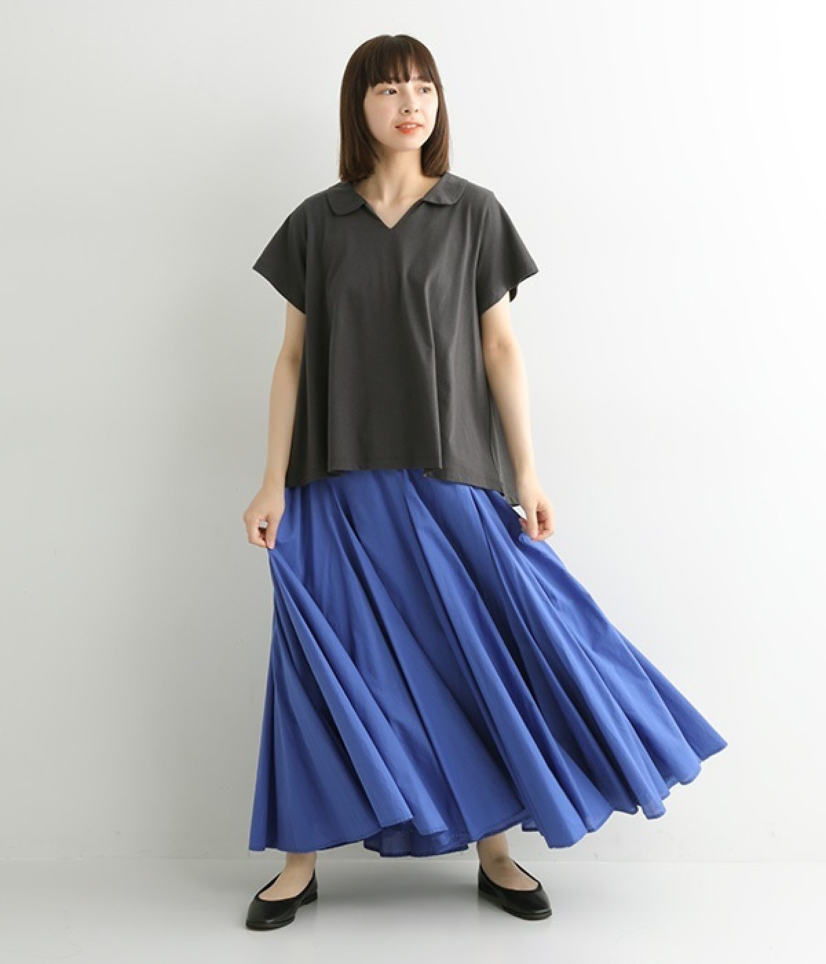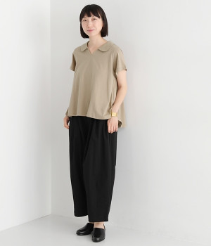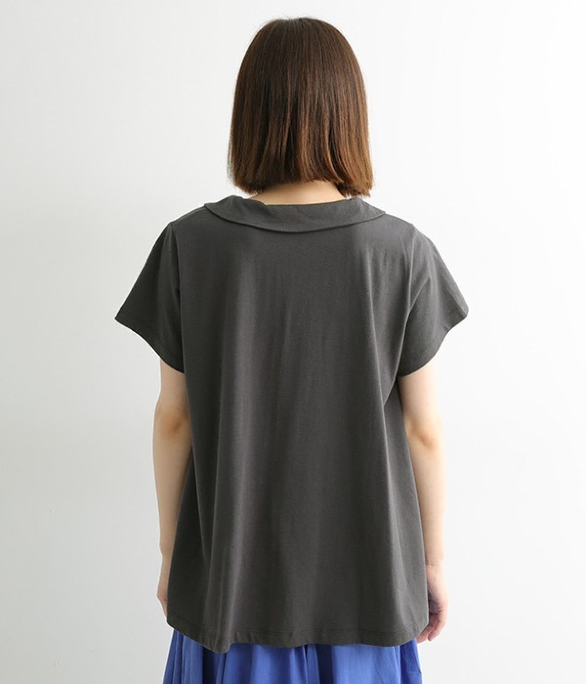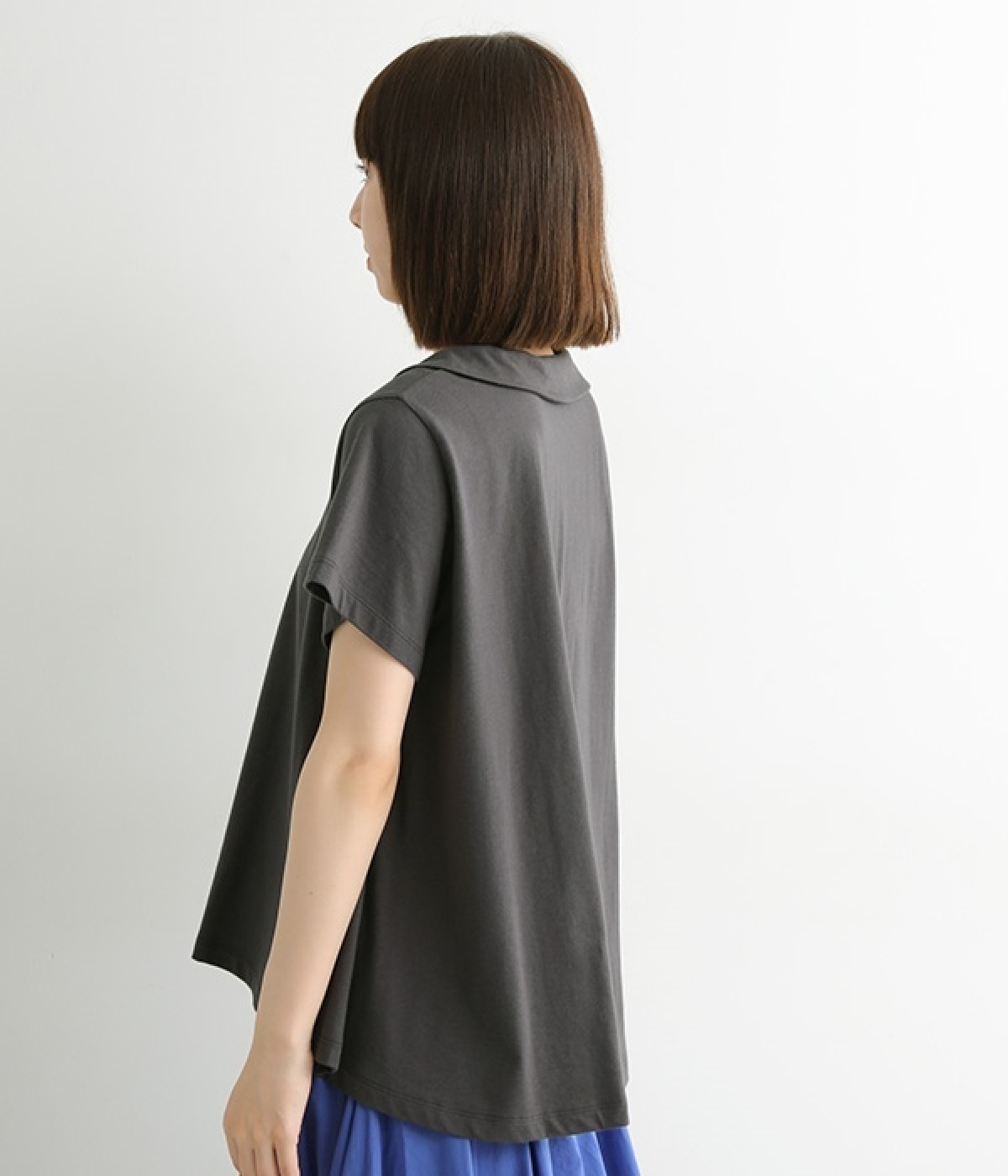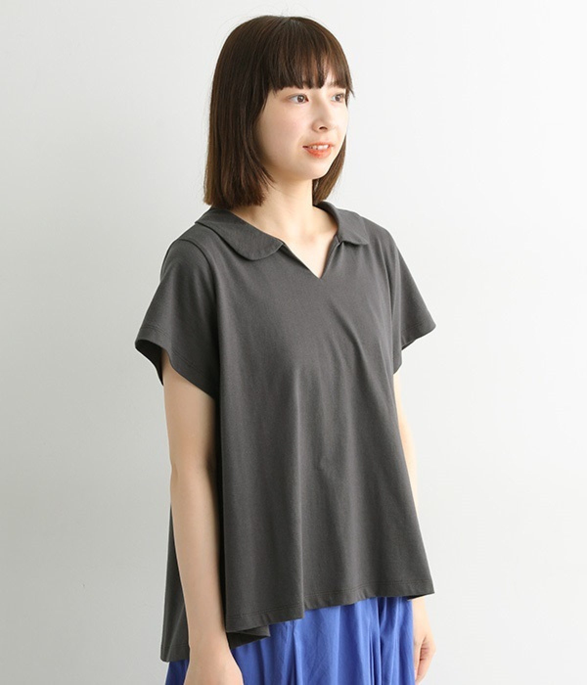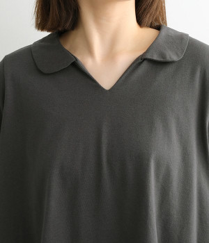 やわらかくなめらかなタッチの天竺コットンを使用したプルオーバーです。丸襟のやさしい雰囲気とふわりと広がるAラインが、大人のさりげないかわいらしさを演出します。ほどよい開きのネックラインはインナーを少しのぞかせても◎。なだらかな裾ラインは前後差が付いており、ギャザーの入ったスカートやパンツとゆるっと合わせても素敵です。シンプルで品のいいコンパクトなシルエットで、カジュアルにもきれいめにも対応できます。