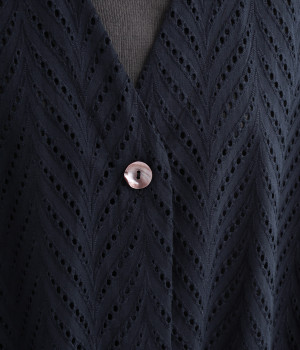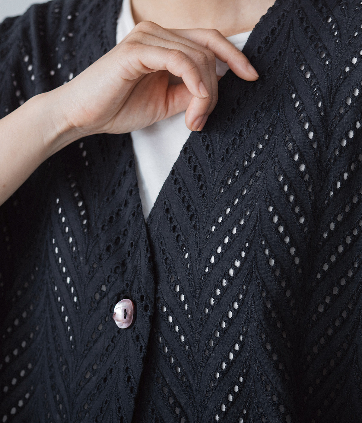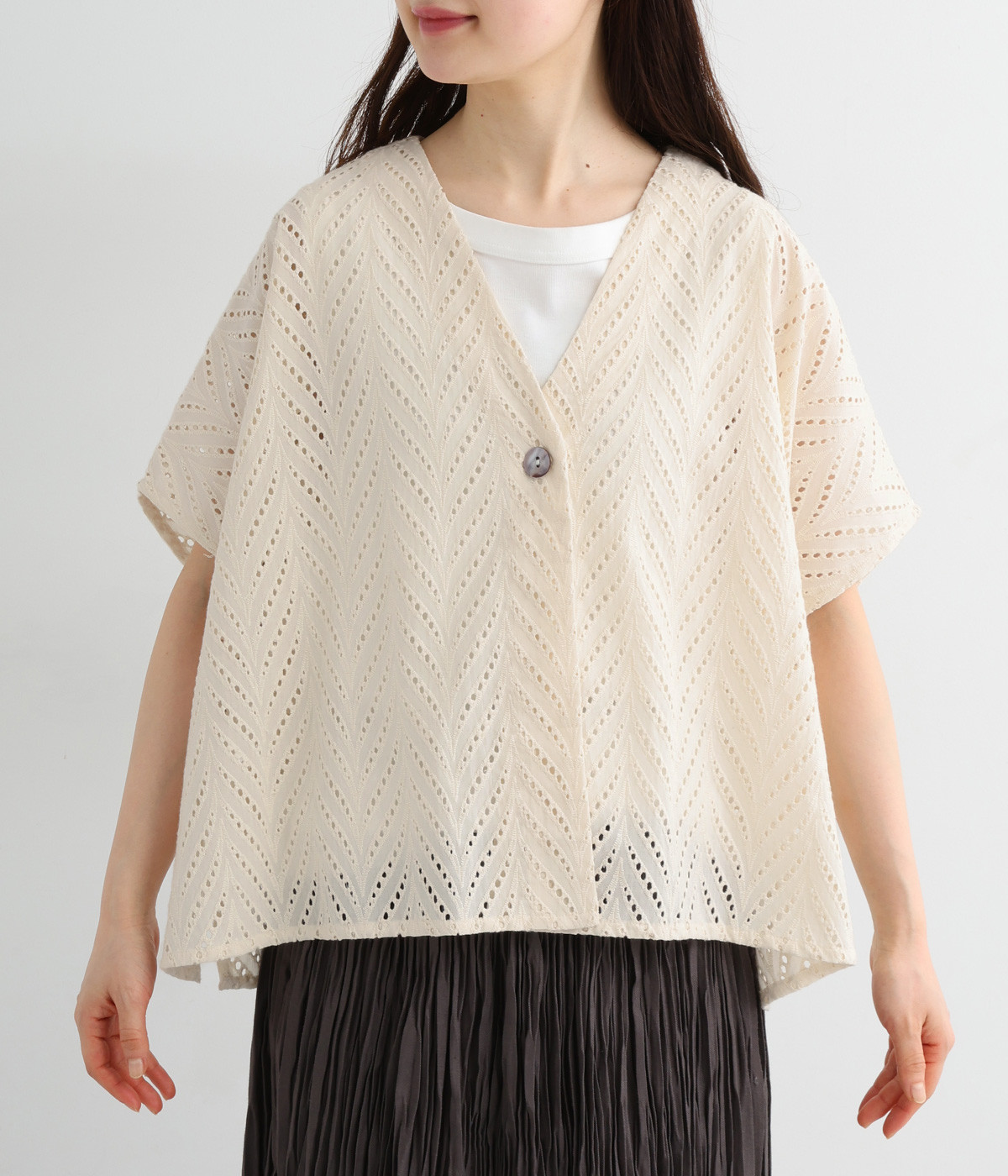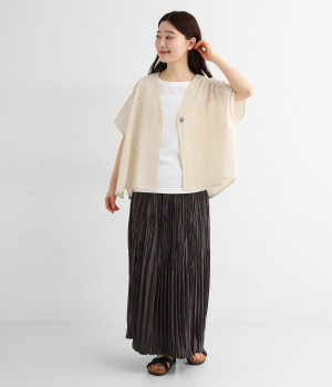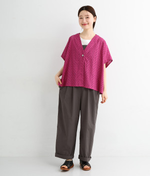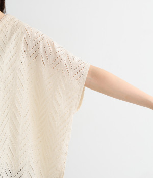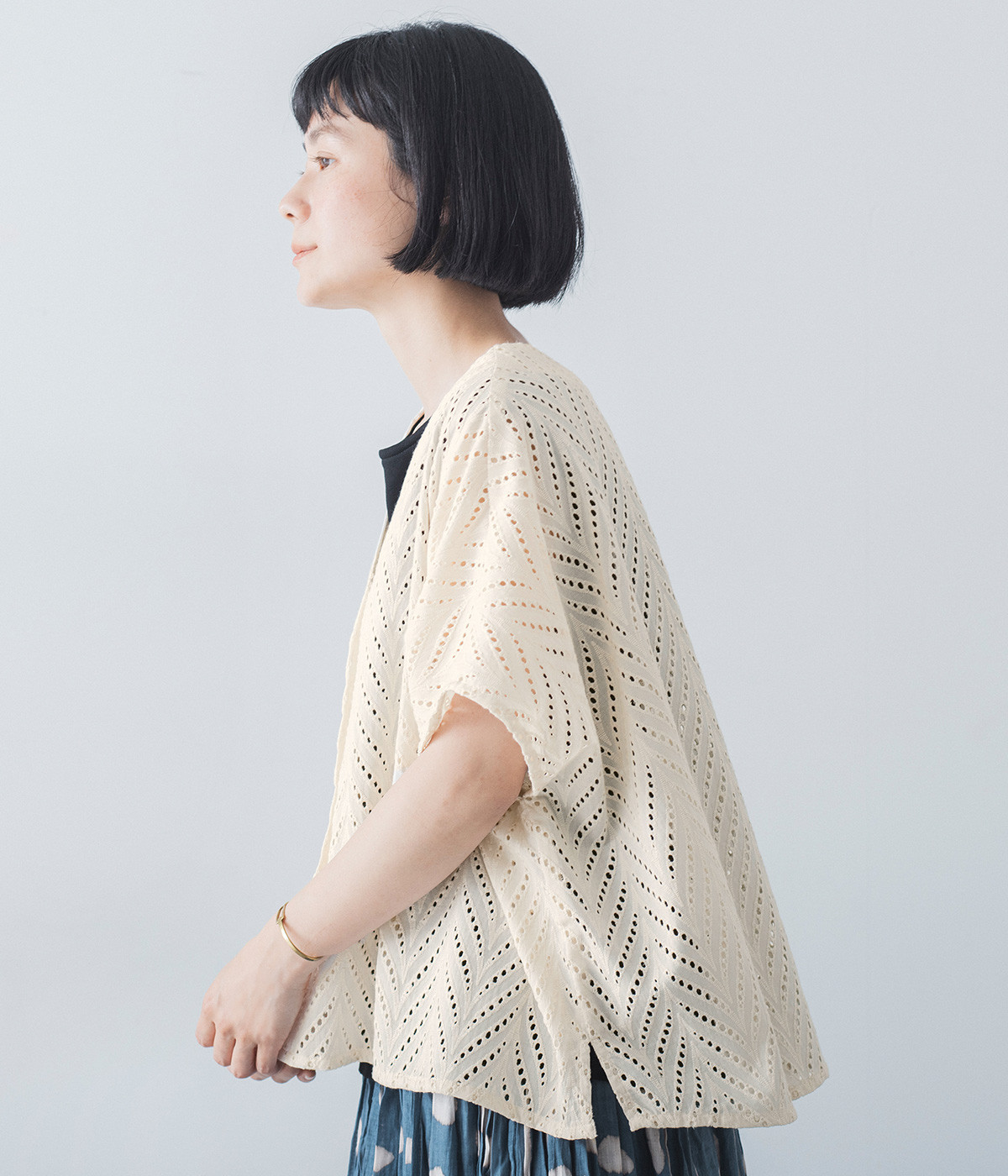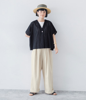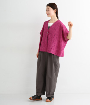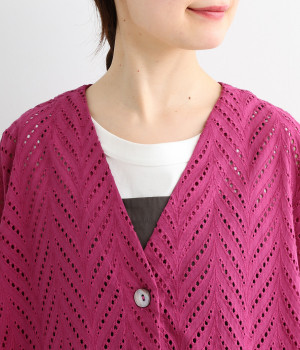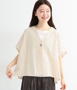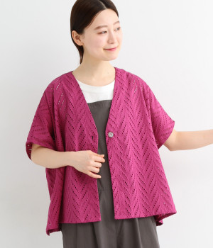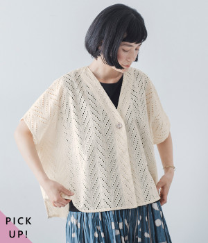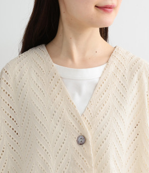 ノースリーブなど肩周りが心もとないときや冷房対策用に重宝する羽織り。葉っぱのような透かし編みレース模様は、明度が高いインナーを合わせるとまるで木漏れ日のような清々しさを感じられます。ひとつボタンなのでサッと羽織ったり前を開けてきたりの動作はとてもスムーズ。身幅にもたっぷりとゆとりがあるので、地厚なトップやワンピースを合わせやすいのも特徴です。