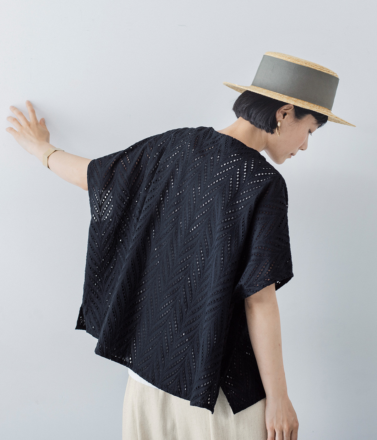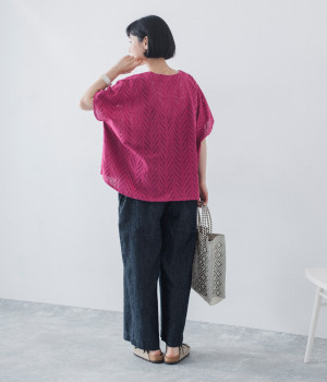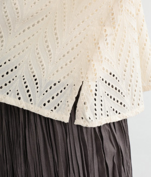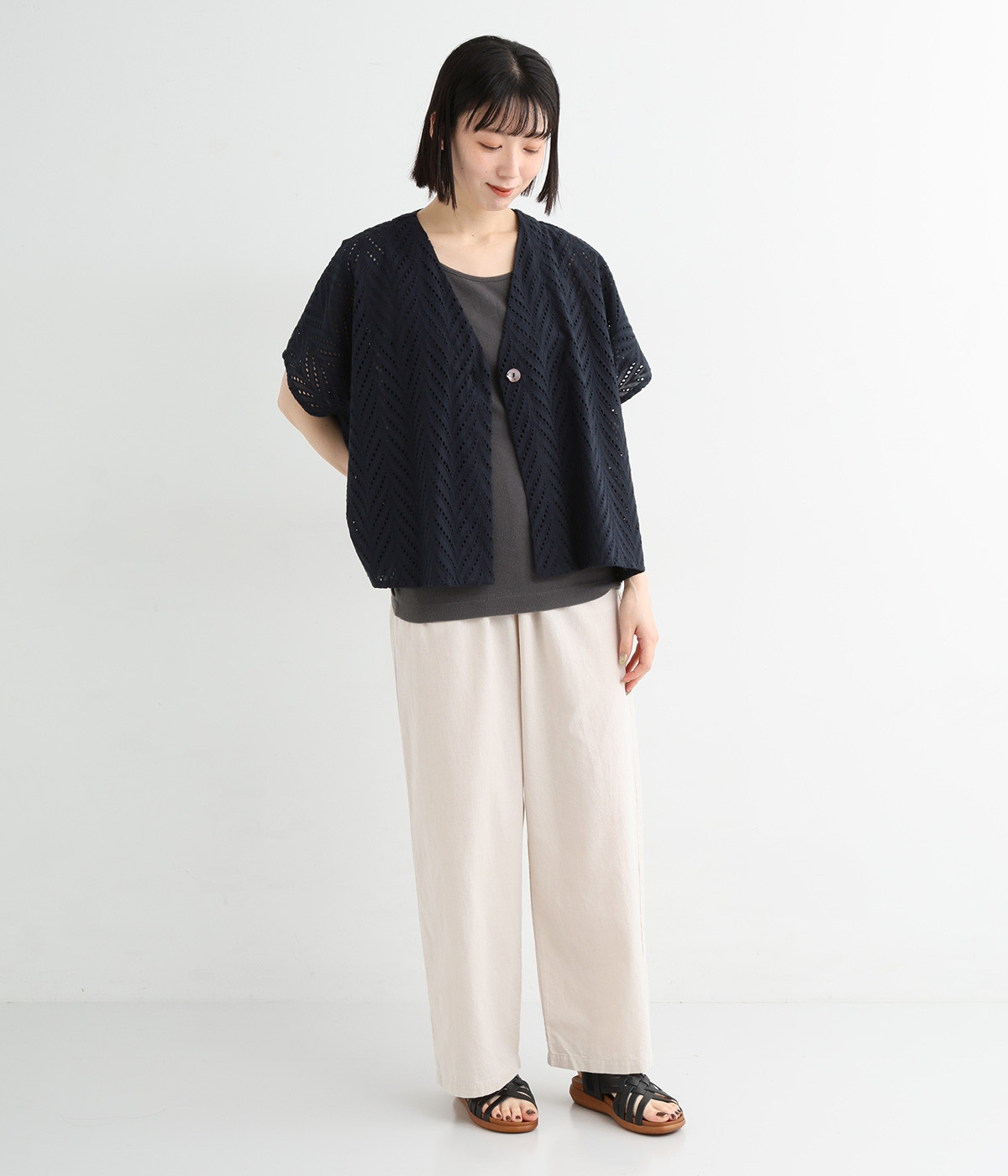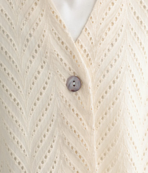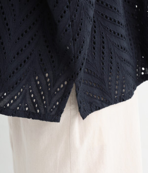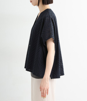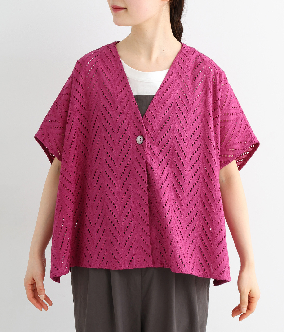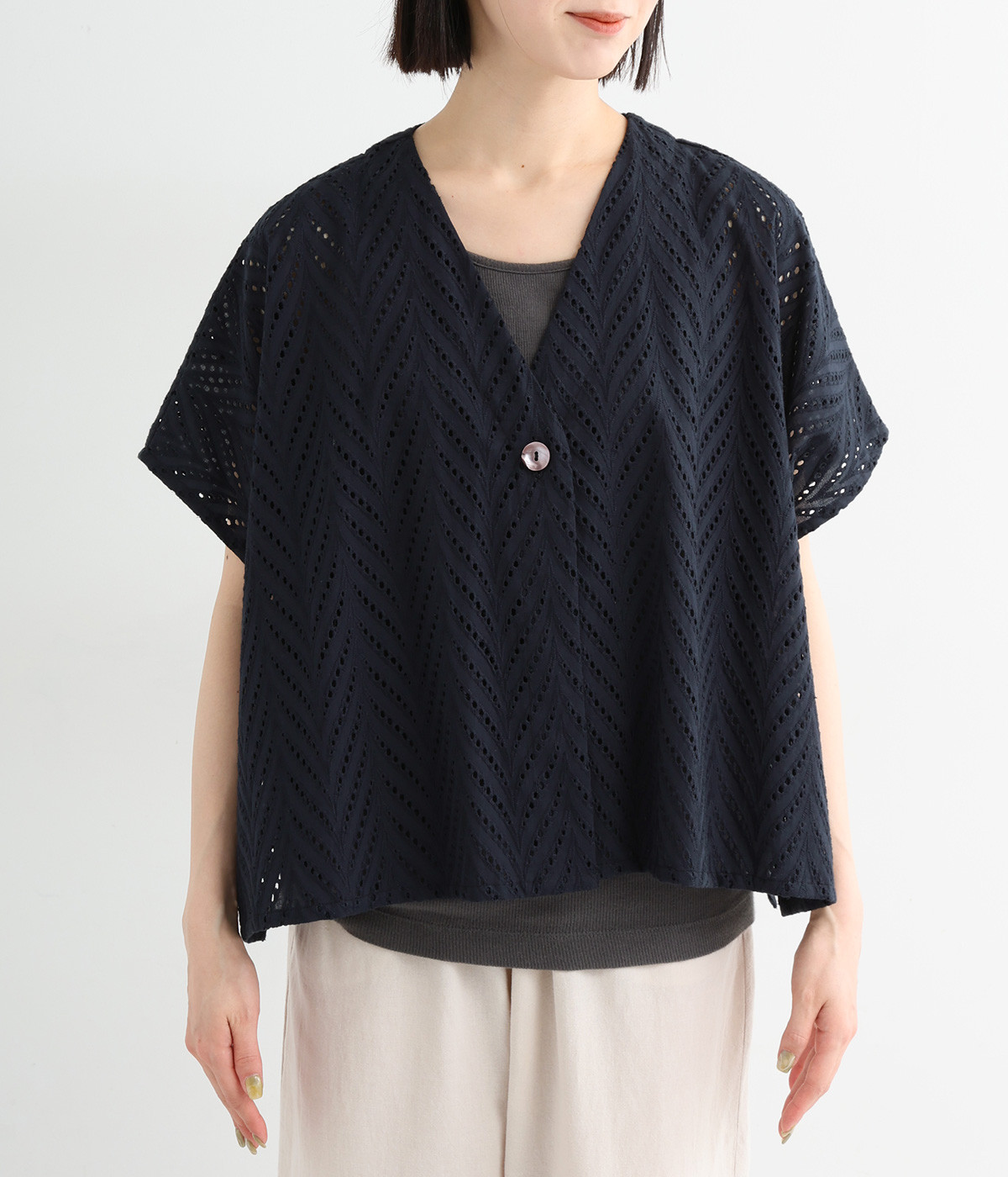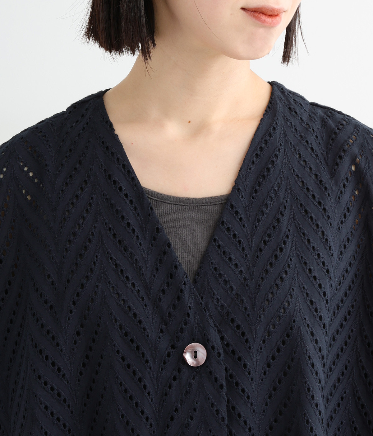 ノースリーブなど肩周りが心もとないときや冷房対策用に重宝する羽織り。葉っぱのような透かし編みレース模様は、明度が高いインナーを合わせるとまるで木漏れ日のような清々しさを感じられます。ひとつボタンなのでサッと羽織ったり前を開けてきたりの動作はとてもスムーズ。身幅にもたっぷりとゆとりがあるので、地厚なトップやワンピースを合わせやすいのも特徴です。