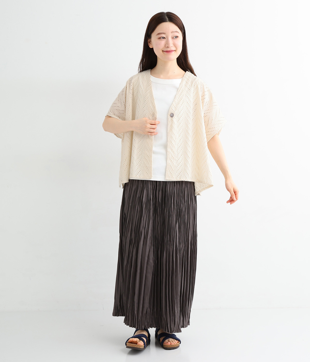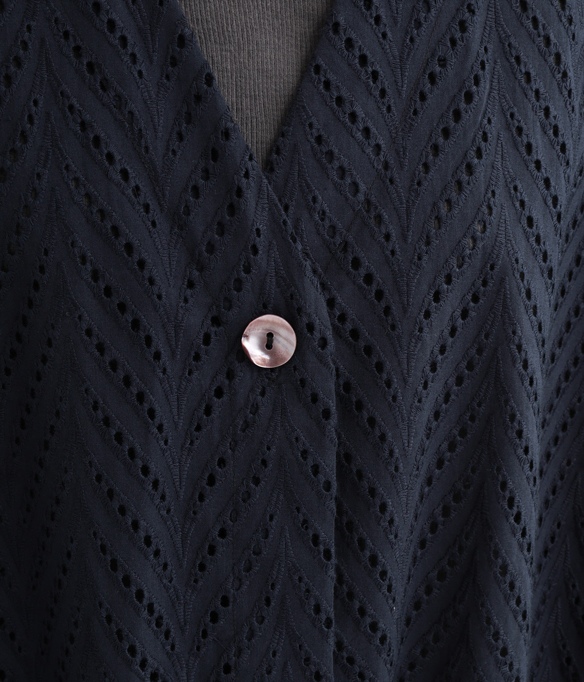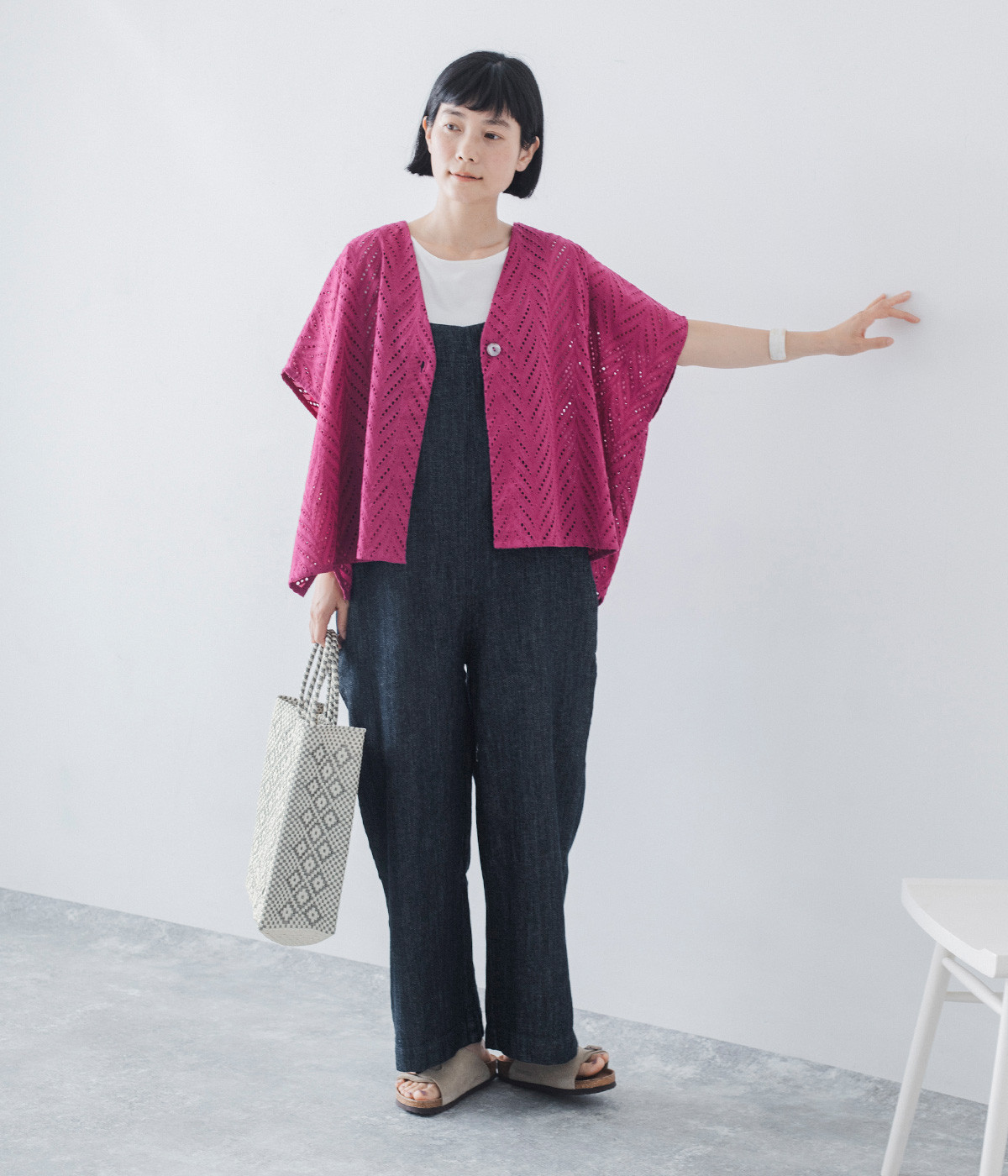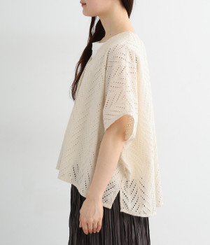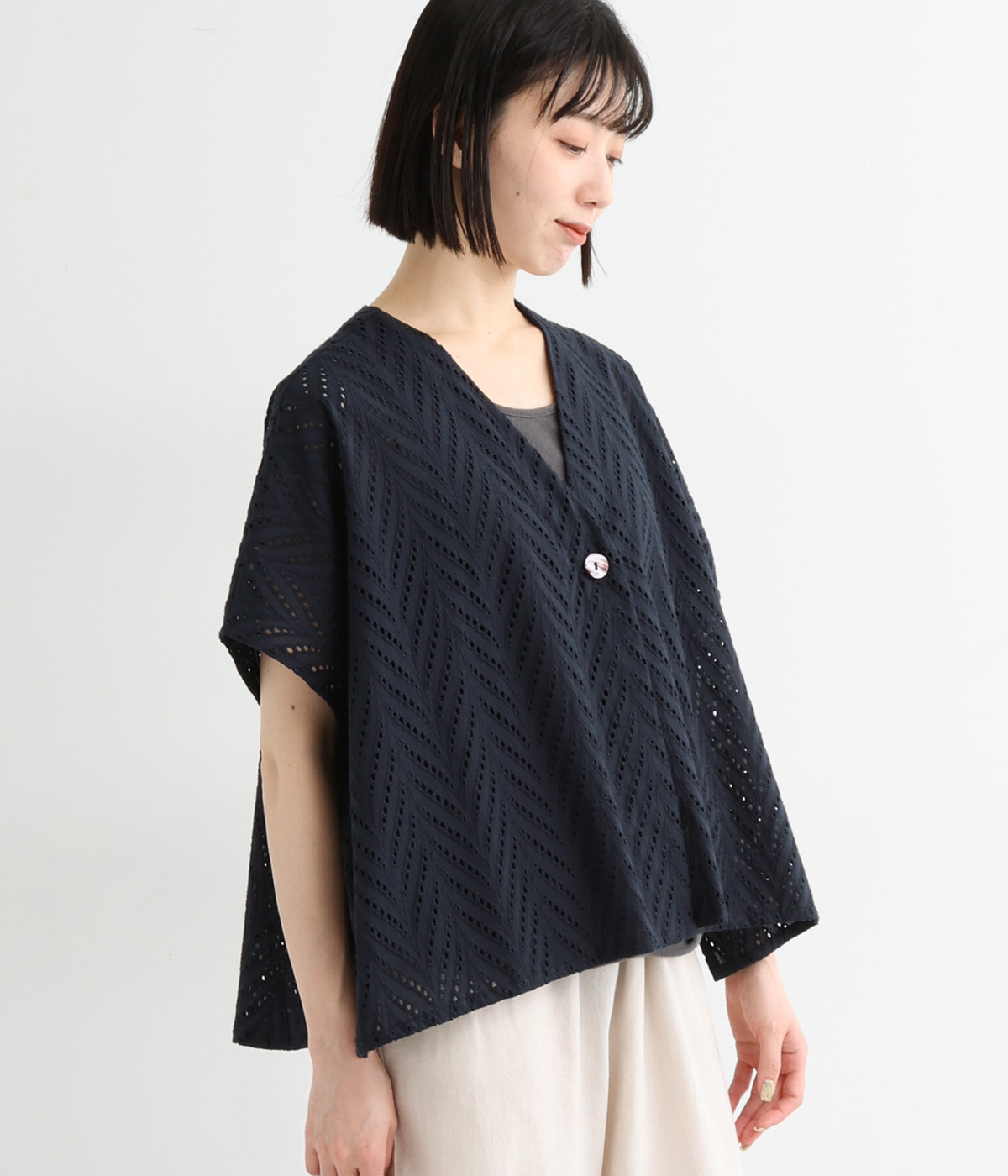 ノースリーブなど肩周りが心もとないときや冷房対策用に重宝する羽織り。葉っぱのような透かし編みレース模様は、明度が高いインナーを合わせるとまるで木漏れ日のような清々しさを感じられます。ひとつボタンなのでサッと羽織ったり前を開けてきたりの動作はとてもスムーズ。身幅にもたっぷりとゆとりがあるので、地厚なトップやワンピースを合わせやすいのも特徴です。