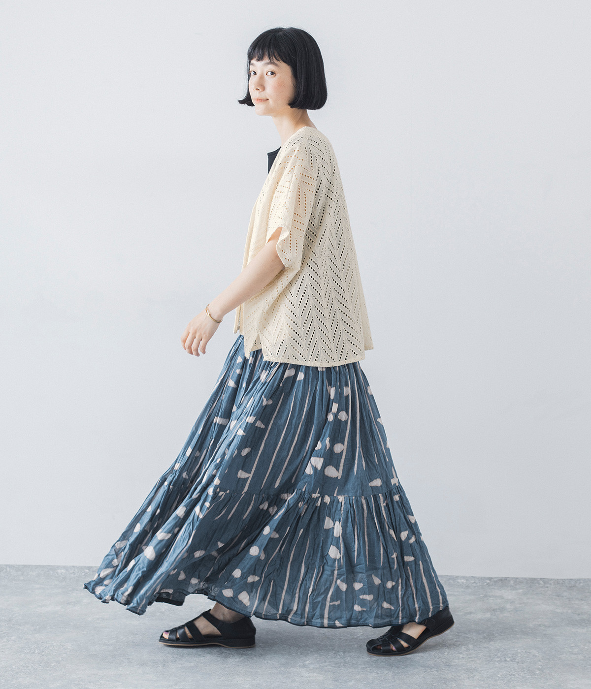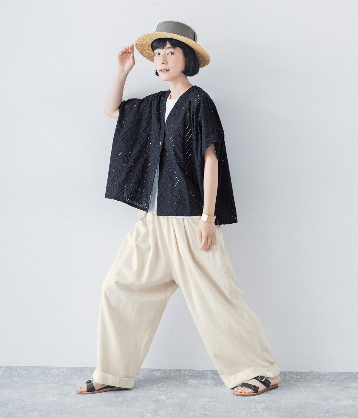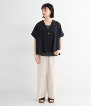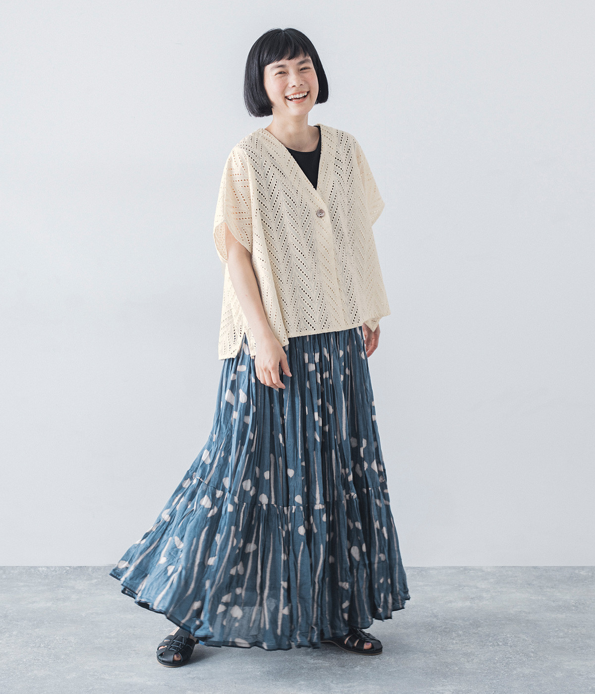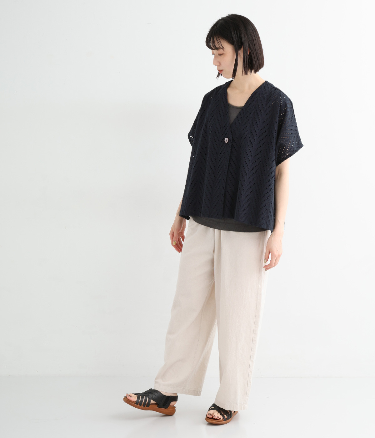 ノースリーブなど肩周りが心もとないときや冷房対策用に重宝する羽織り。葉っぱのような透かし編みレース模様は、明度が高いインナーを合わせるとまるで木漏れ日のような清々しさを感じられます。ひとつボタンなのでサッと羽織ったり前を開けてきたりの動作はとてもスムーズ。身幅にもたっぷりとゆとりがあるので、地厚なトップやワンピースを合わせやすいのも特徴です。