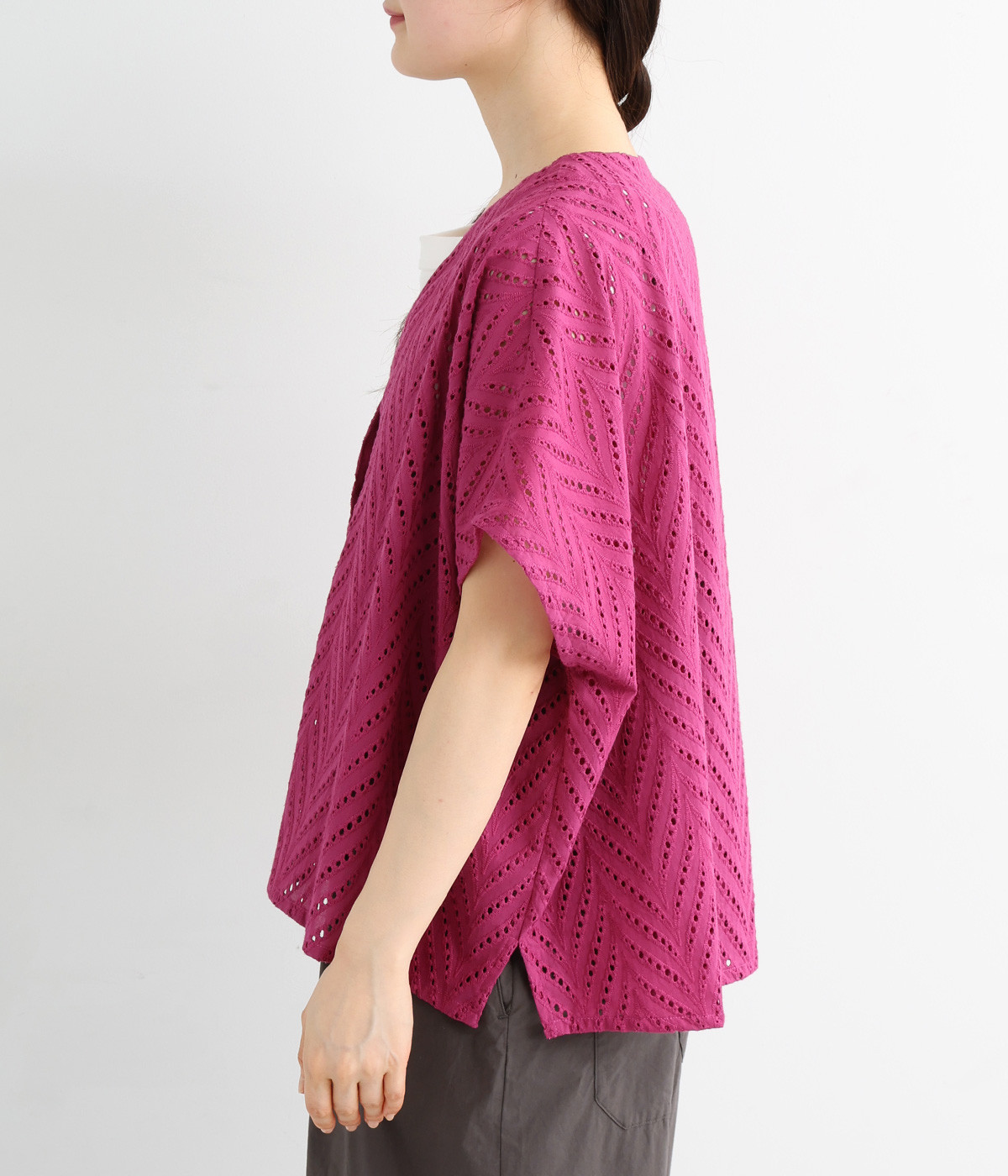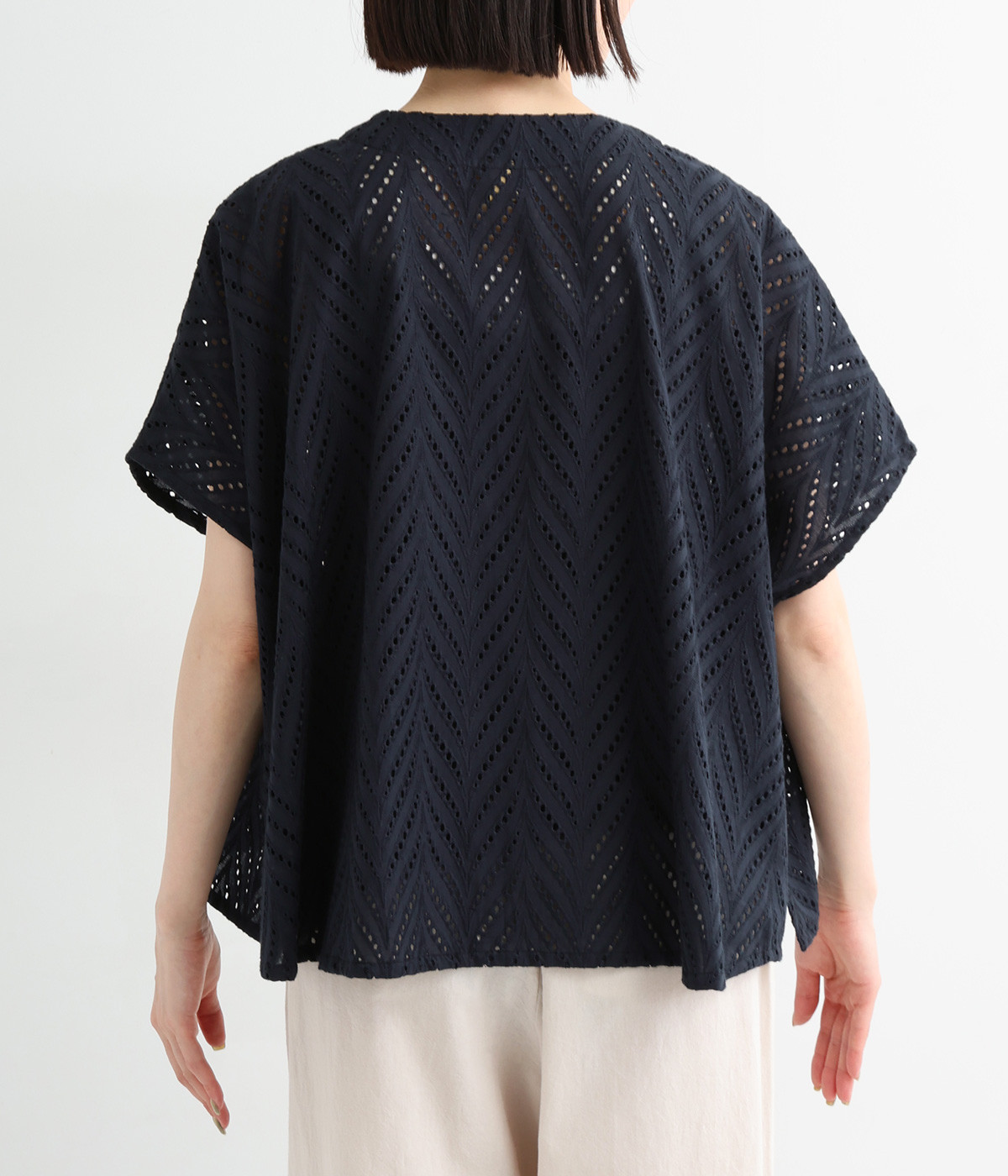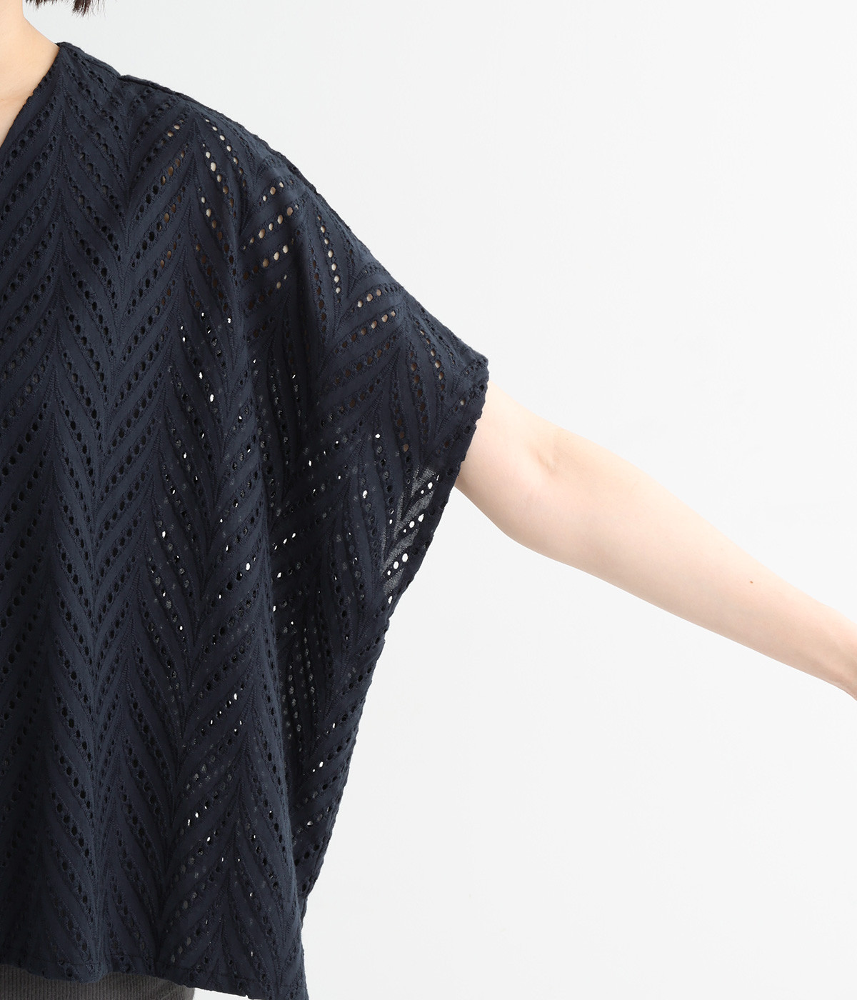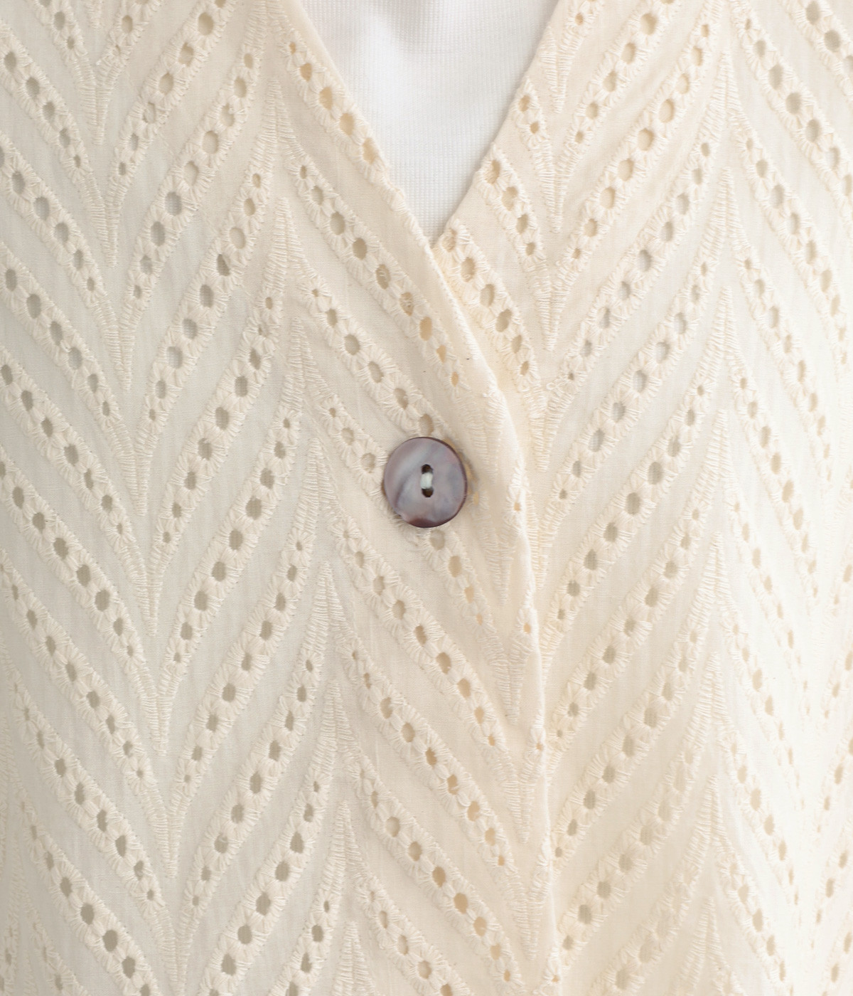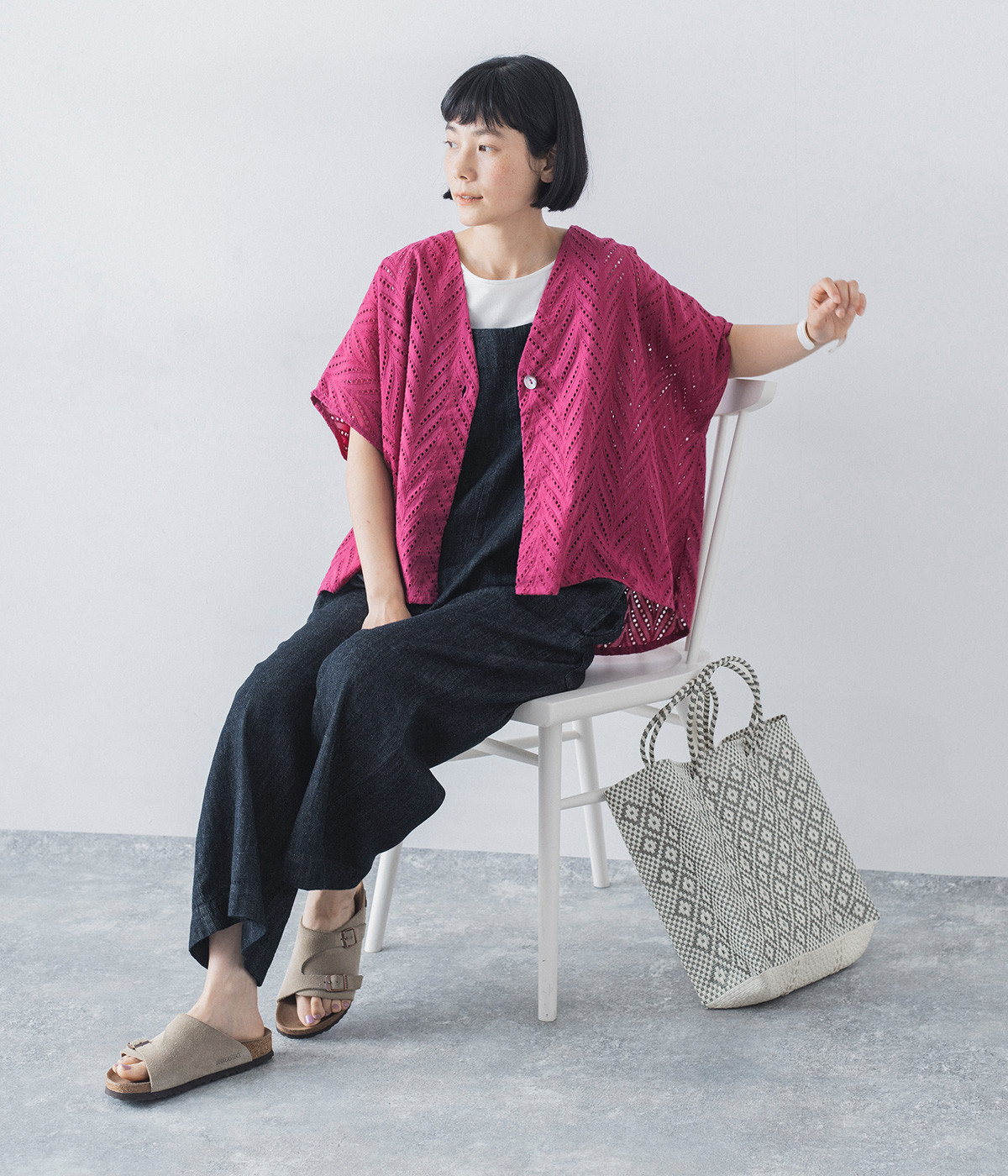 ノースリーブなど肩周りが心もとないときや冷房対策用に重宝する羽織り。葉っぱのような透かし編みレース模様は、明度が高いインナーを合わせるとまるで木漏れ日のような清々しさを感じられます。ひとつボタンなのでサッと羽織ったり前を開けてきたりの動作はとてもスムーズ。身幅にもたっぷりとゆとりがあるので、地厚なトップやワンピースを合わせやすいのも特徴です。