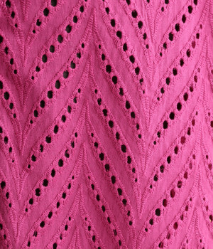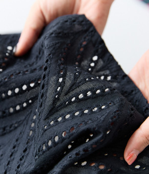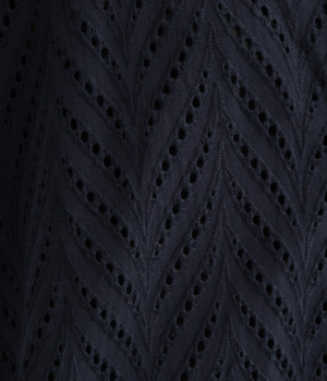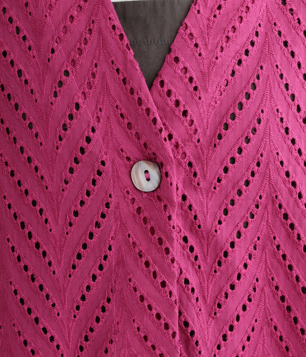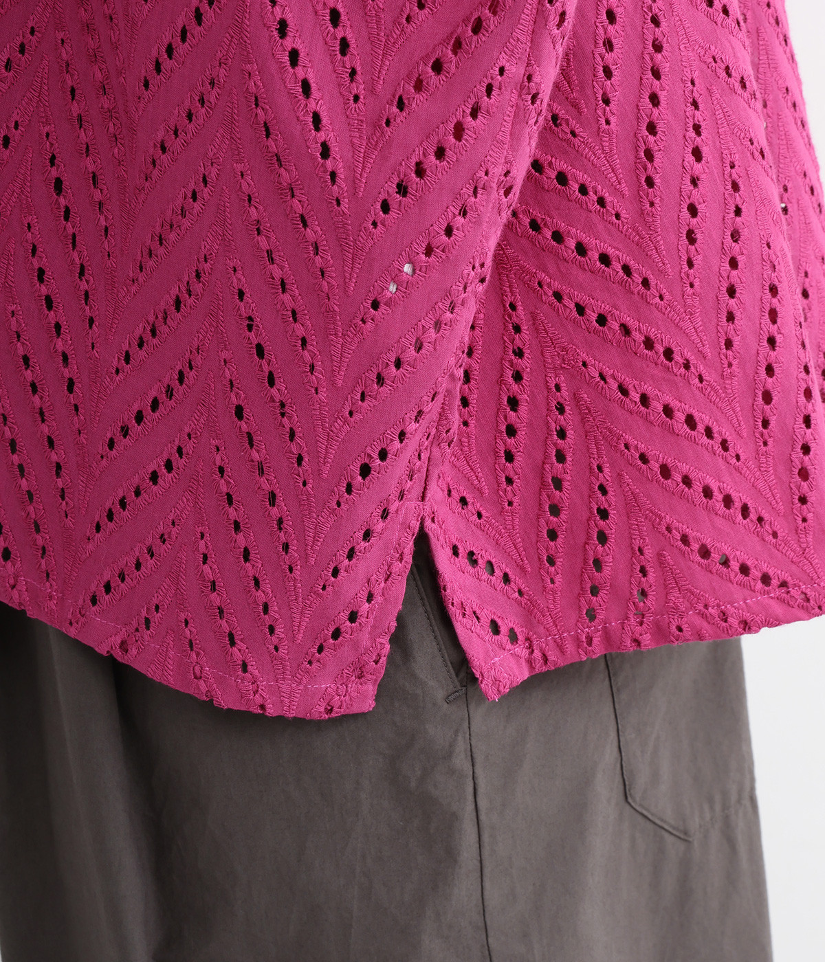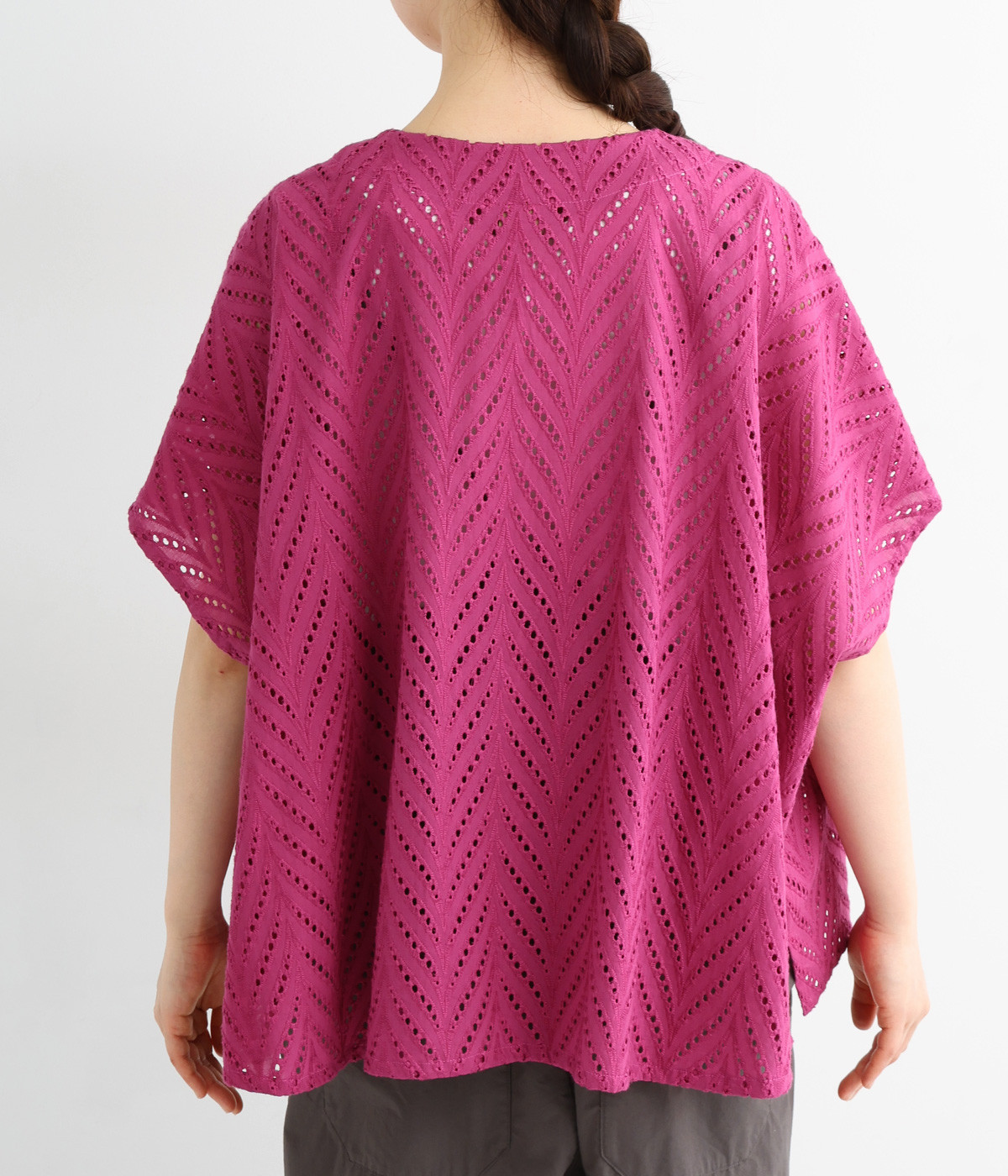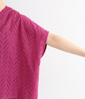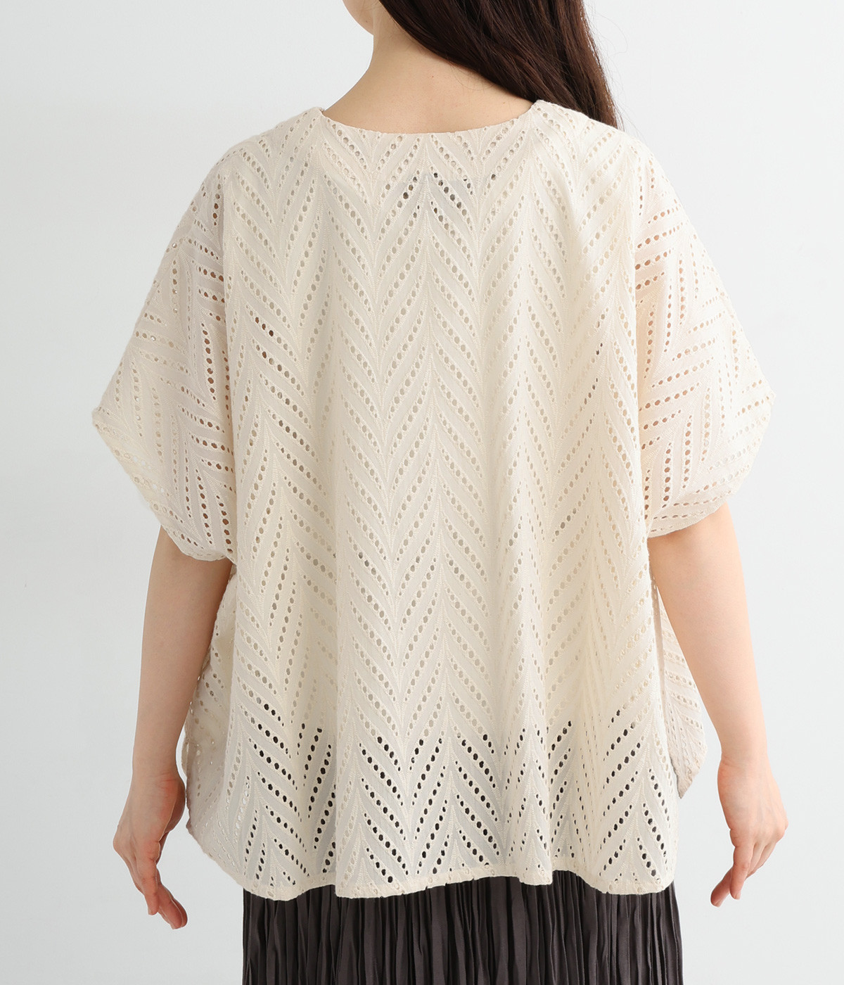 ノースリーブなど肩周りが心もとないときや冷房対策用に重宝する羽織り。葉っぱのような透かし編みレース模様は、明度が高いインナーを合わせるとまるで木漏れ日のような清々しさを感じられます。ひとつボタンなのでサッと羽織ったり前を開けてきたりの動作はとてもスムーズ。身幅にもたっぷりとゆとりがあるので、地厚なトップやワンピースを合わせやすいのも特徴です。