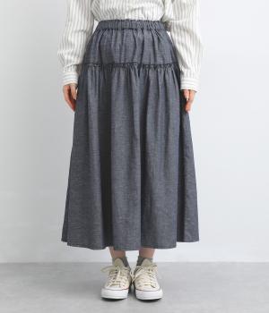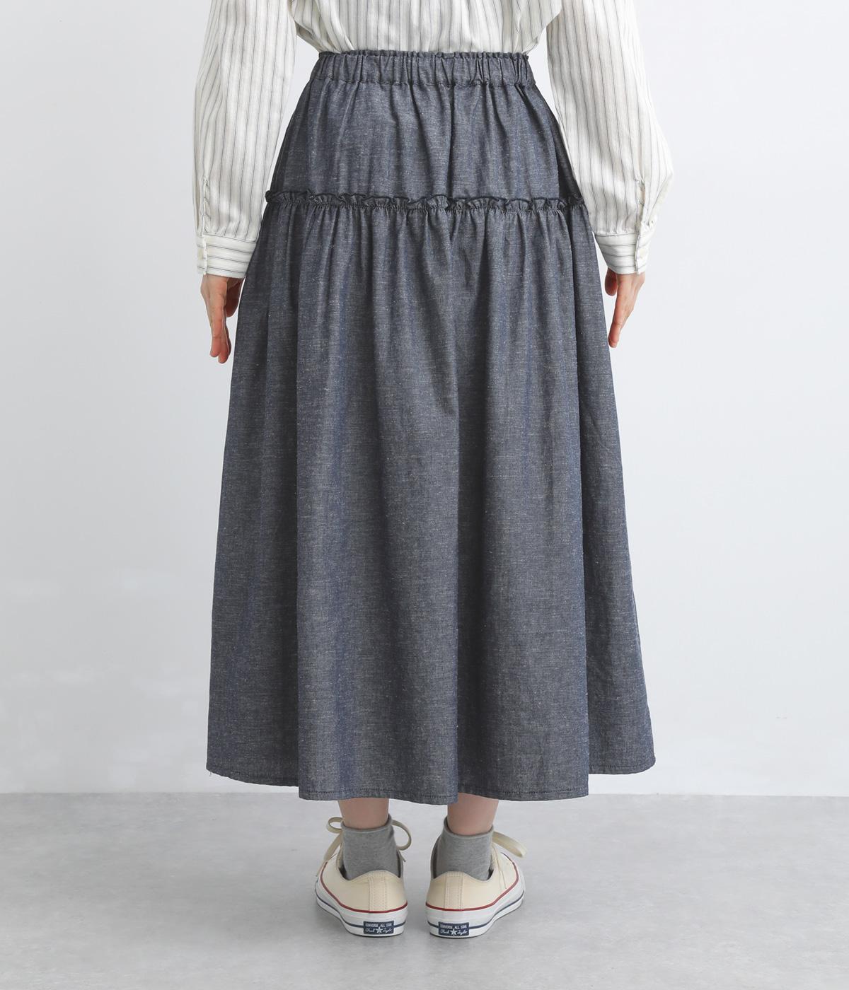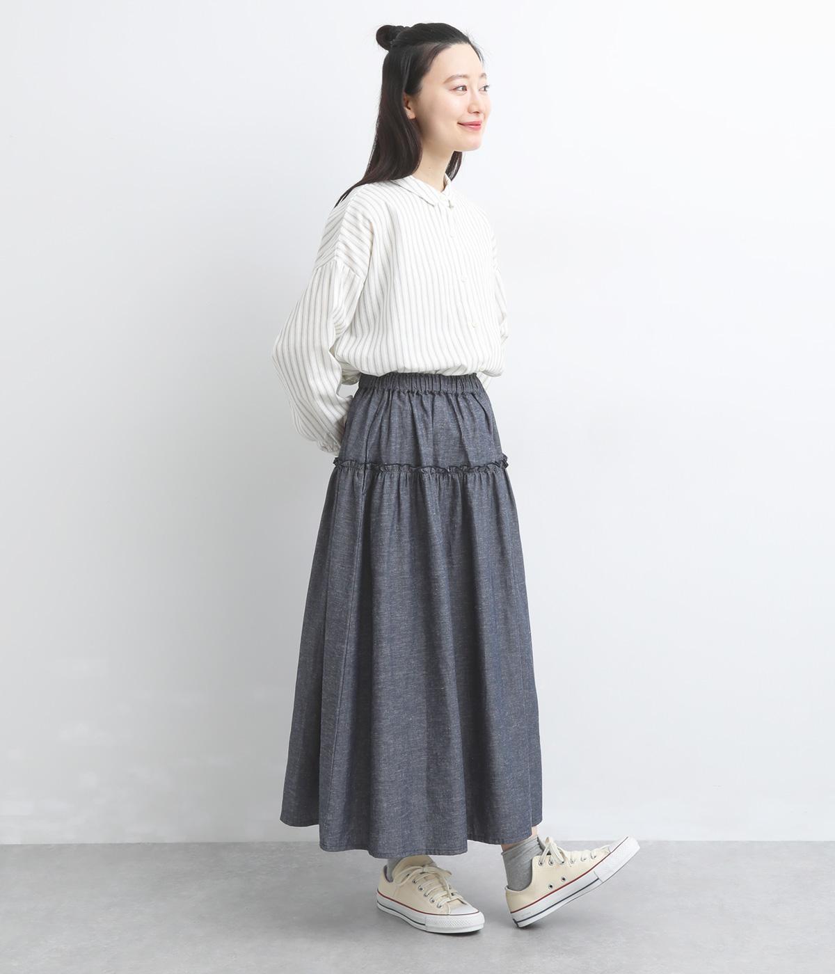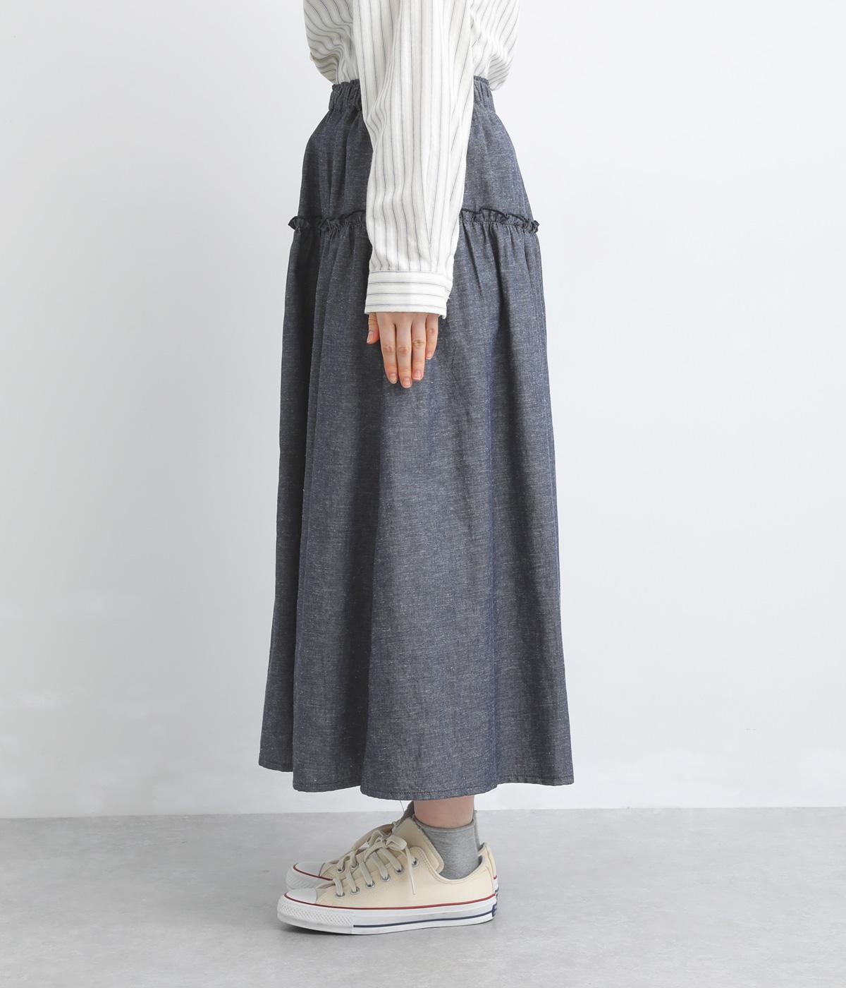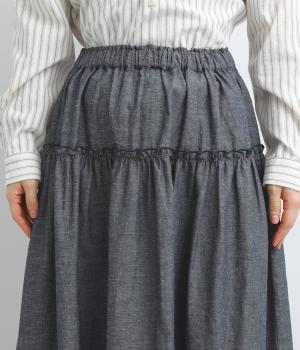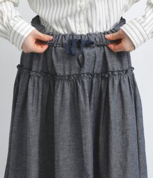 フリルをほどこしたティアードデザインが大人の可愛らしさを表現。気持ちのいい素材感が甘さを中和し、手持ちアイテムともあわせやすくまとまっています。ウエストはフィット感のいい総ゴム&内紐入りでお好みの加減に調整できます。