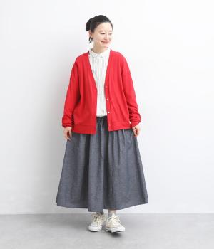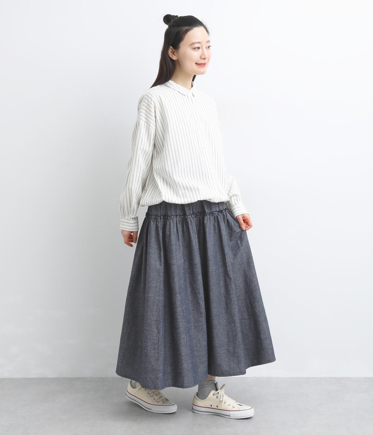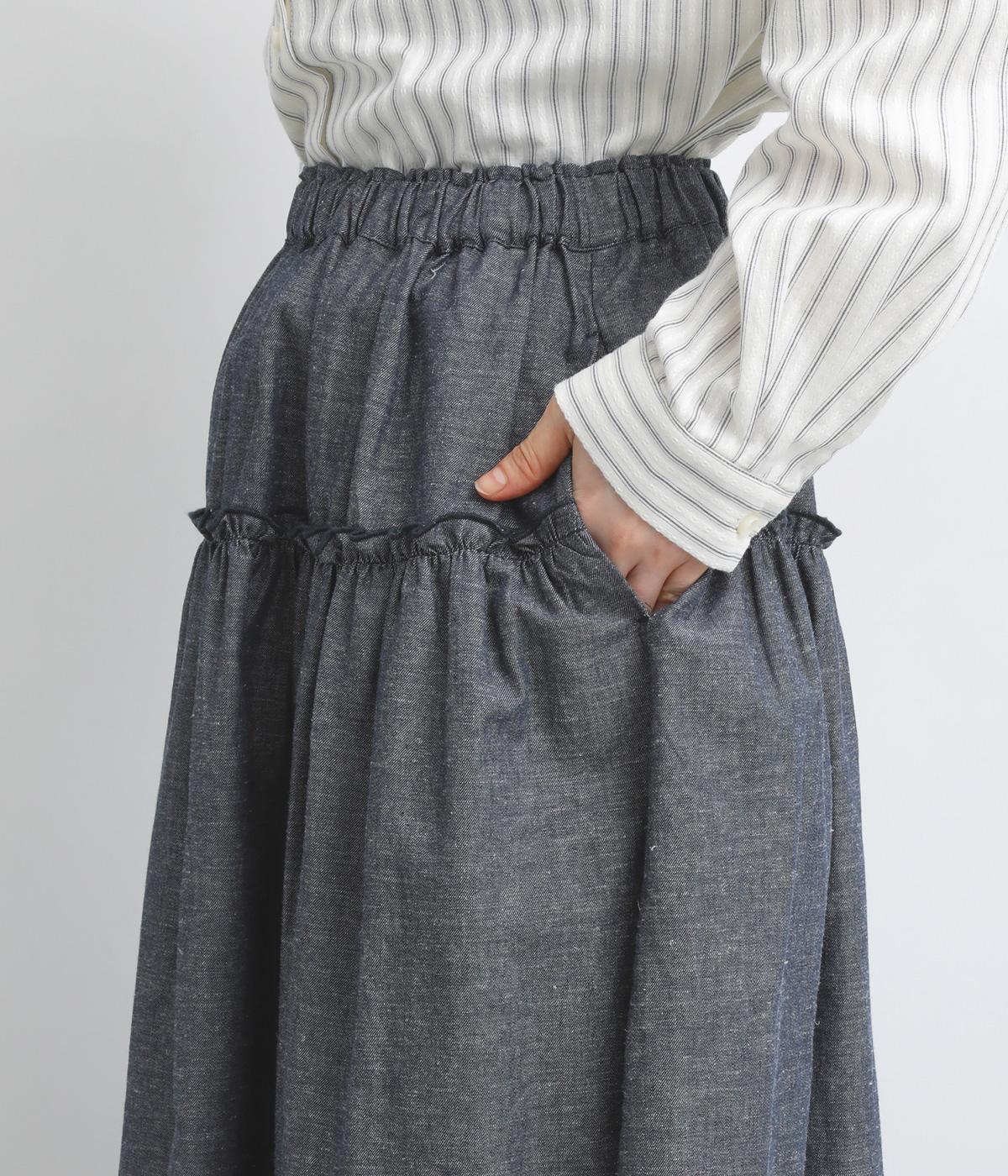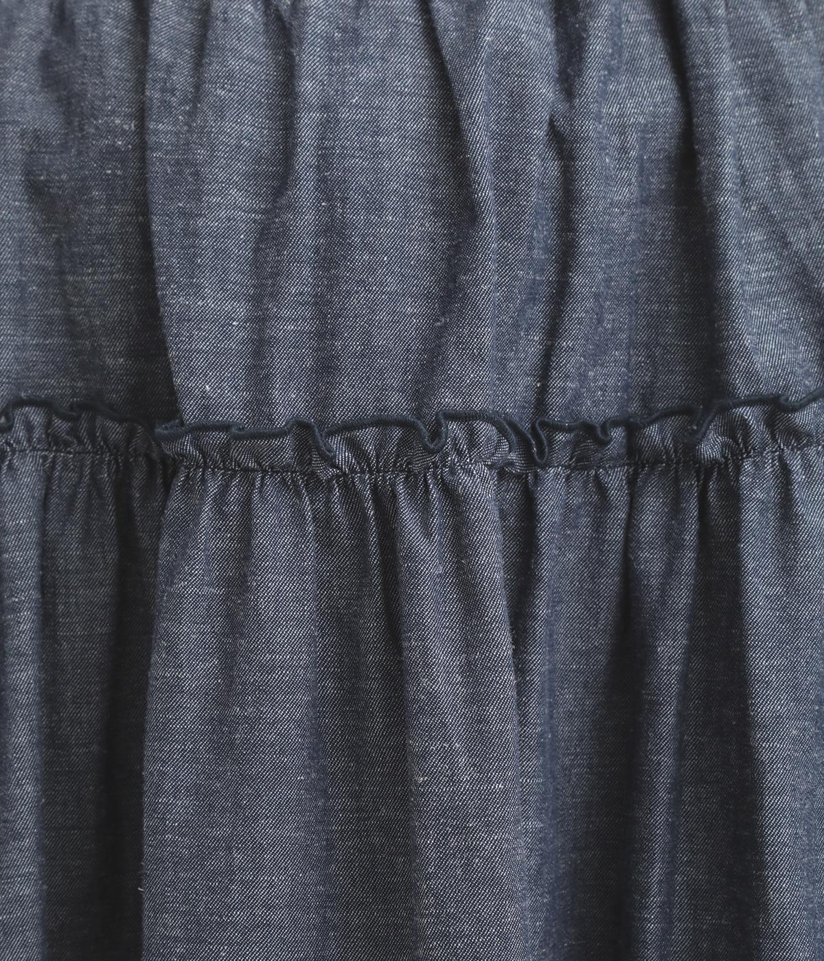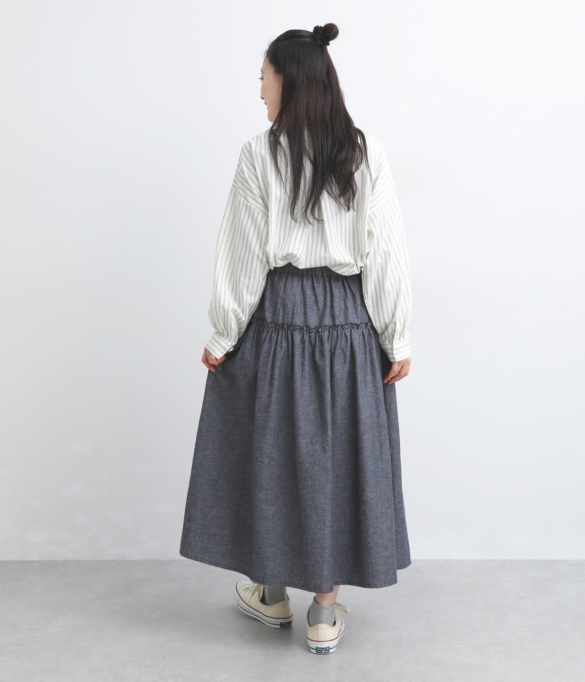 フリルをほどこしたティアードデザインが大人の可愛らしさを表現。気持ちのいい素材感が甘さを中和し、手持ちアイテムともあわせやすくまとまっています。ウエストはフィット感のいい総ゴム&内紐入りでお好みの加減に調整できます。