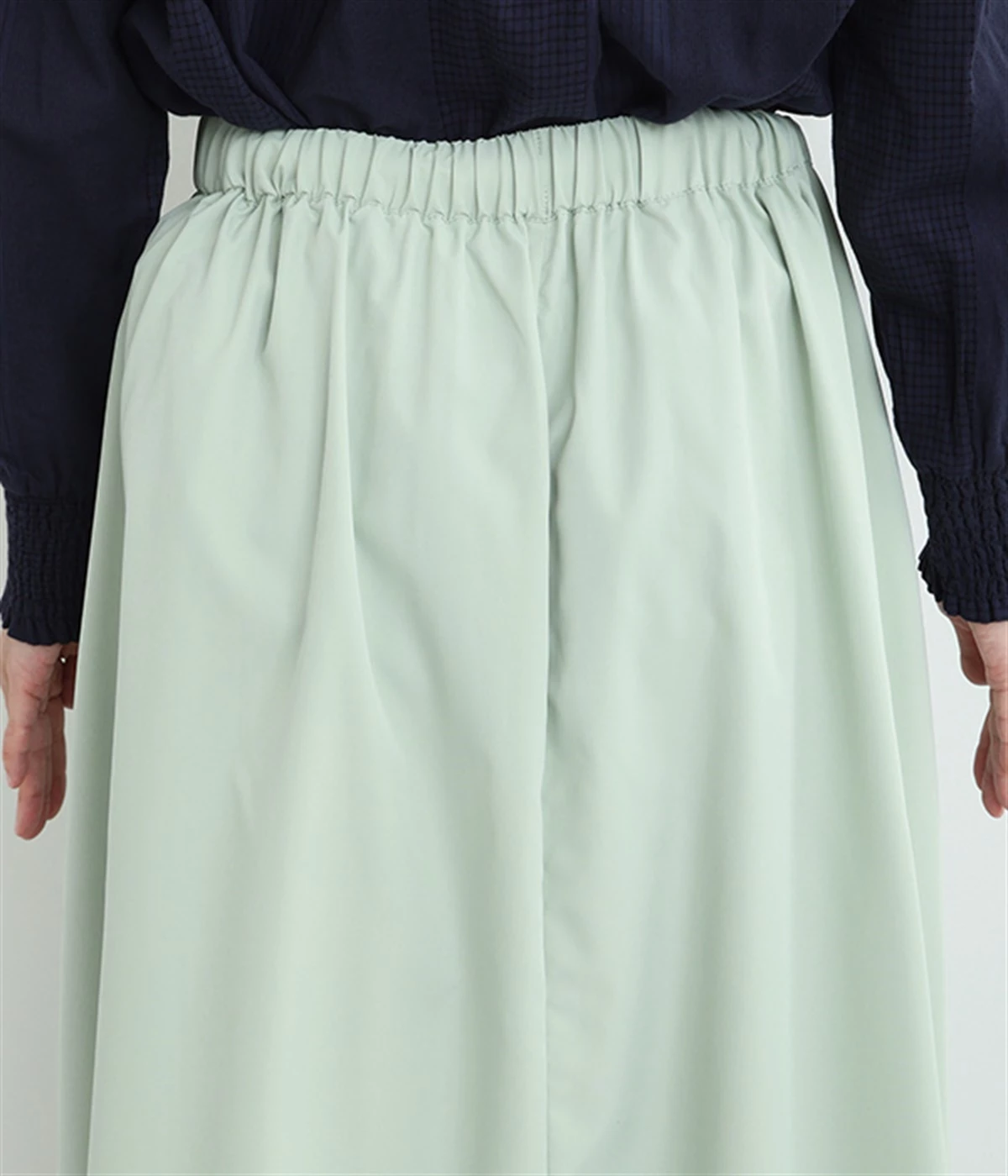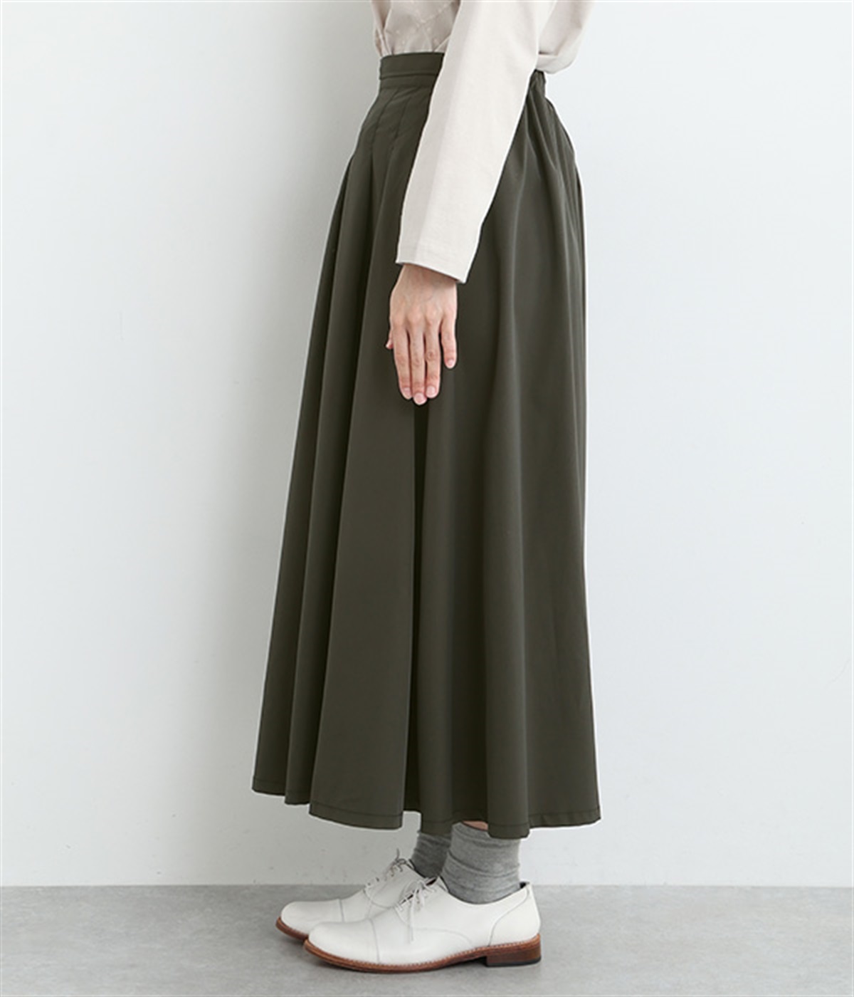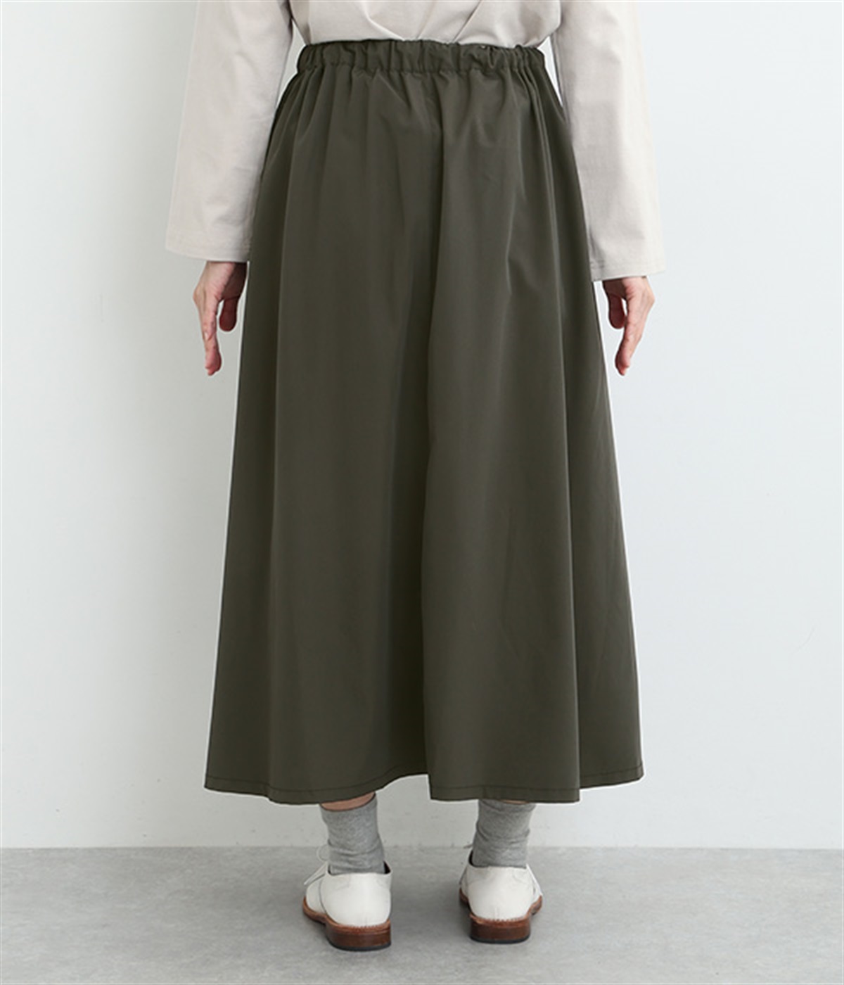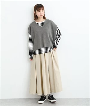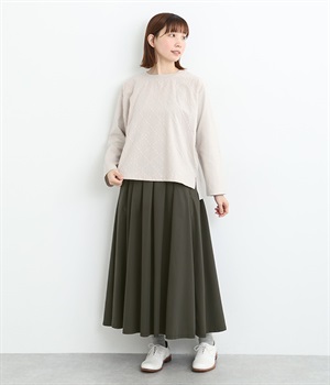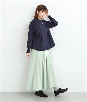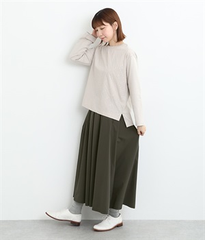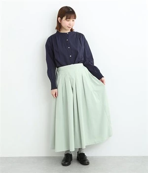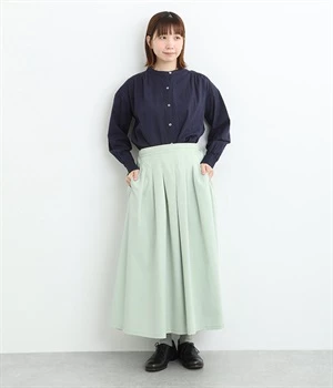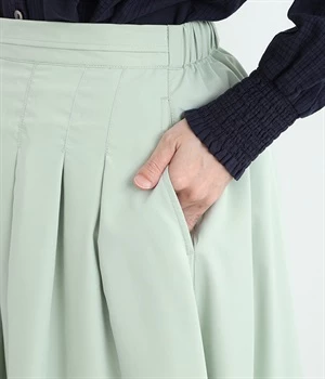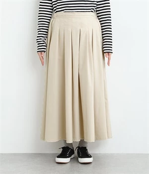 前ウエストにランダムに入れたタックと後ろギャザーで広がりのある仕立て。ほどよくハリのある素材がシルエットをキープして、きれいめスタイルにも重宝します。後ろウエストゴム入りに内側調整紐入り。