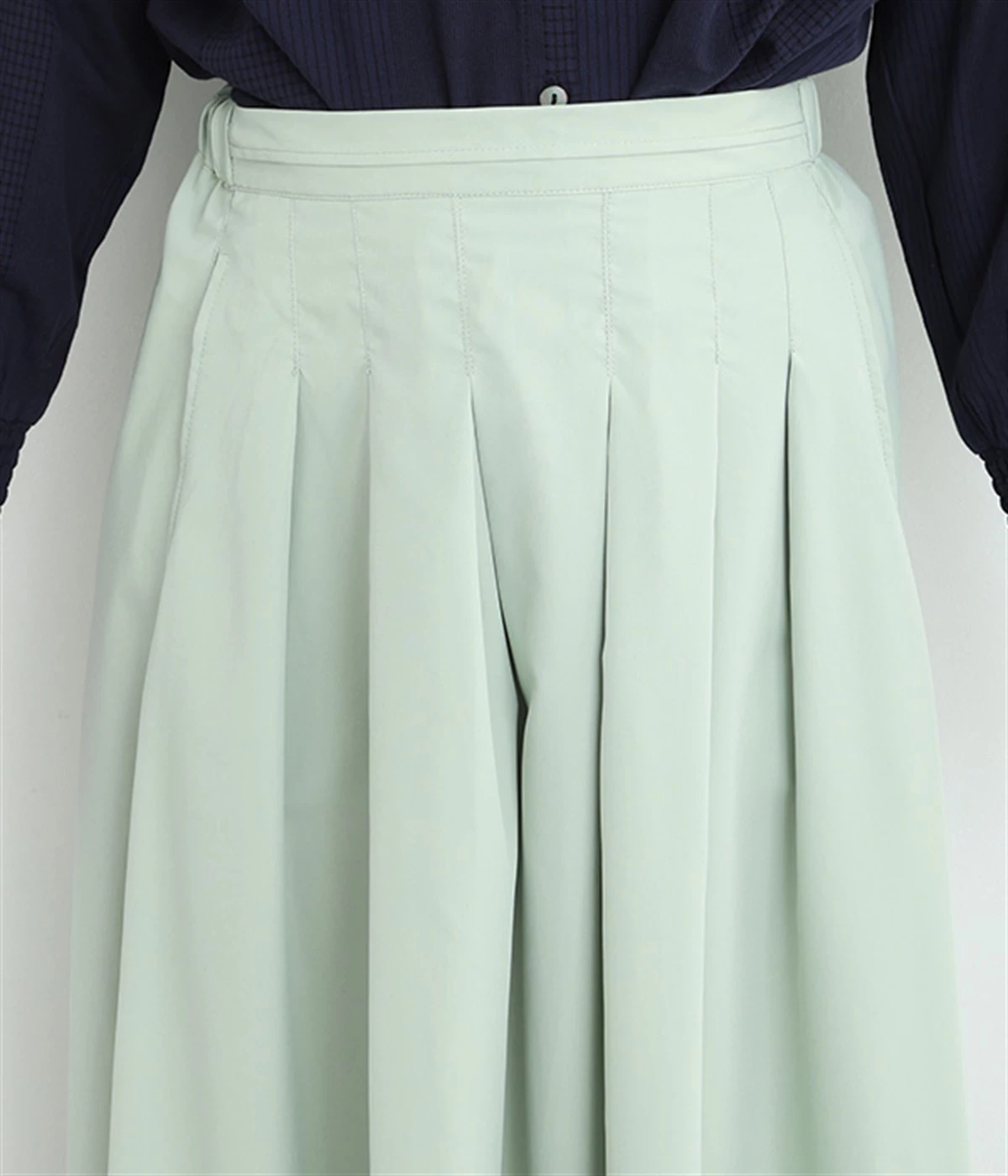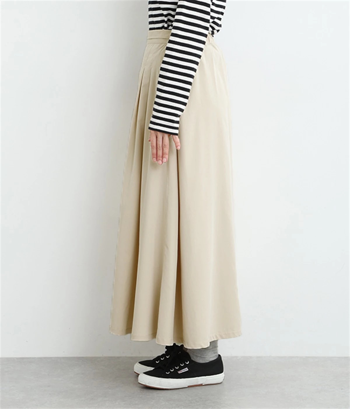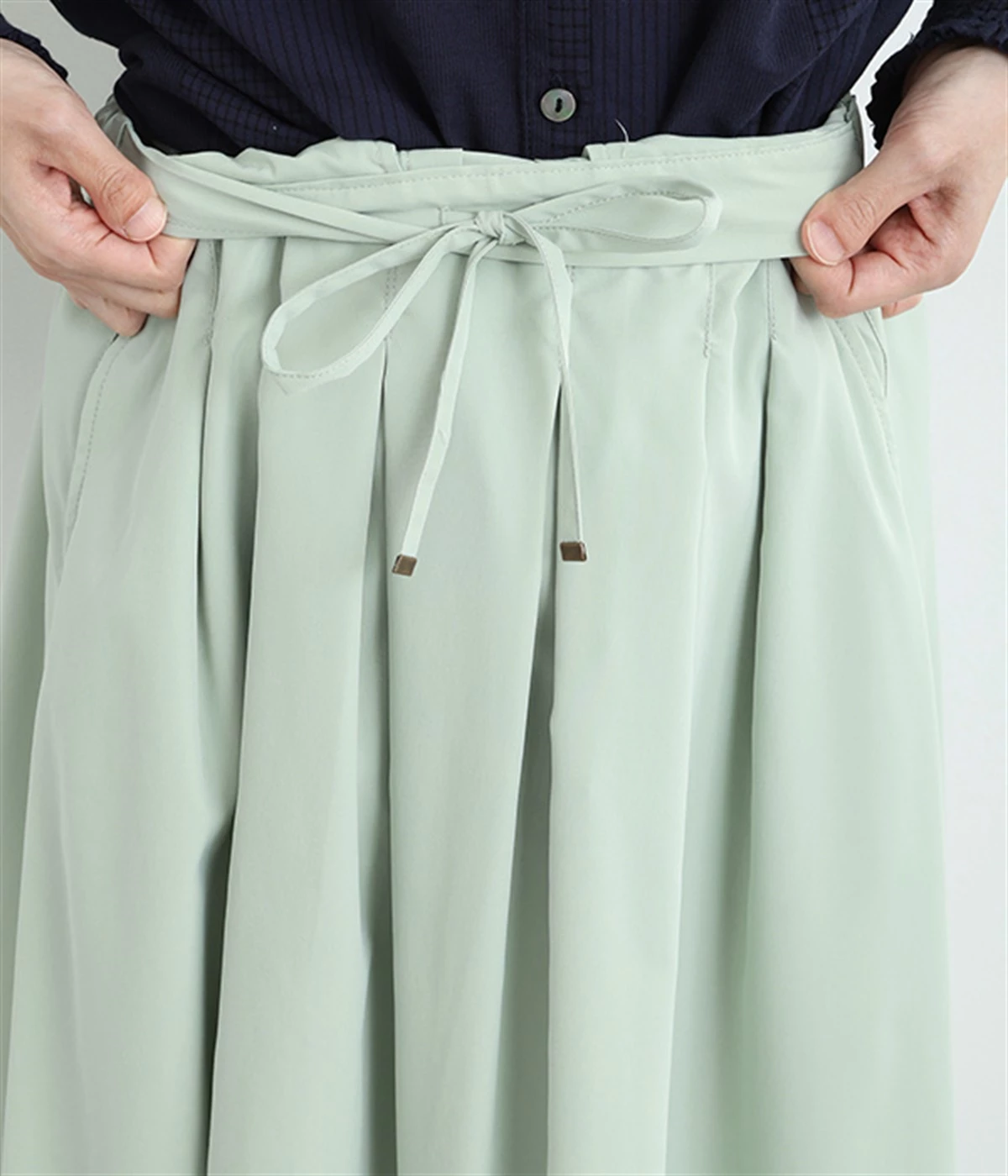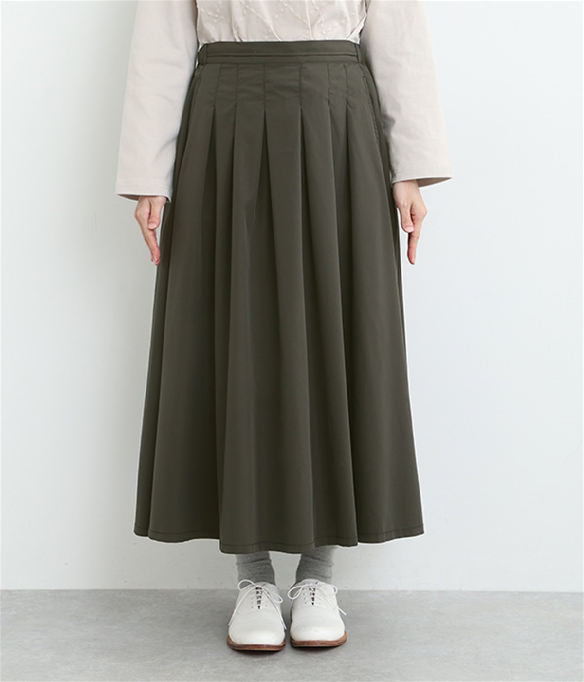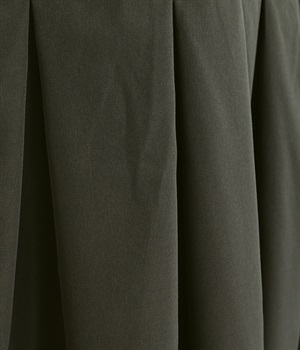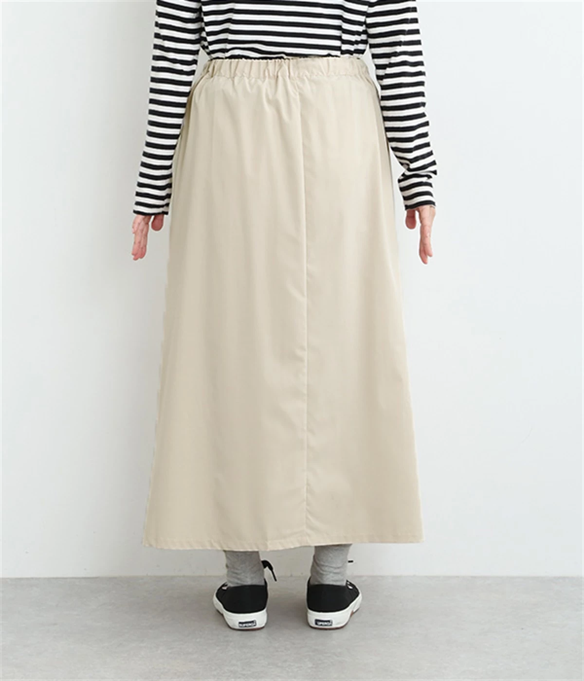 前ウエストにランダムに入れたタックと後ろギャザーで広がりのある仕立て。ほどよくハリのある素材がシルエットをキープして、きれいめスタイルにも重宝します。後ろウエストゴム入りに内側調整紐入り。
