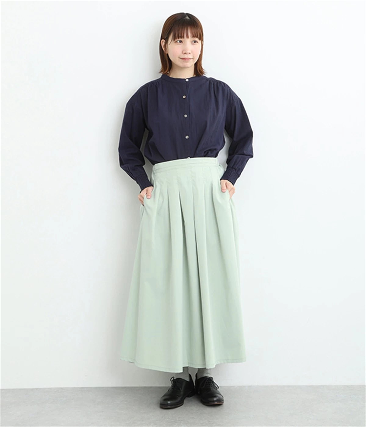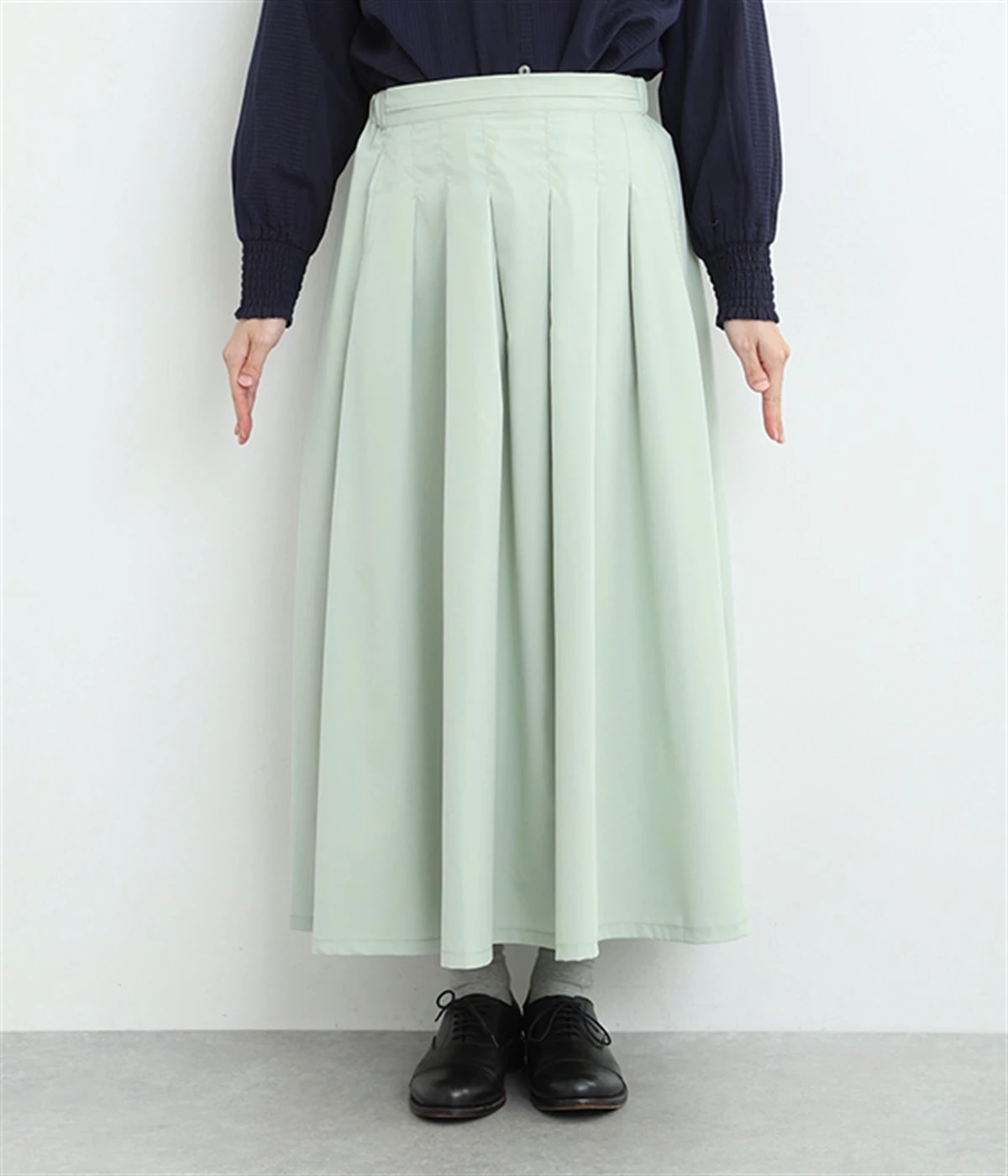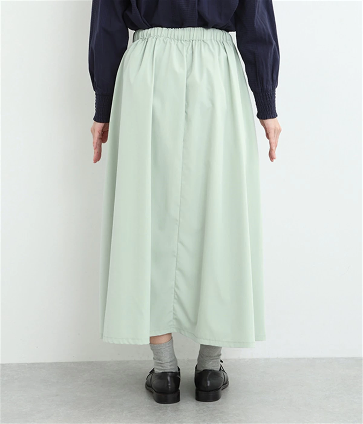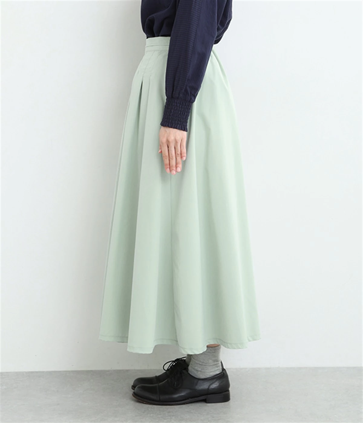 前ウエストにランダムに入れたタックと後ろギャザーで広がりのある仕立て。ほどよくハリのある素材がシルエットをキープして、きれいめスタイルにも重宝します。後ろウエストゴム入りに内側調整紐入り。