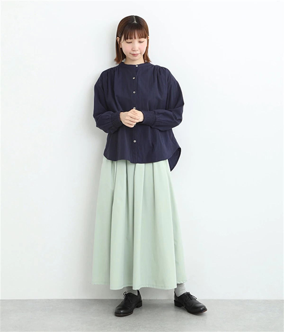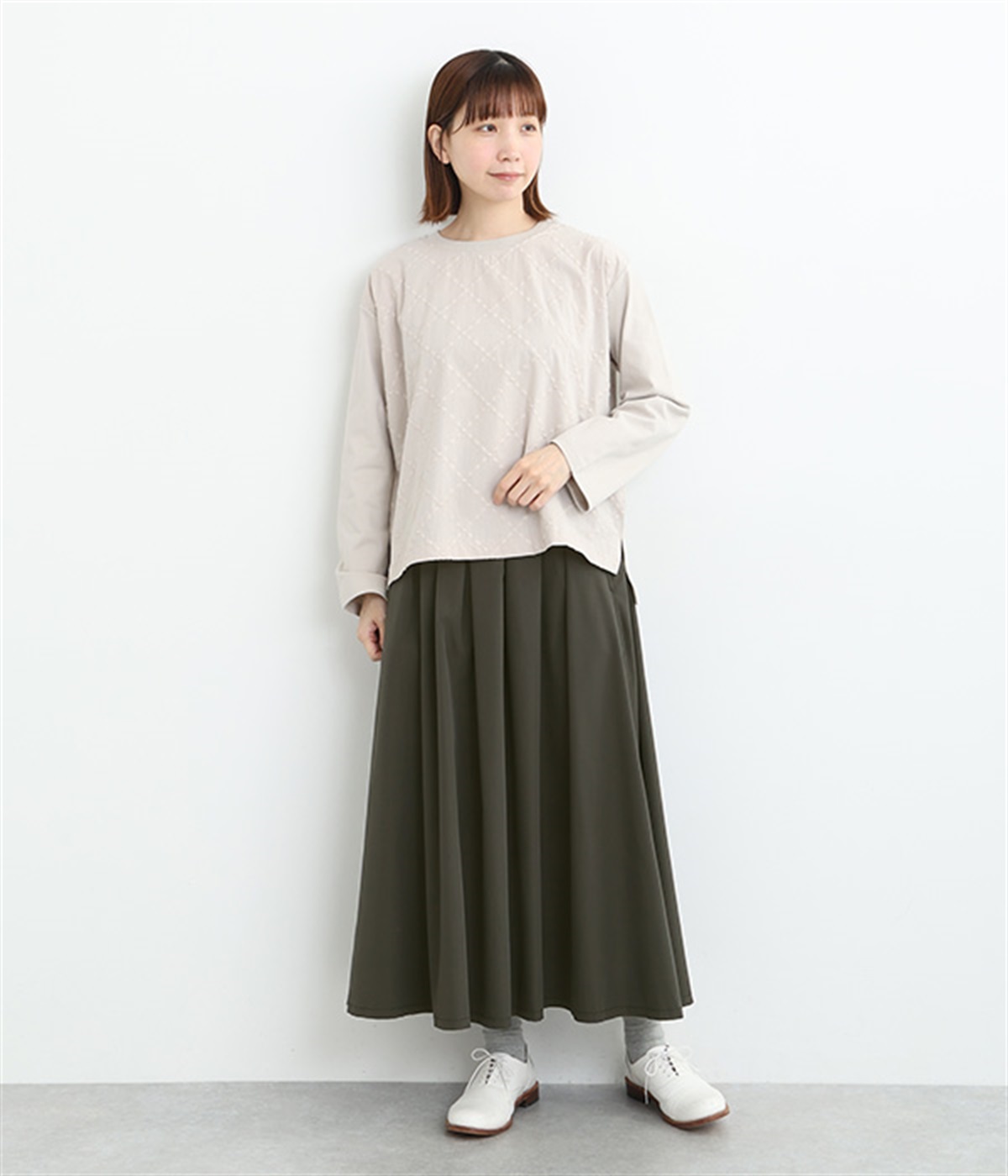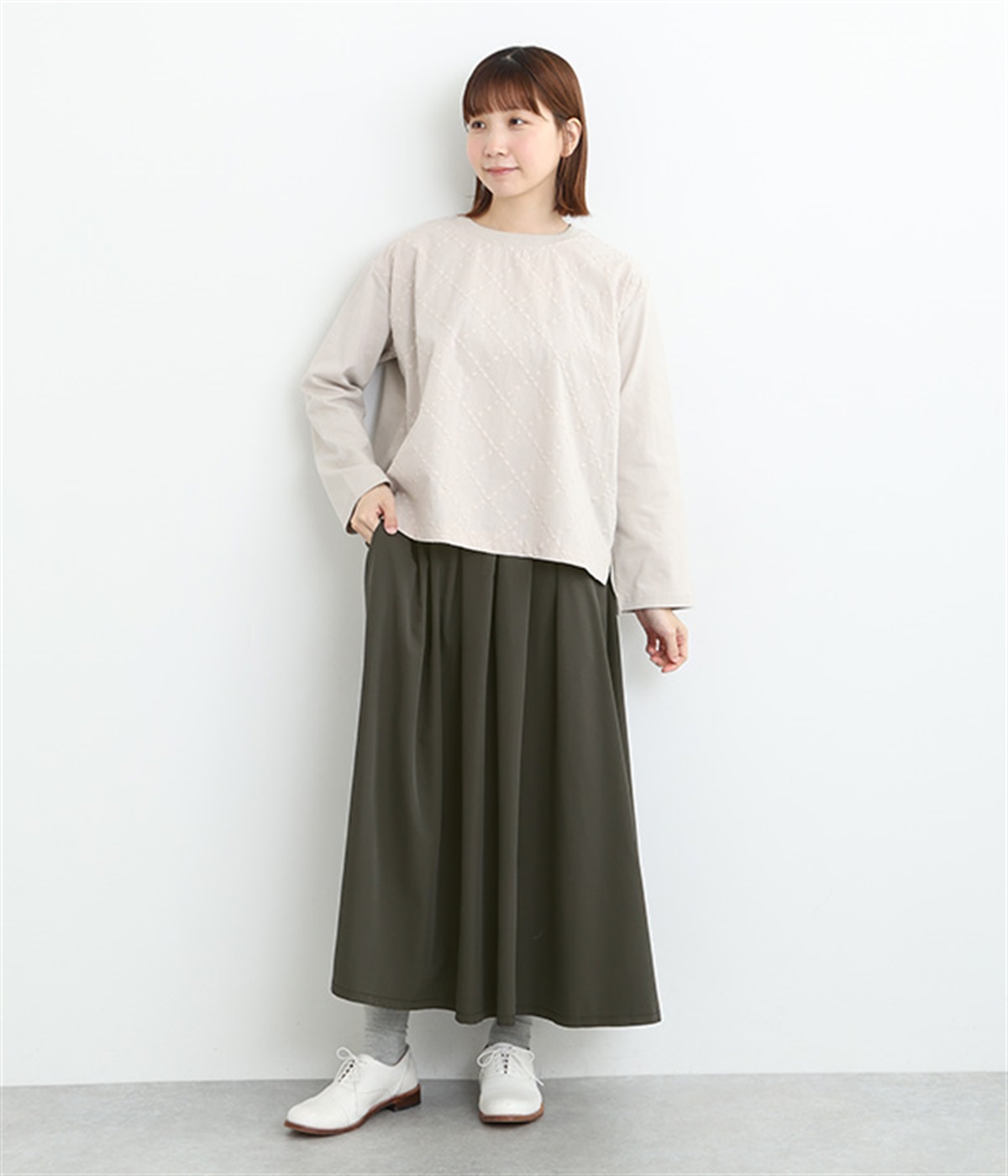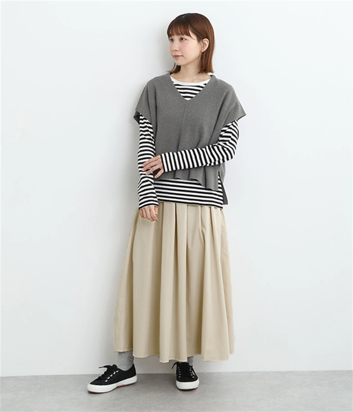前ウエストにランダムに入れたタックと後ろギャザーで広がりのある仕立て。ほどよくハリのある素材がシルエットをキープして、きれいめスタイルにも重宝します。後ろウエストゴム入りに内側調整紐入り。