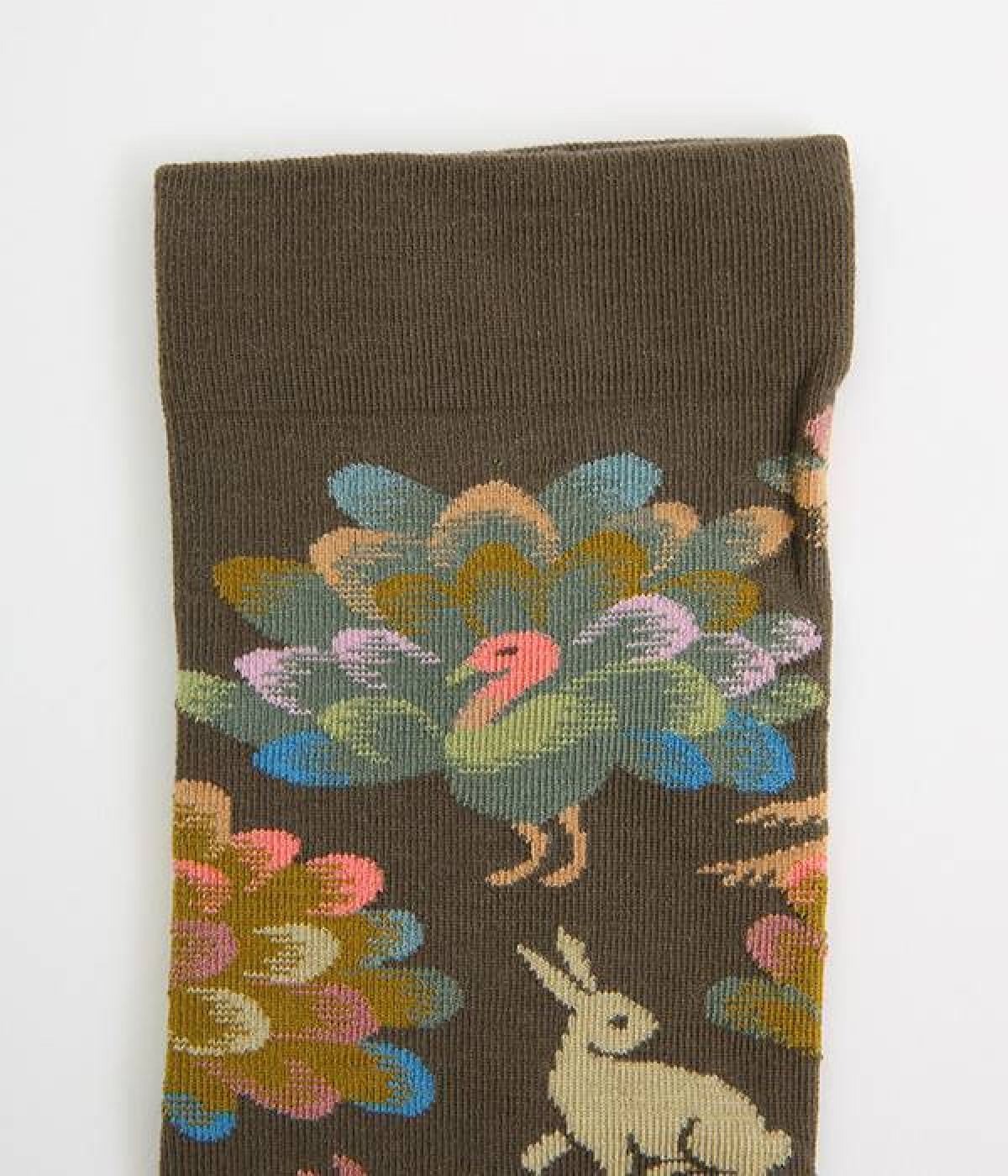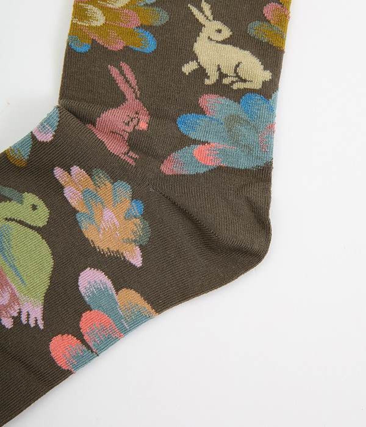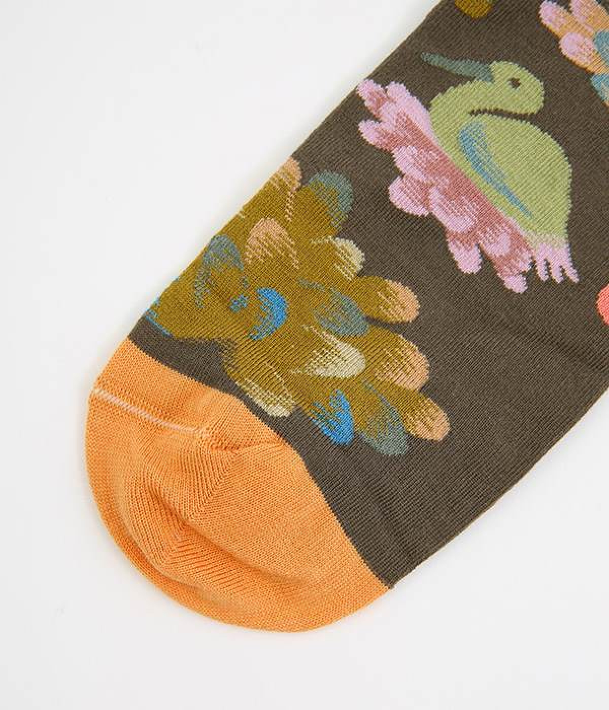 2012年立ち上げのソックスブランド 、ボンヌ・メゾンのフランスらしい繊細なカラーリングが特徴のソックス。大判絵画などからインスピレーションを受け、やや色褪せした味わい深い面持ちが素敵です。多色の糸使いで花びらや羽根の筋を表現した手の込んだデザイン。はき口は太幅リブ仕立てにして密着感を高めています。ロールアップのボトムからのぞかせたり、無地スタイリングの差し柄にしたりとアイデアが広がります。