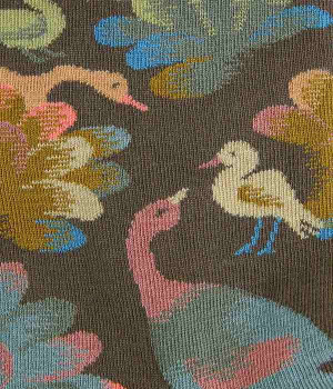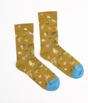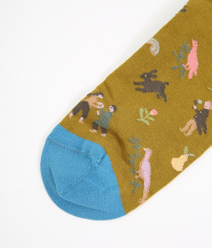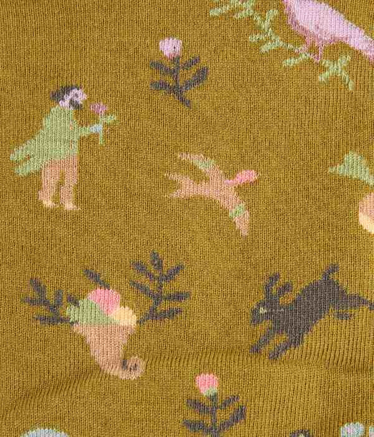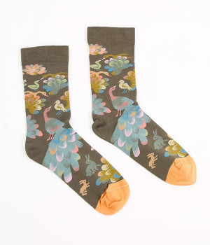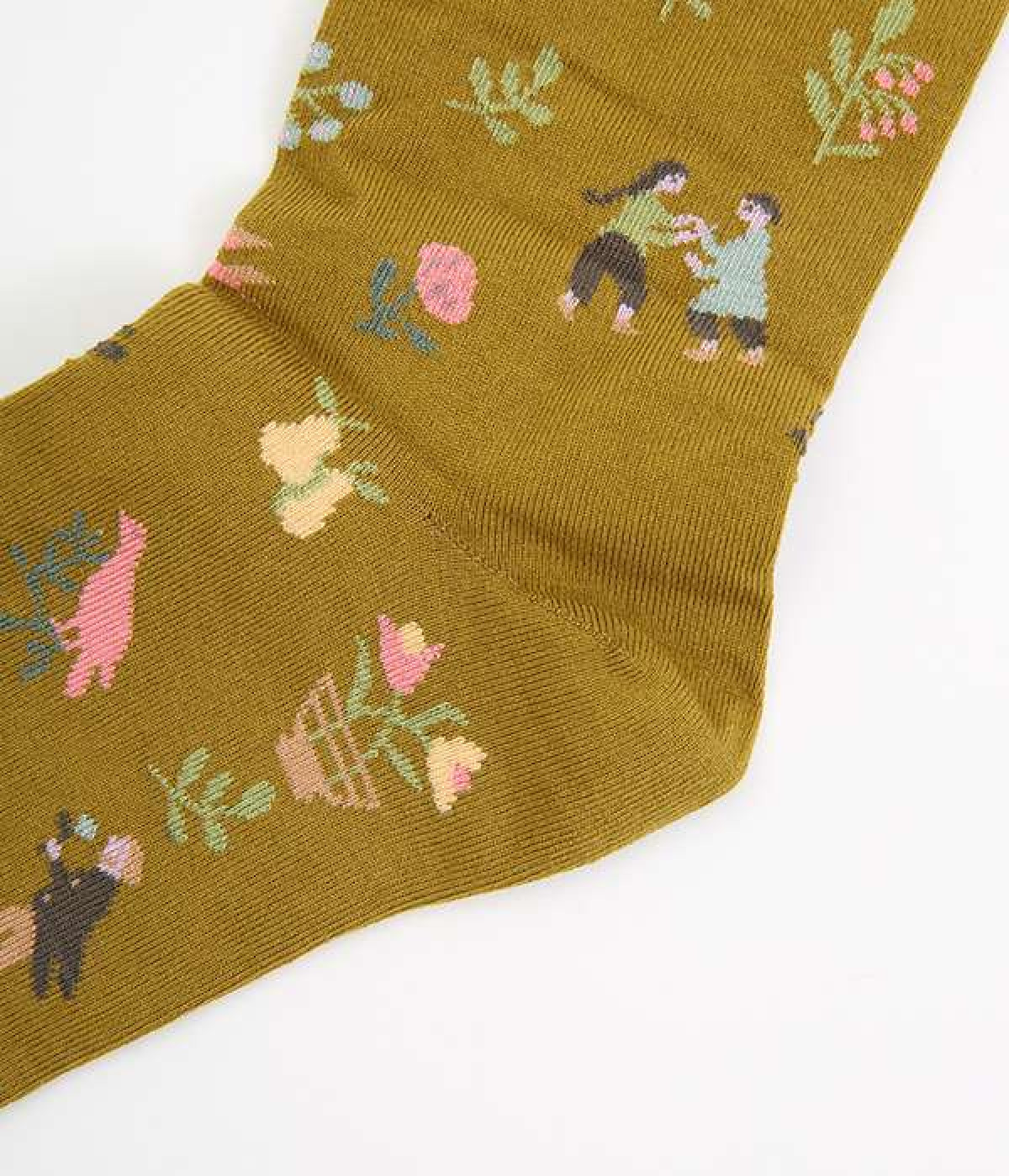 2012年立ち上げのソックスブランド 、ボンヌ・メゾンのフランスらしい繊細なカラーリングが特徴のソックス。大判絵画などからインスピレーションを受け、やや色褪せした味わい深い面持ちが素敵です。多色の糸使いで花びらや羽根の筋を表現した手の込んだデザイン。はき口は太幅リブ仕立てにして密着感を高めています。ロールアップのボトムからのぞかせたり、無地スタイリングの差し柄にしたりとアイデアが広がります。