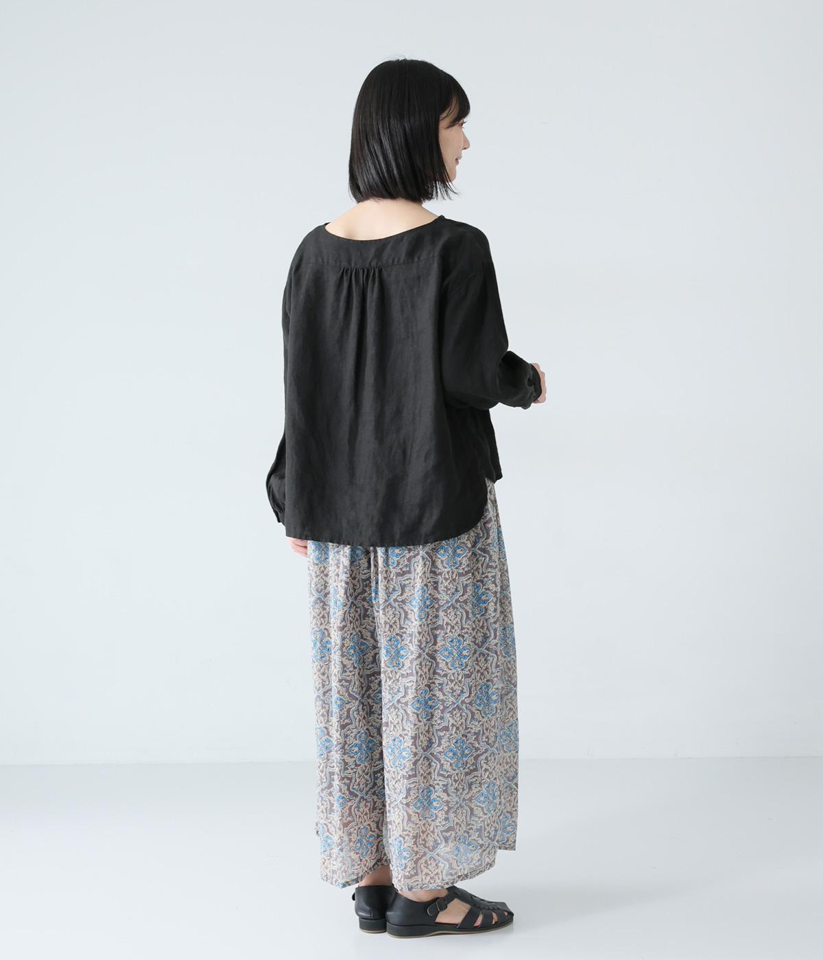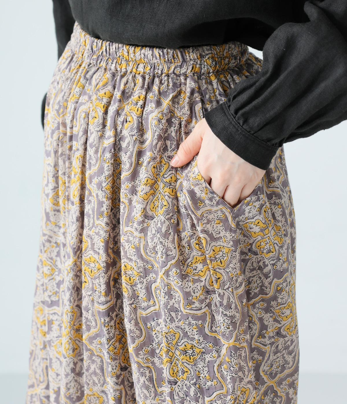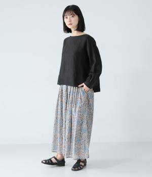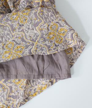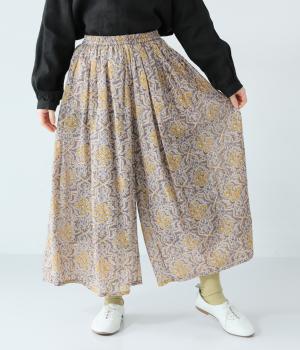 華やかさのあるオリエンタルな柄をあしらった裏地付きパンツです。ウエストはゴム仕様で内紐で調節でき、両サイドポケット付きで実用的。軽やかなシルエットで一枚でも着映えし、日々の装いをパッとトーンアップしてくれます。