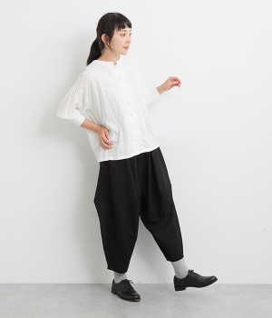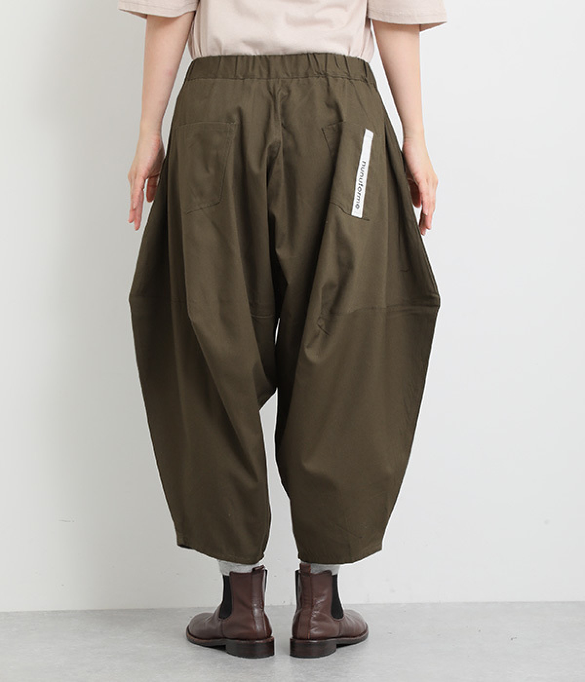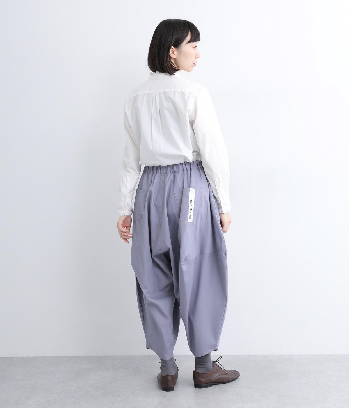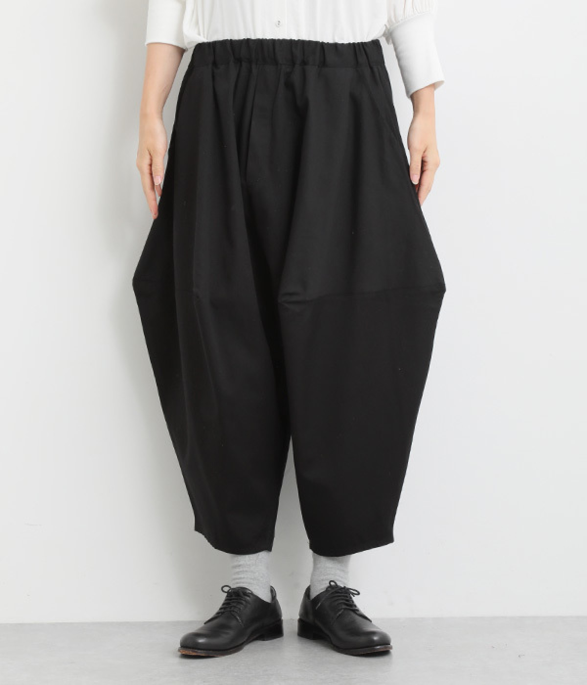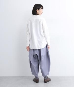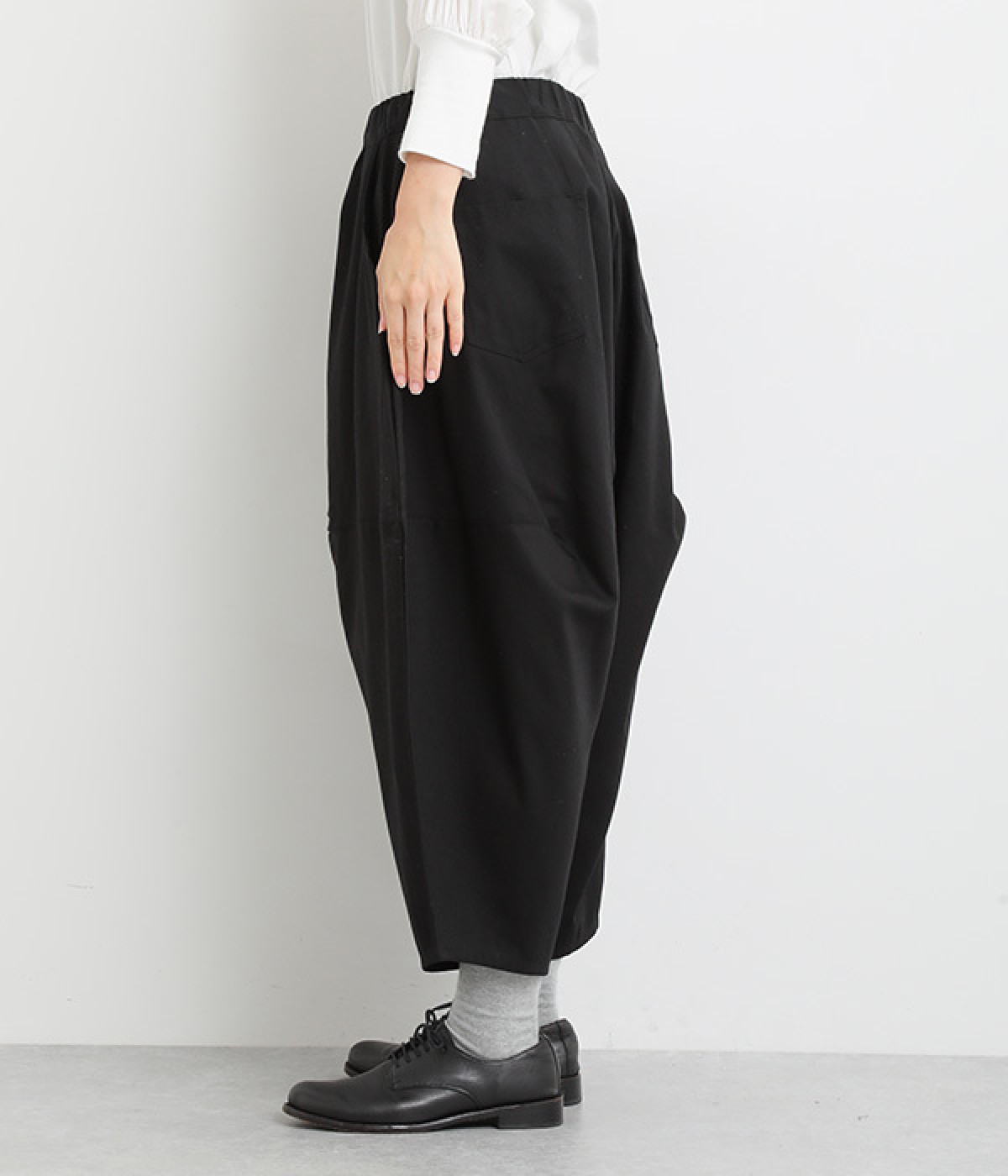 ダーツを入れて立体感をつけたシルエットが目を惹きます。シンプルな合わせでも個性的なスタイリングになり、一本持っているとなにかと便利。足元がすっきり見える丈感でバランスも◎。ウエストはぐるりとゴムを入れたイージー仕様です。