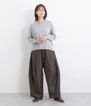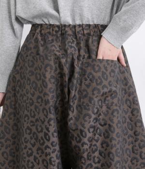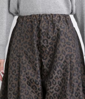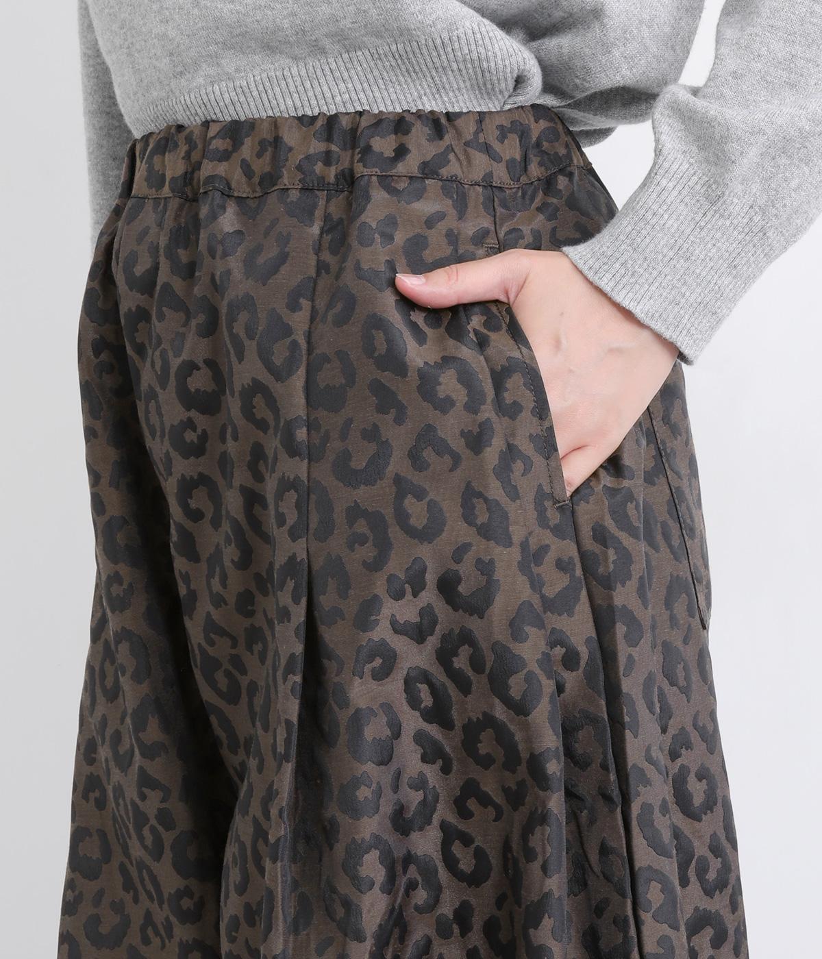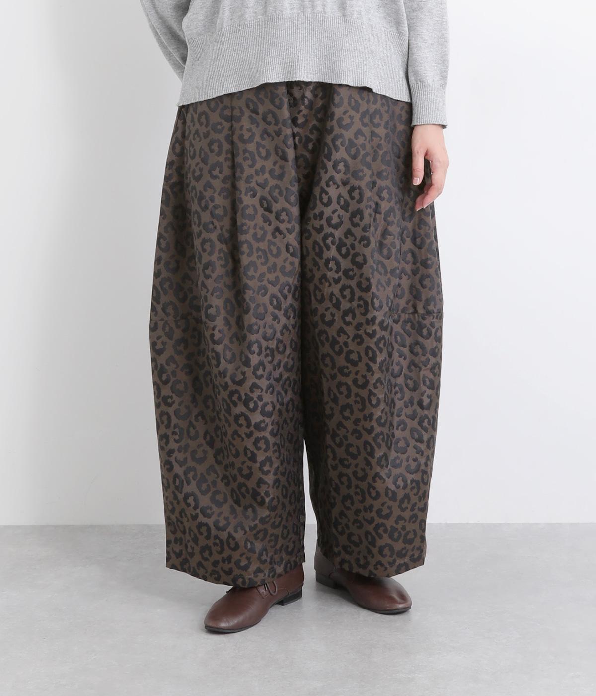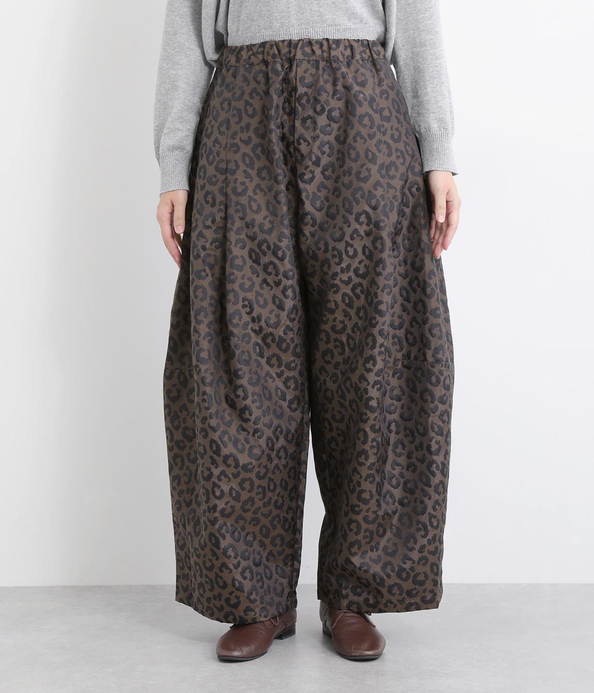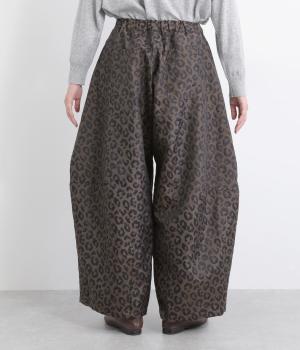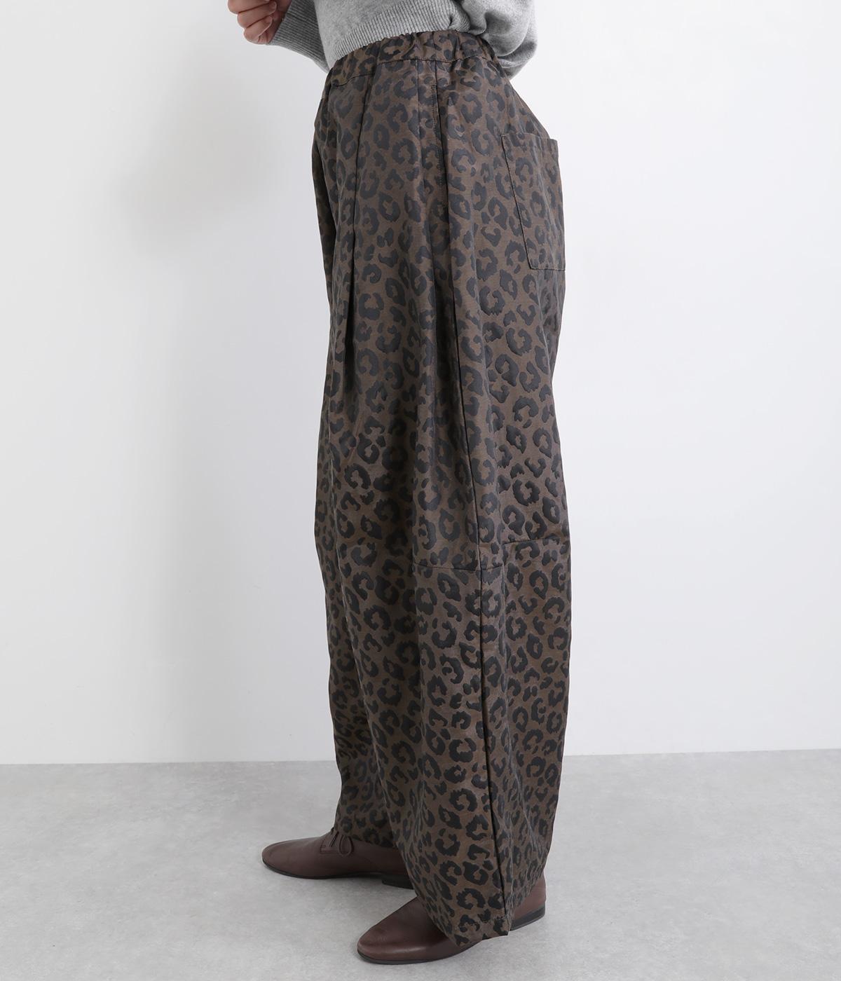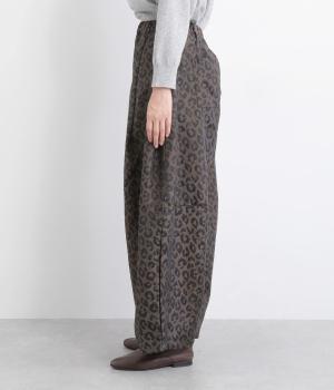 腰まわりは広がりをおさえながらもたっぷりとボリュームを持たせたタックデザインのパンツ。光沢のあるレオパード柄がインパクト抜群で、シンプルな合わせでも個性的なお洒落がたのしめます。ウエストは総ゴムのイージー仕様。