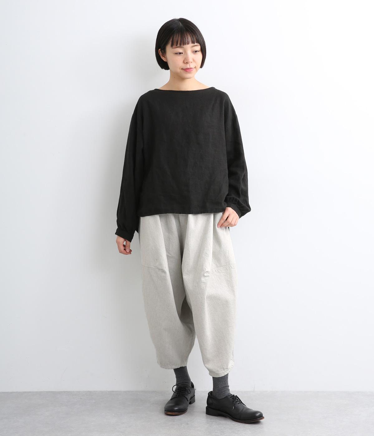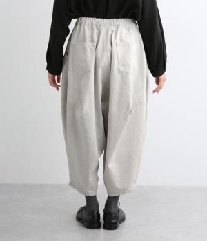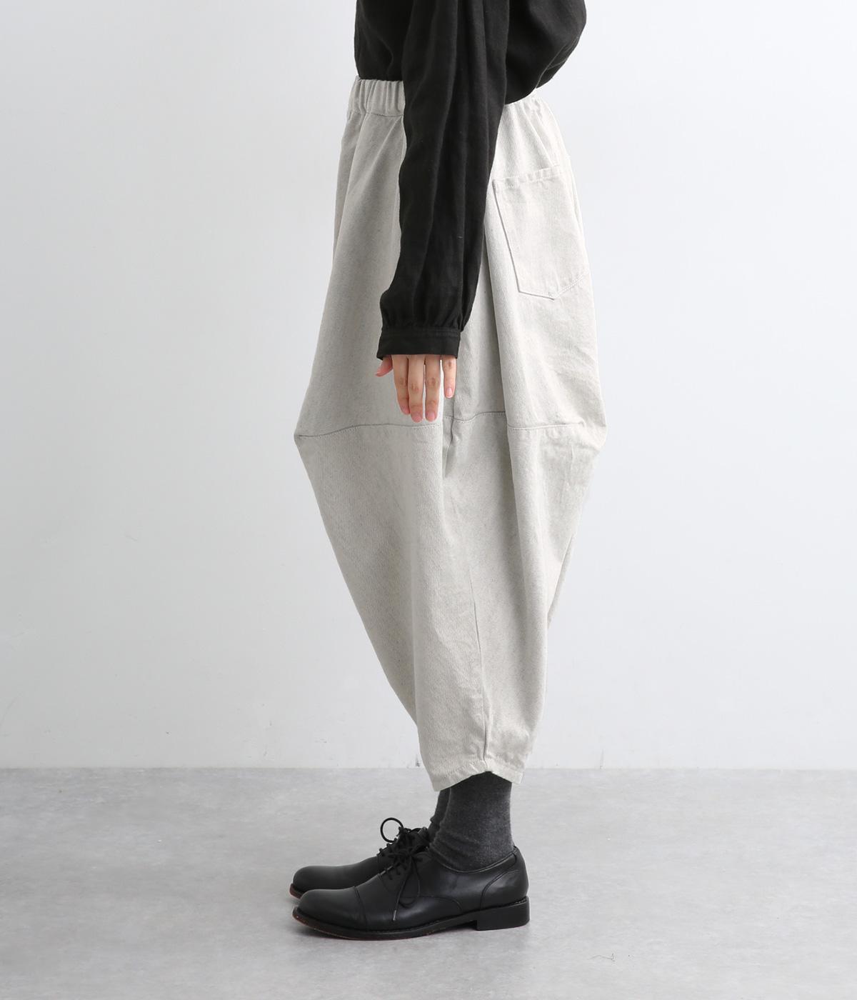 脇に切り替えを入れて自然な立体感をつけたポインテッドシルエットが目を惹きます。ゆったりとしたボリューム感が特徴で大人スタイルに遊びをプラス。足首をすっきり見せた丈感でバランスよく仕上がっています。ウエストはオールゴムのリラックス仕様。