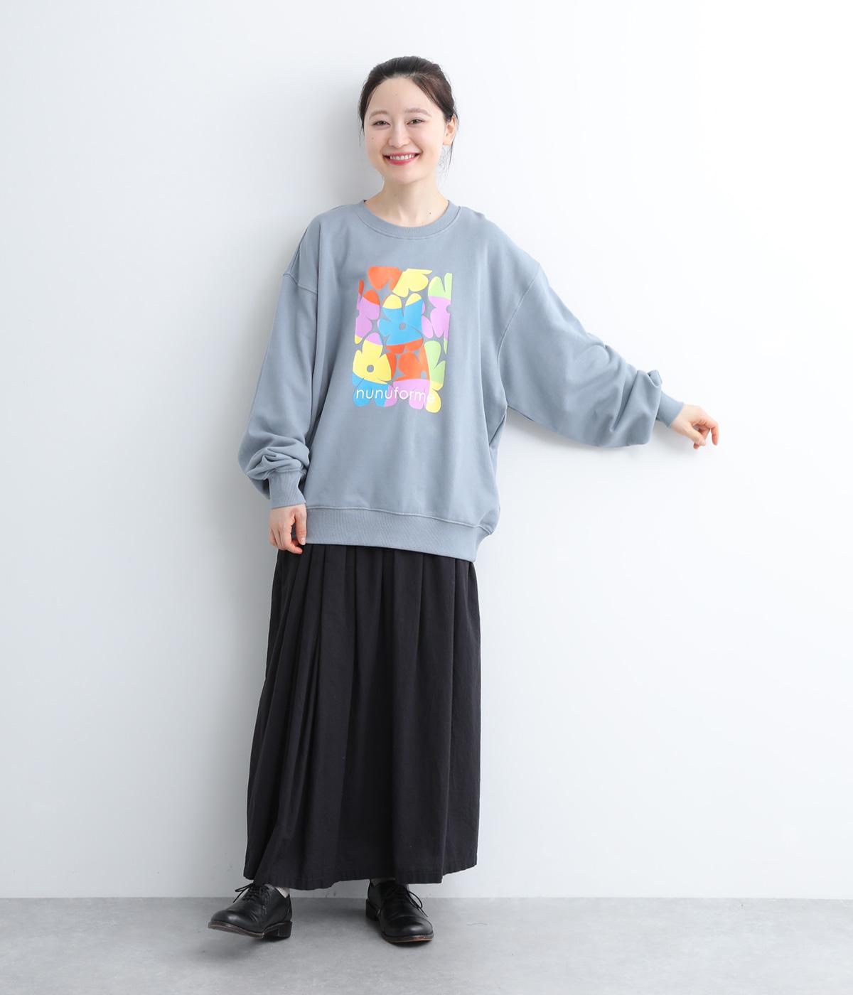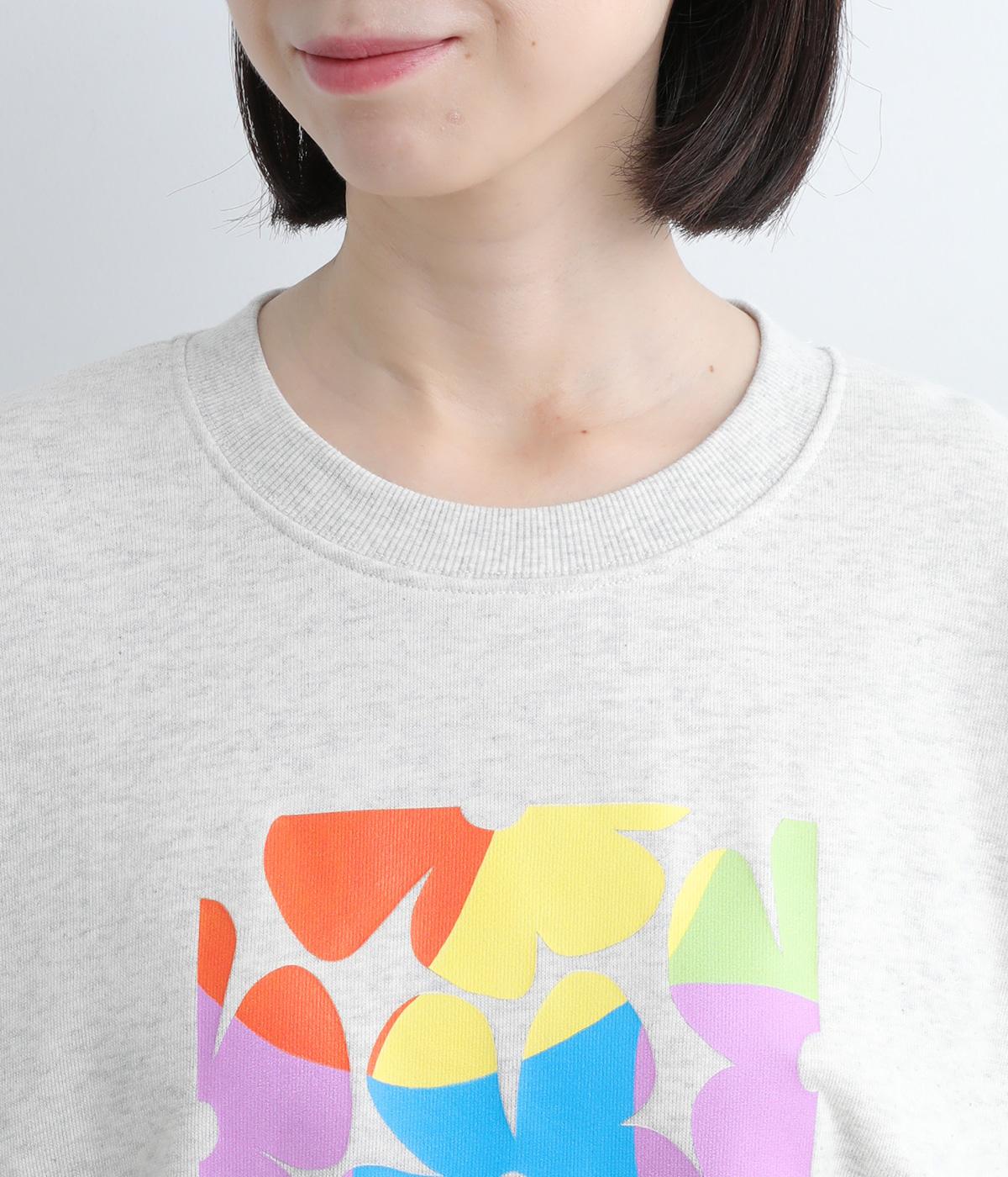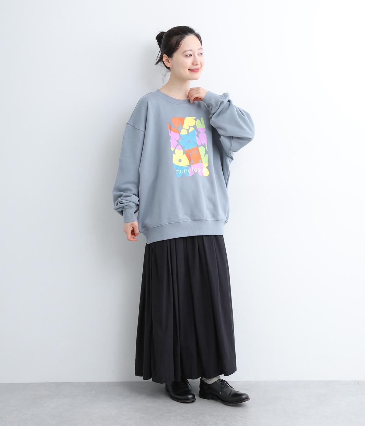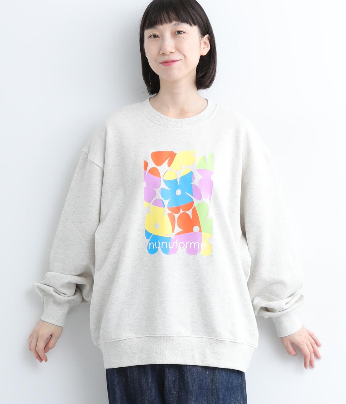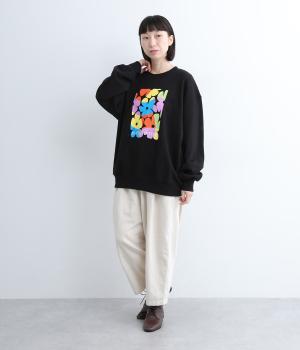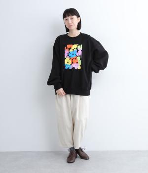 マルチカラーのフラワープリントが目を惹くスウェットプルオーバーです。四角い枠の中に敷き詰められたような構図が特徴的で、華やかながらもカジュアルさをキープ。袖口がくしゅっとたるむオーバーサイズで、リラックス感のある仕上がりです。