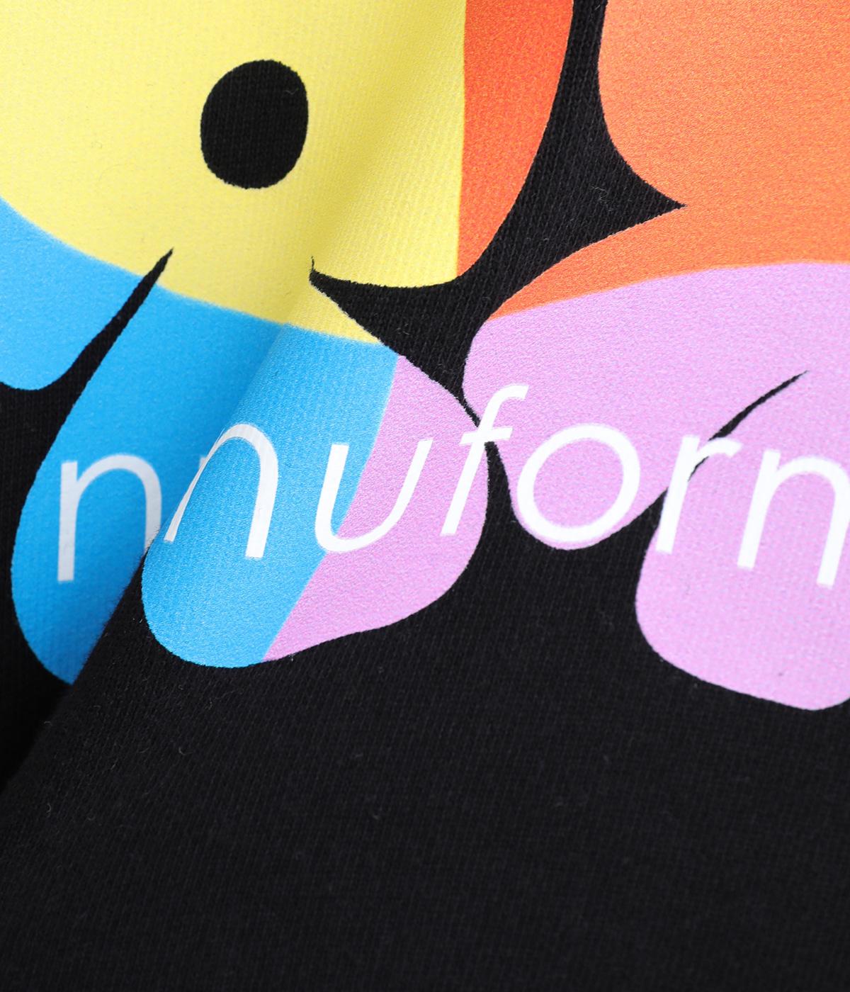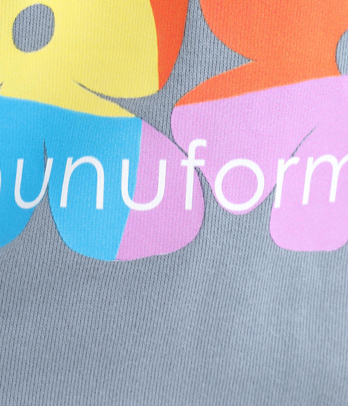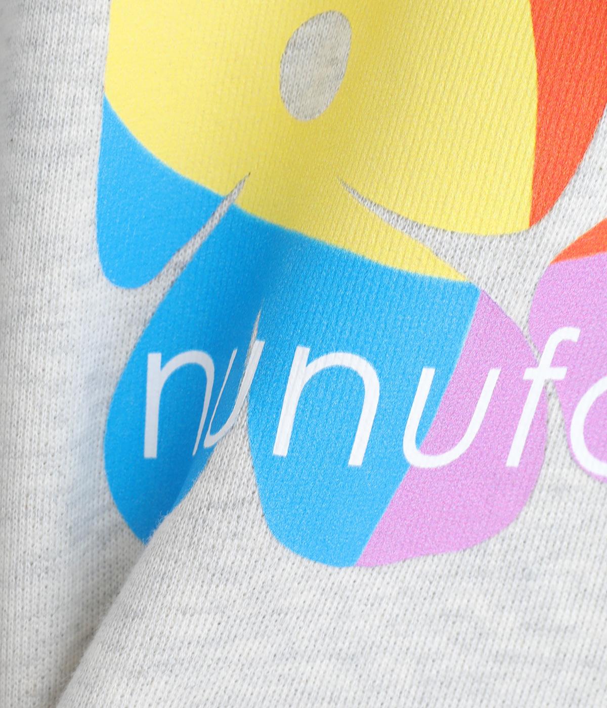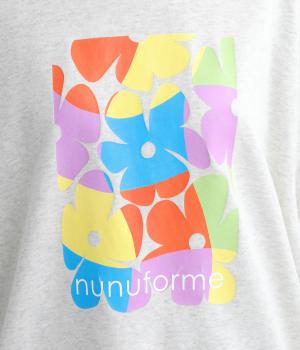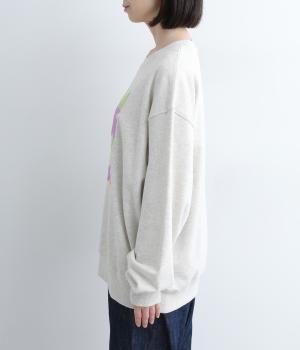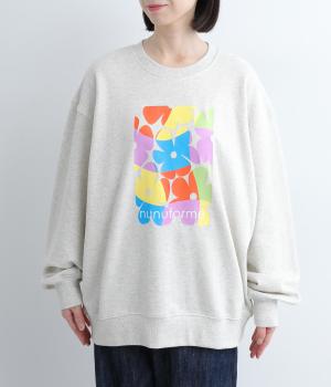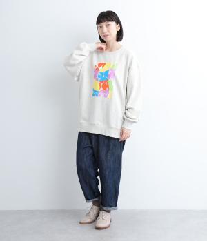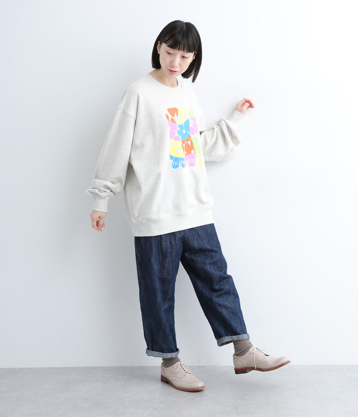 マルチカラーのフラワープリントが目を惹くスウェットプルオーバーです。四角い枠の中に敷き詰められたような構図が特徴的で、華やかながらもカジュアルさをキープ。袖口がくしゅっとたるむオーバーサイズで、リラックス感のある仕上がりです。