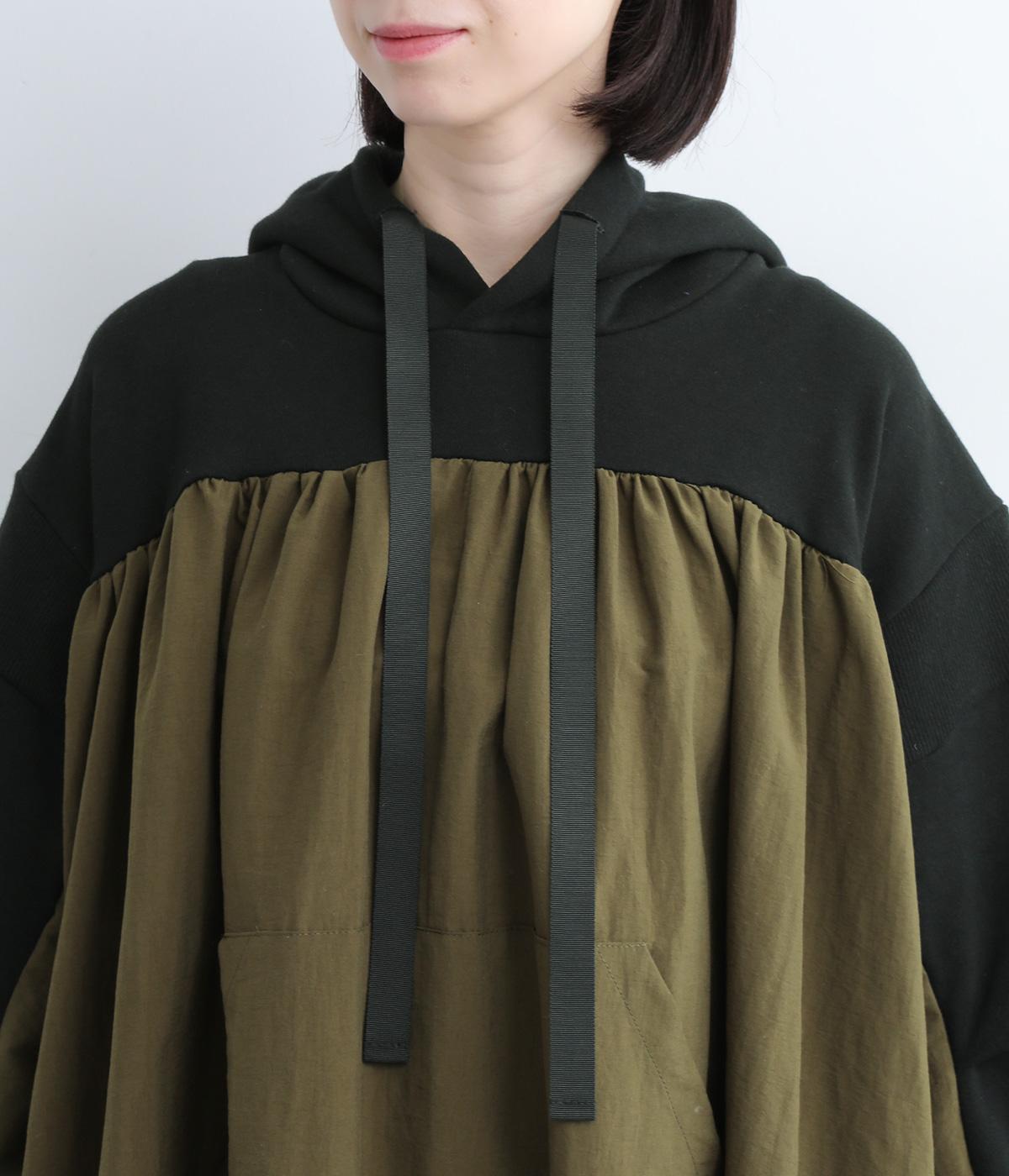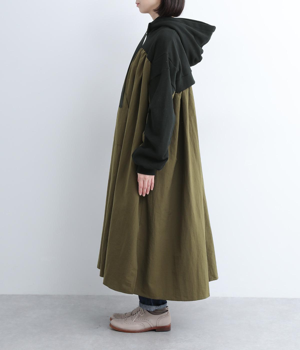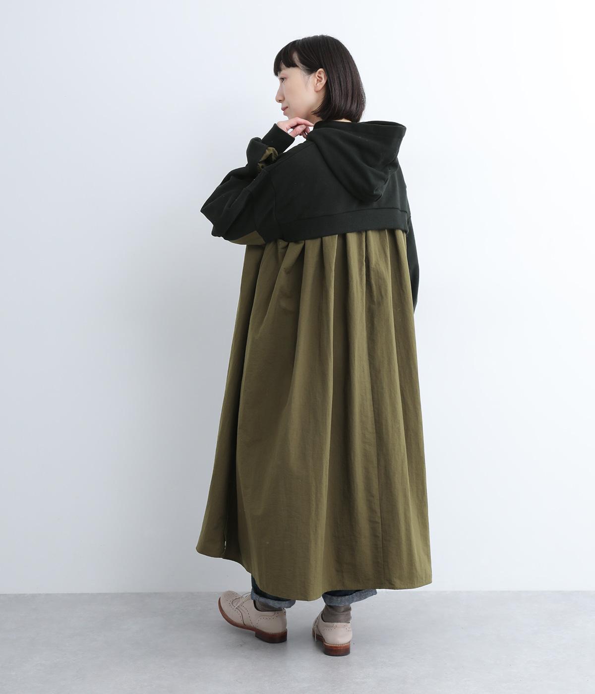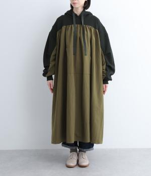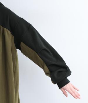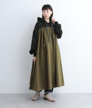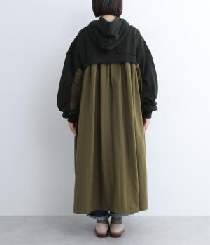 異素材ドッキングが目を惹くワンピースは、ギャザーをたっぷり寄せて分量を持たせ、存在感のある仕上がりです。スカート部分はナイロンを配しているので軽やかな仕上がりに。パンツとレイヤードしてカジュアルにまとめるのもおすすめです。