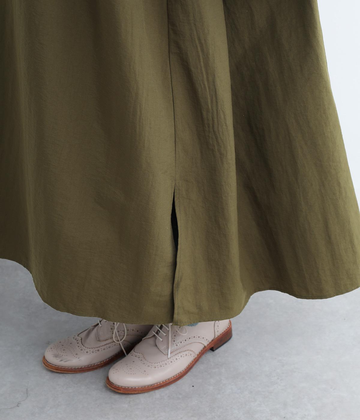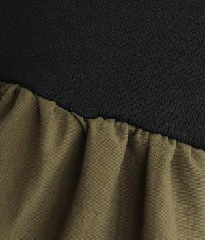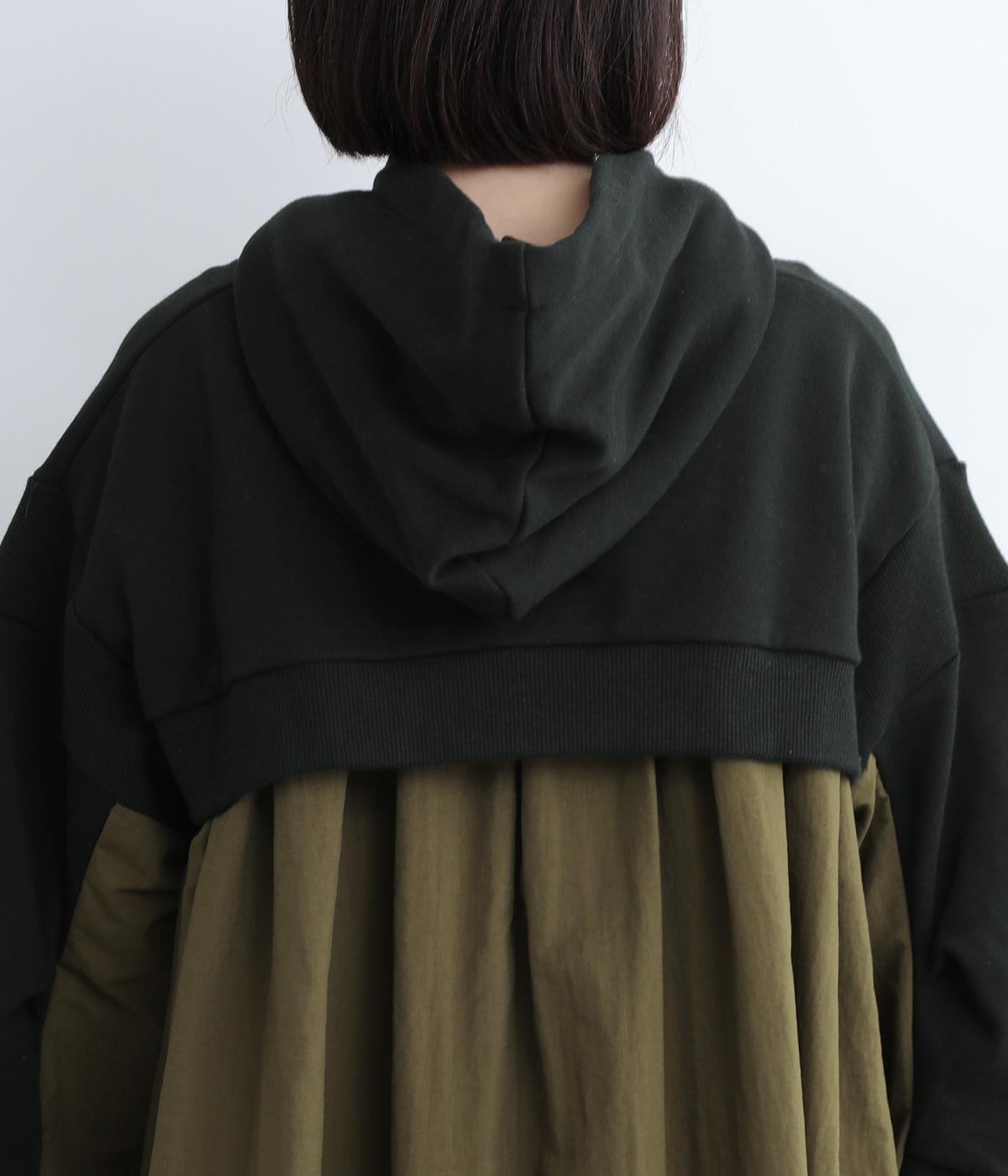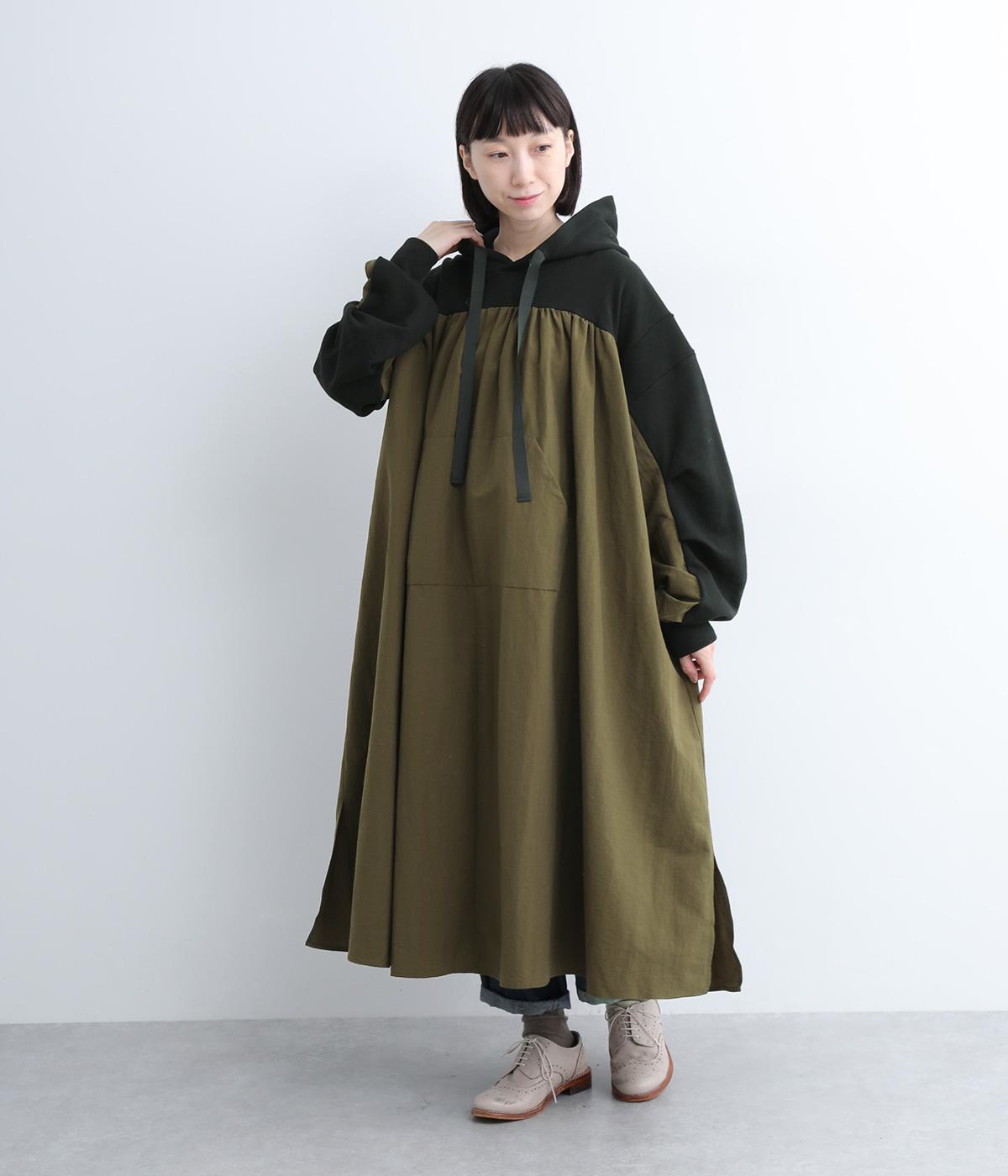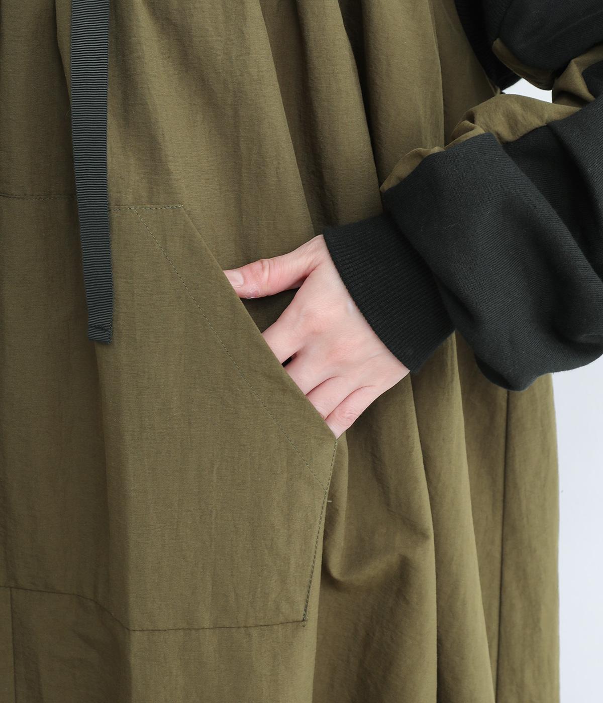 異素材ドッキングが目を惹くワンピースは、ギャザーをたっぷり寄せて分量を持たせ、存在感のある仕上がりです。スカート部分はナイロンを配しているので軽やかな仕上がりに。パンツとレイヤードしてカジュアルにまとめるのもおすすめです。