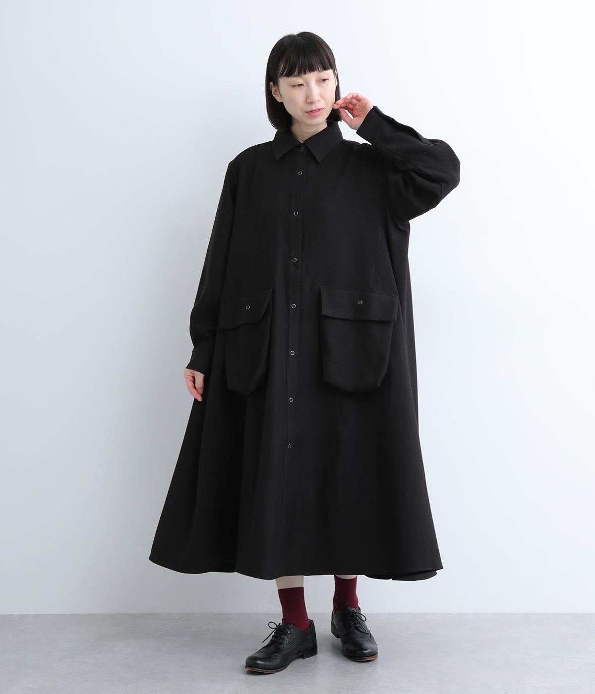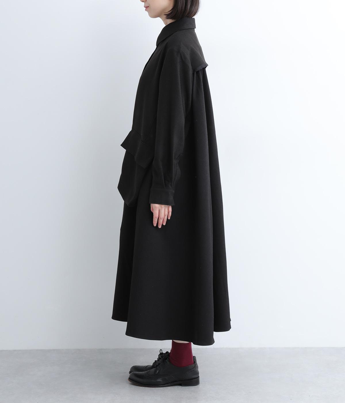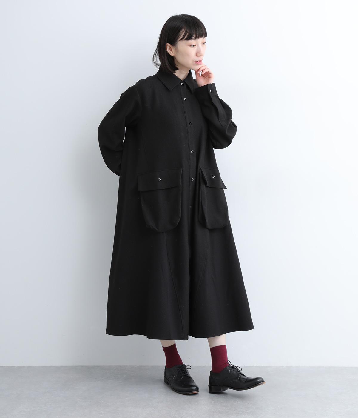 独立したフラップポケットをぶら下げたようなデザインが新鮮でインパクトのある一枚。フレアに広がるAラインシルエットで優雅な印象を与えながらも、ディテールでカジュアル&モードに仕上げています。着こなし次第でクラシカルにもたのしめます。