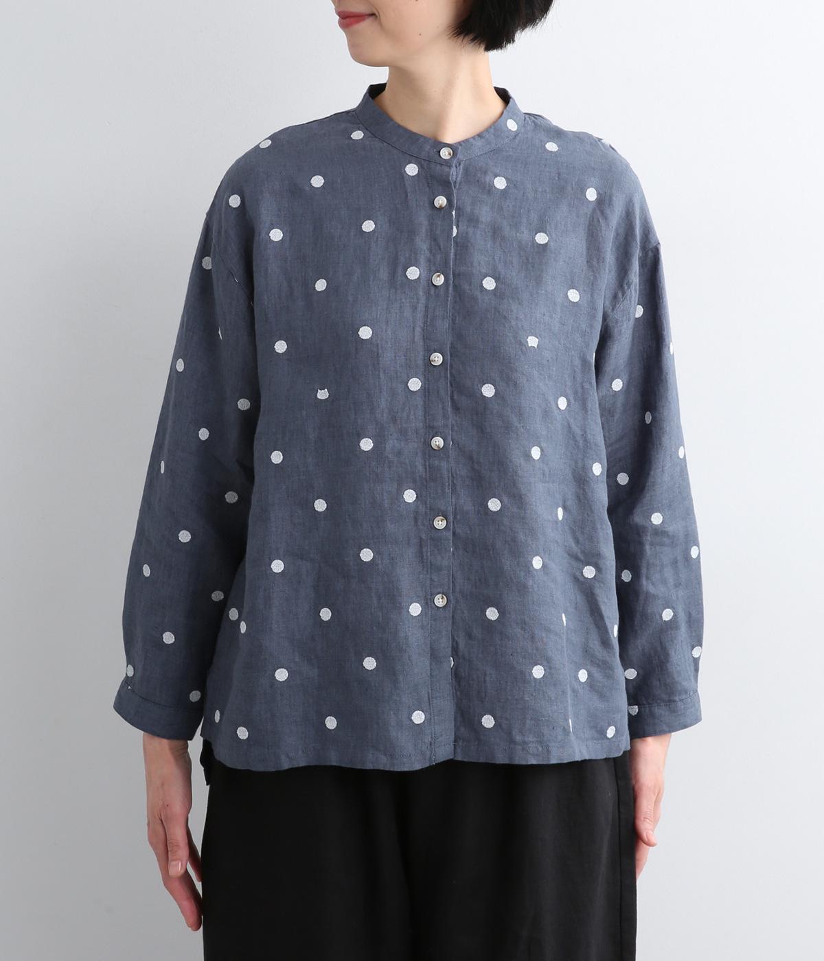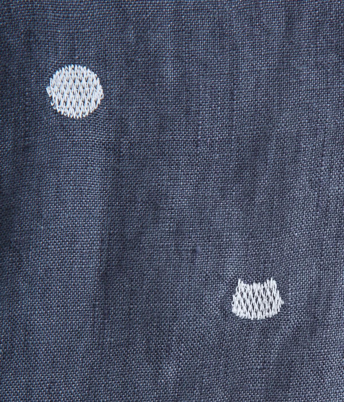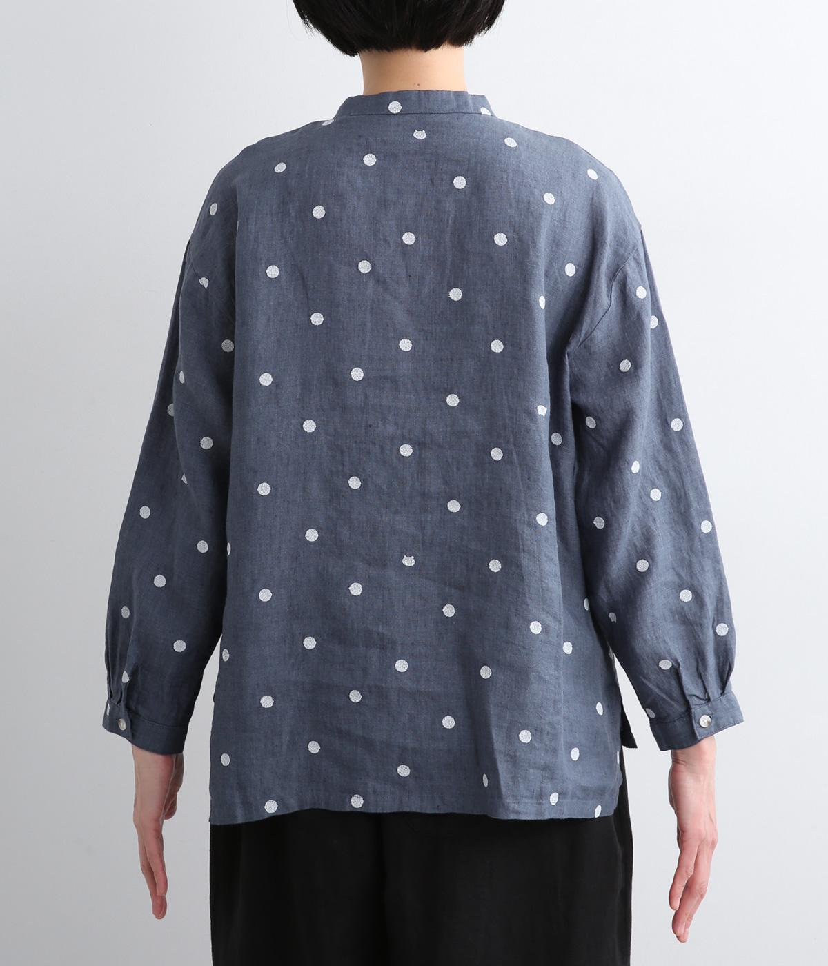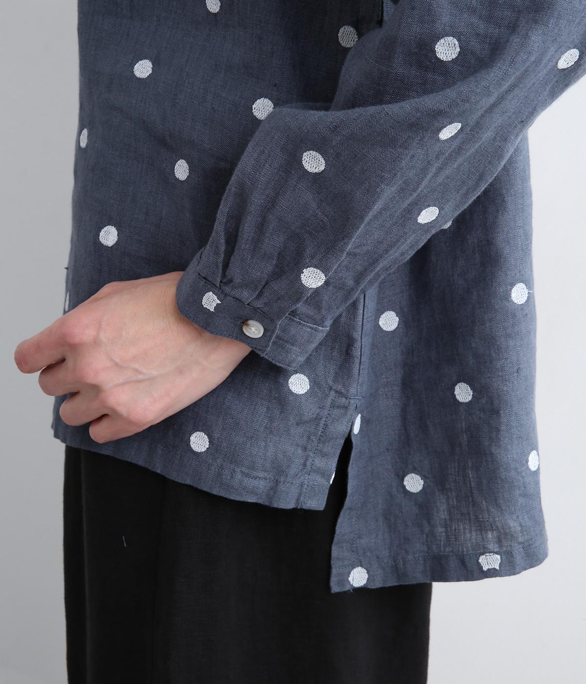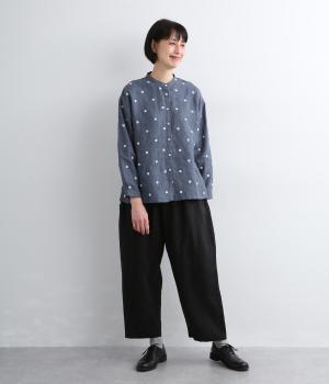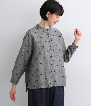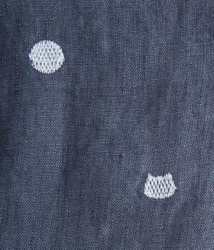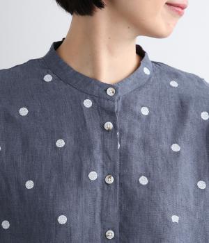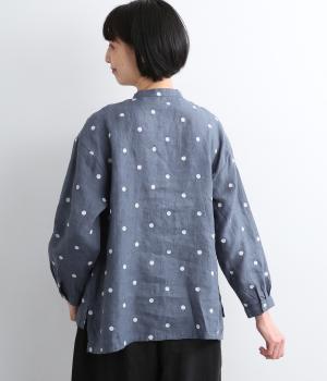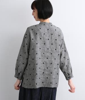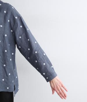 シンプルなドット刺しゅうと思いきや、ところどころがネコモチーフになった遊び心のある柄になっています。襟裏と袖口カフス裏は配色布になっていて、袖口カフスは折り返して配色を楽しめる仕様です。羽織って合わせるのもおすすめ。