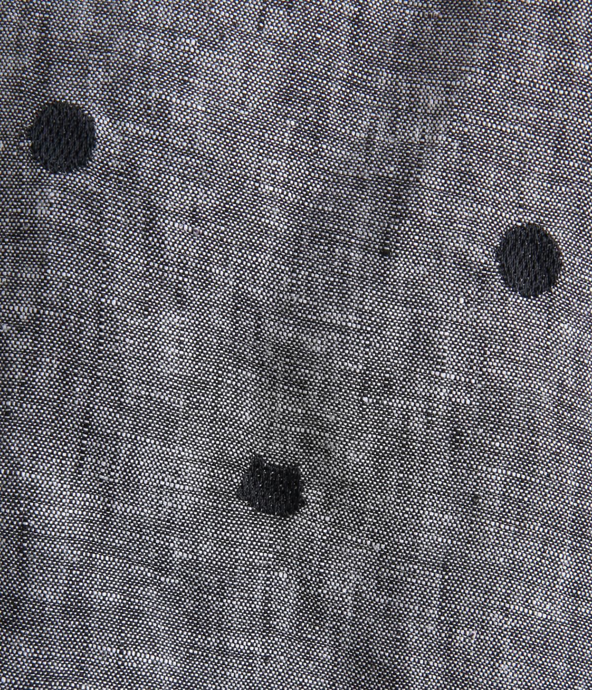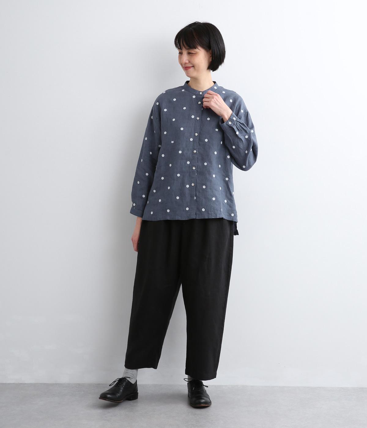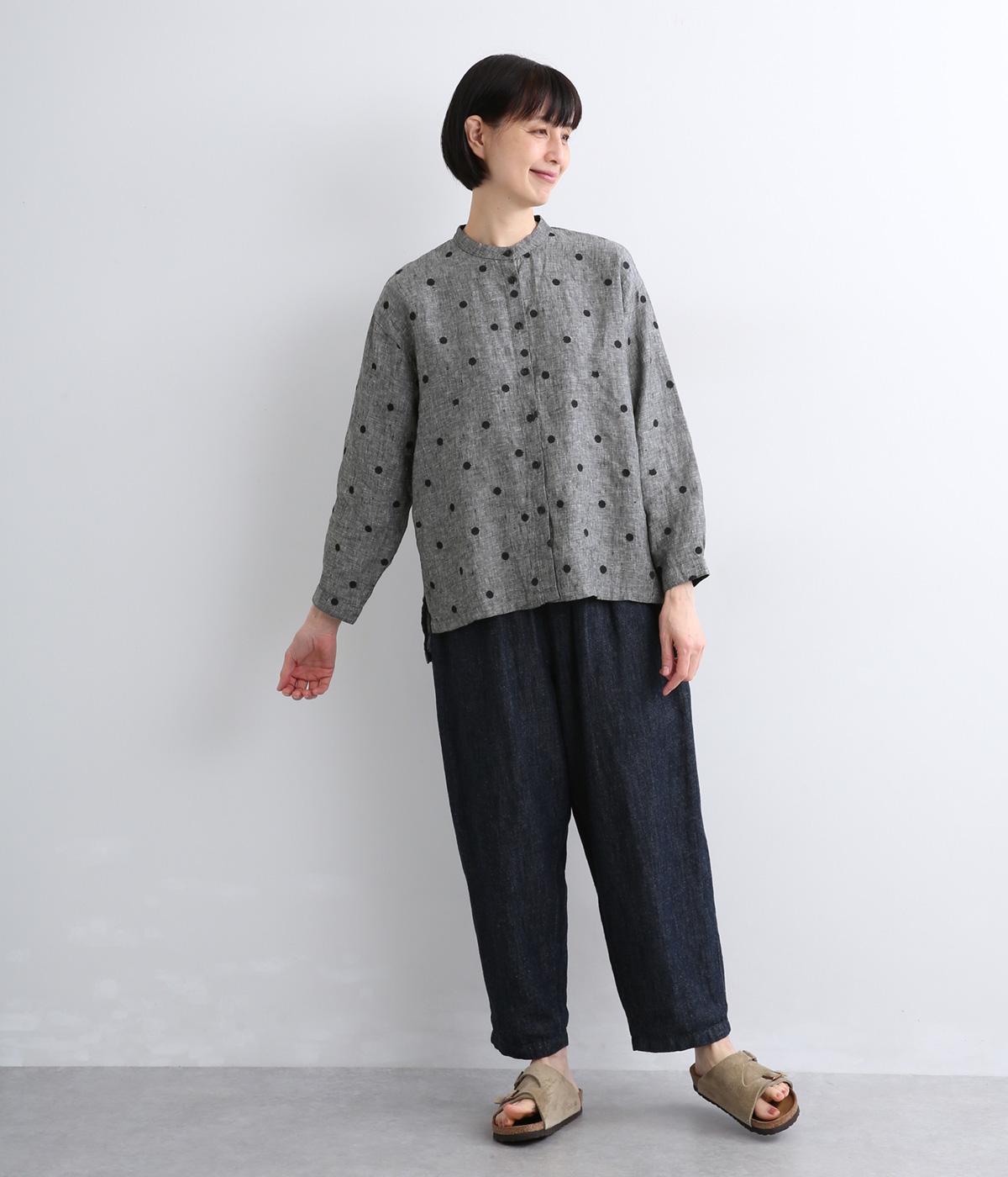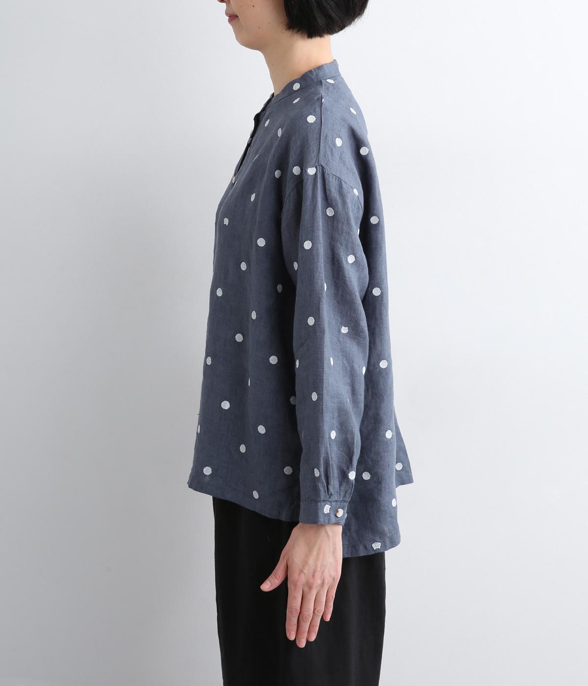 シンプルなドット刺しゅうと思いきや、ところどころがネコモチーフになった遊び心のある柄になっています。襟裏と袖口カフス裏は配色布になっていて、袖口カフスは折り返して配色を楽しめる仕様です。羽織って合わせるのもおすすめ。