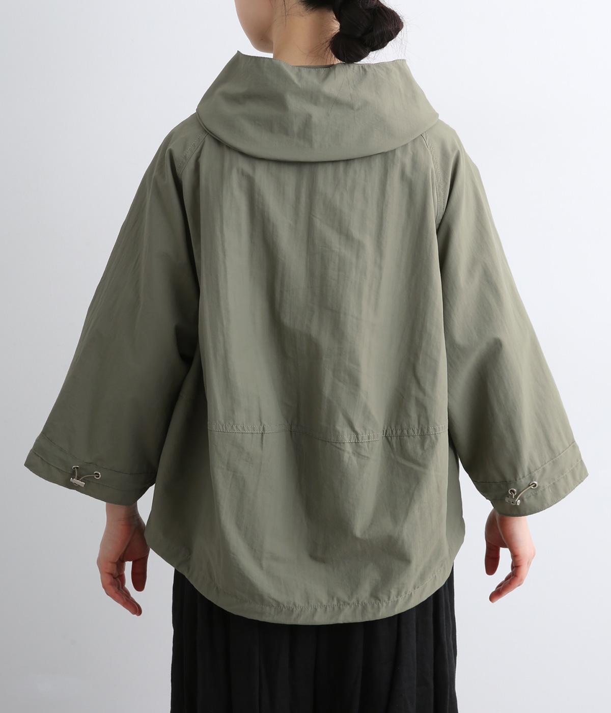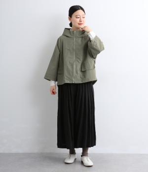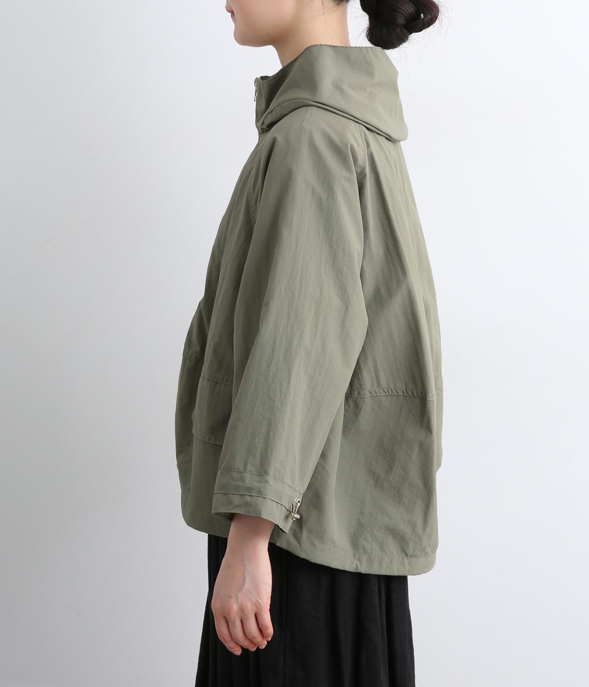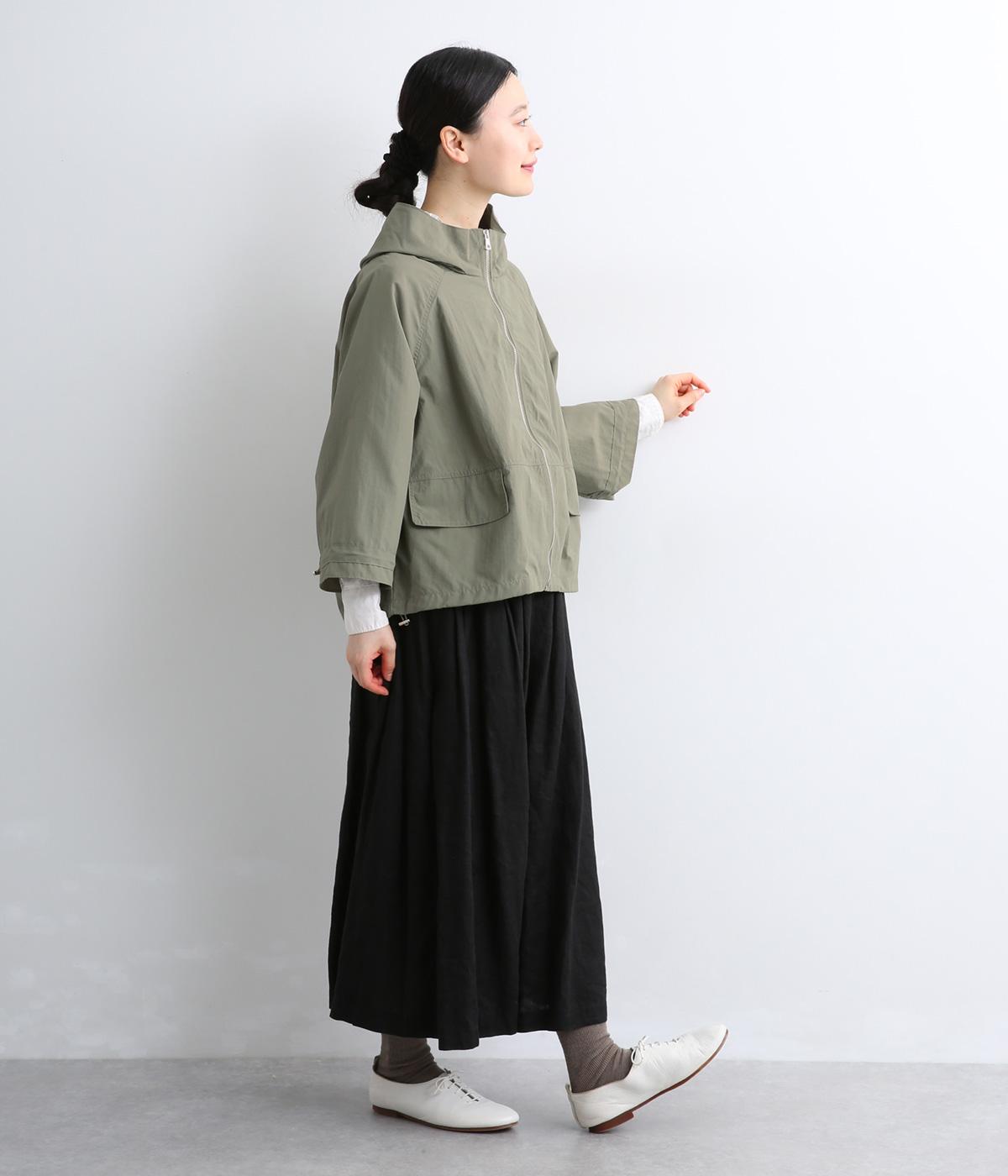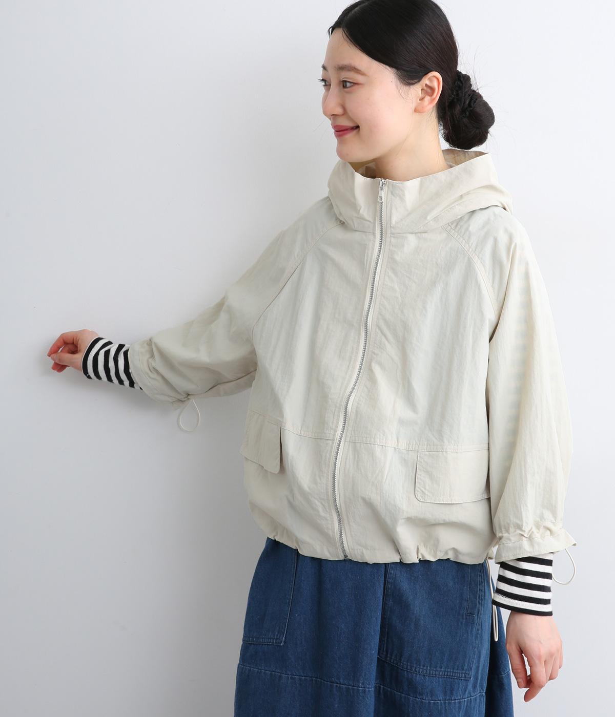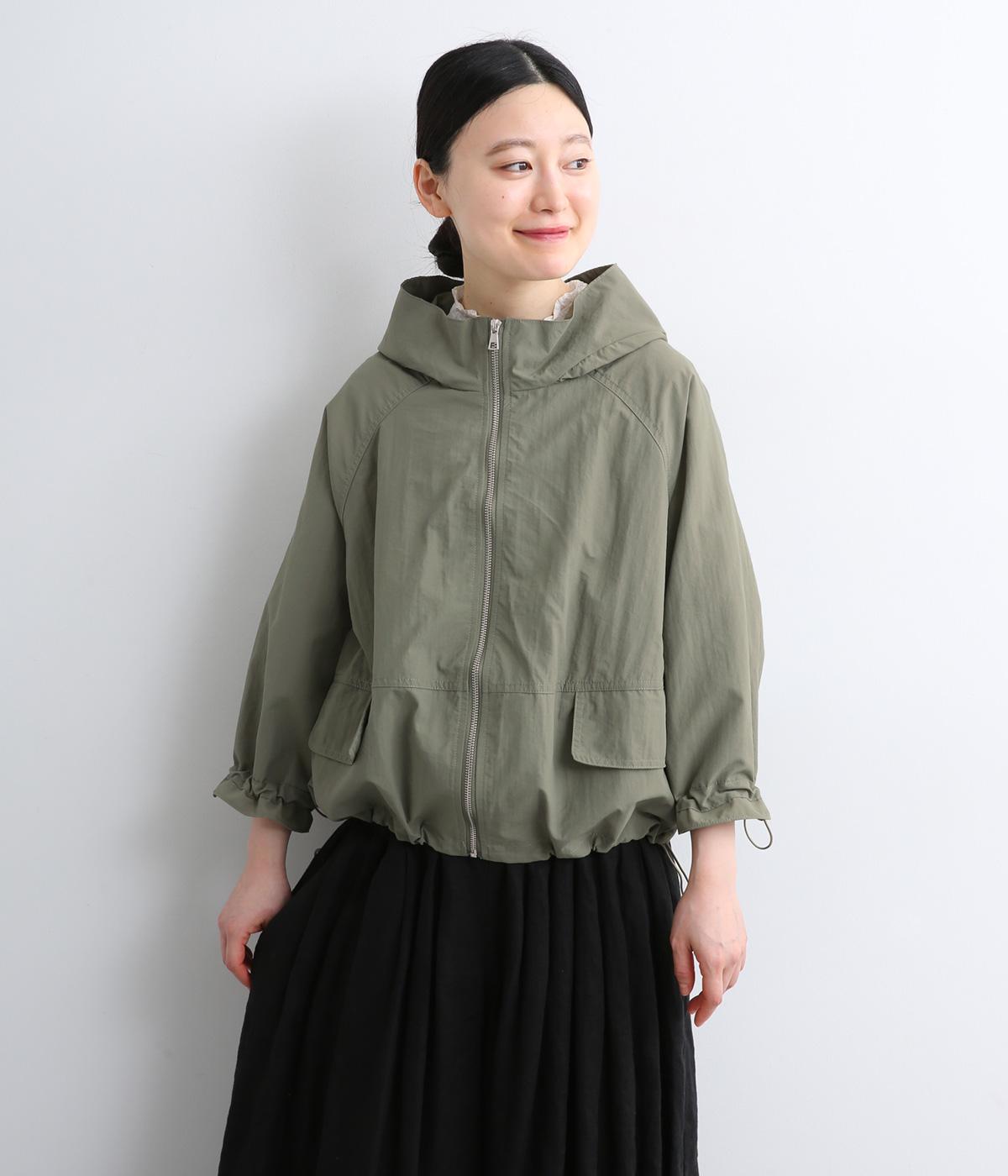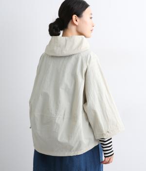 タフな印象の素材を用いながらも、ラグラン袖や丸みをつけられるアジャスターコードで女性らしさを感じるパーカーに。ハイネックのフードは防寒やアイキャッチにも。ショート丈でバランスよくまとめました。
