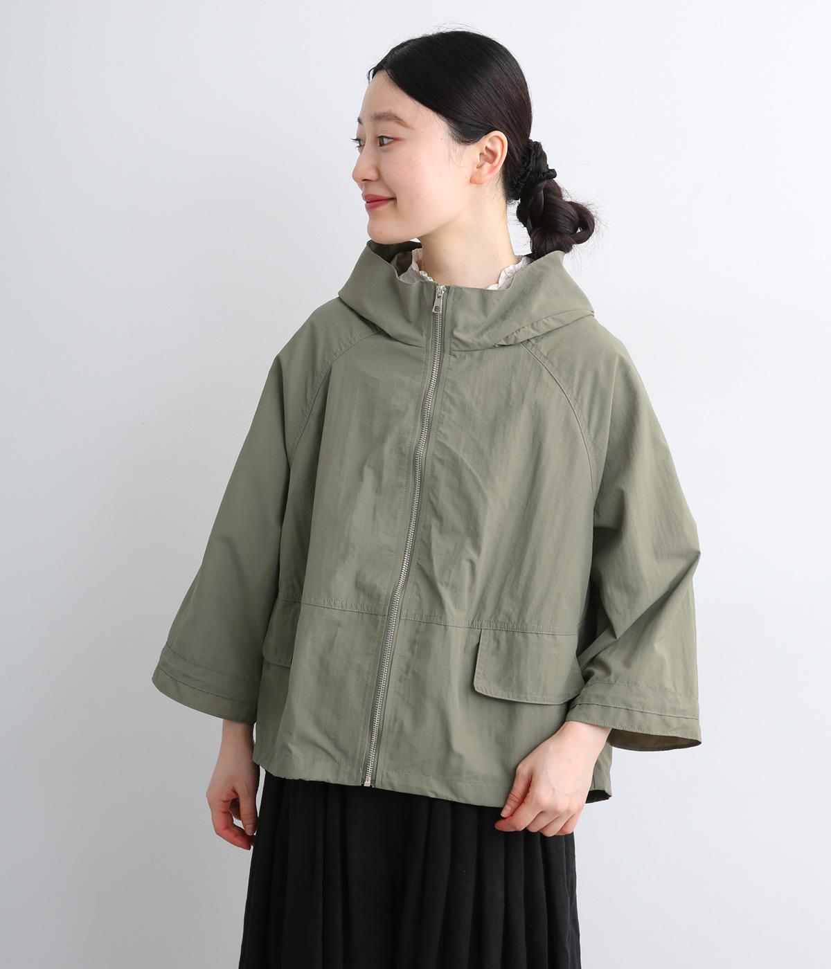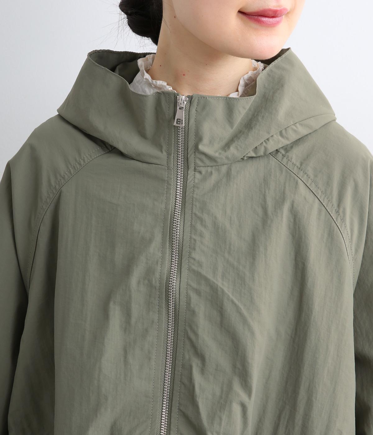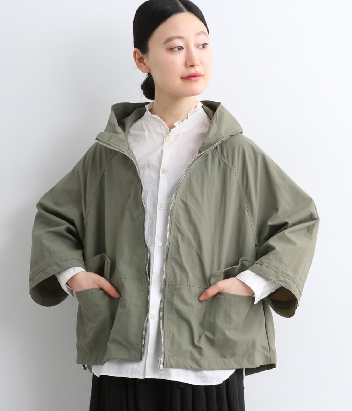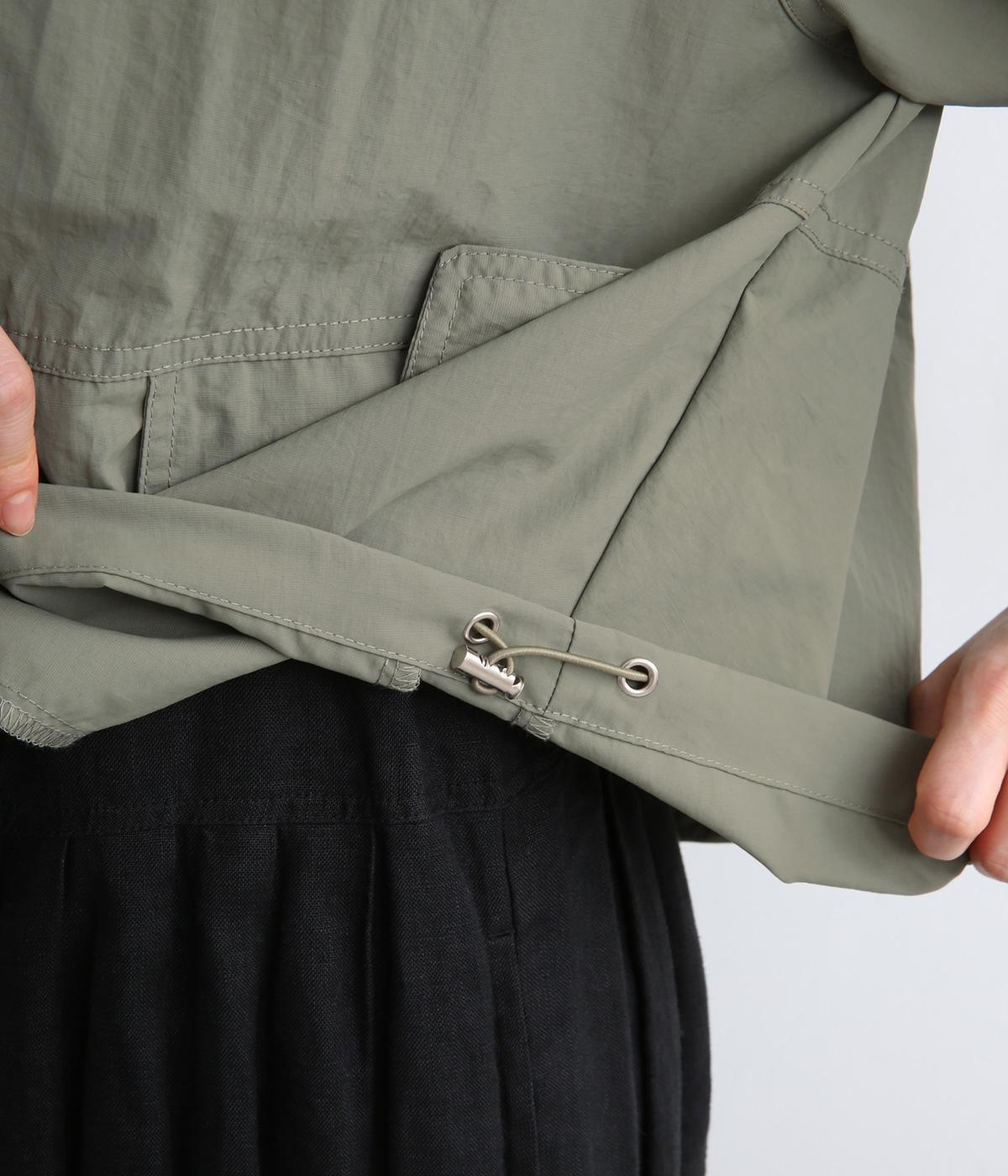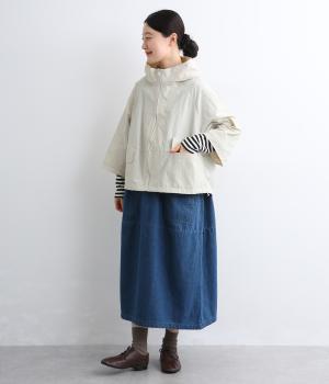 タフな印象の素材を用いながらも、ラグラン袖や丸みをつけられるアジャスターコードで女性らしさを感じるパーカーに。ハイネックのフードは防寒やアイキャッチにも。ショート丈でバランスよくまとめました。