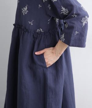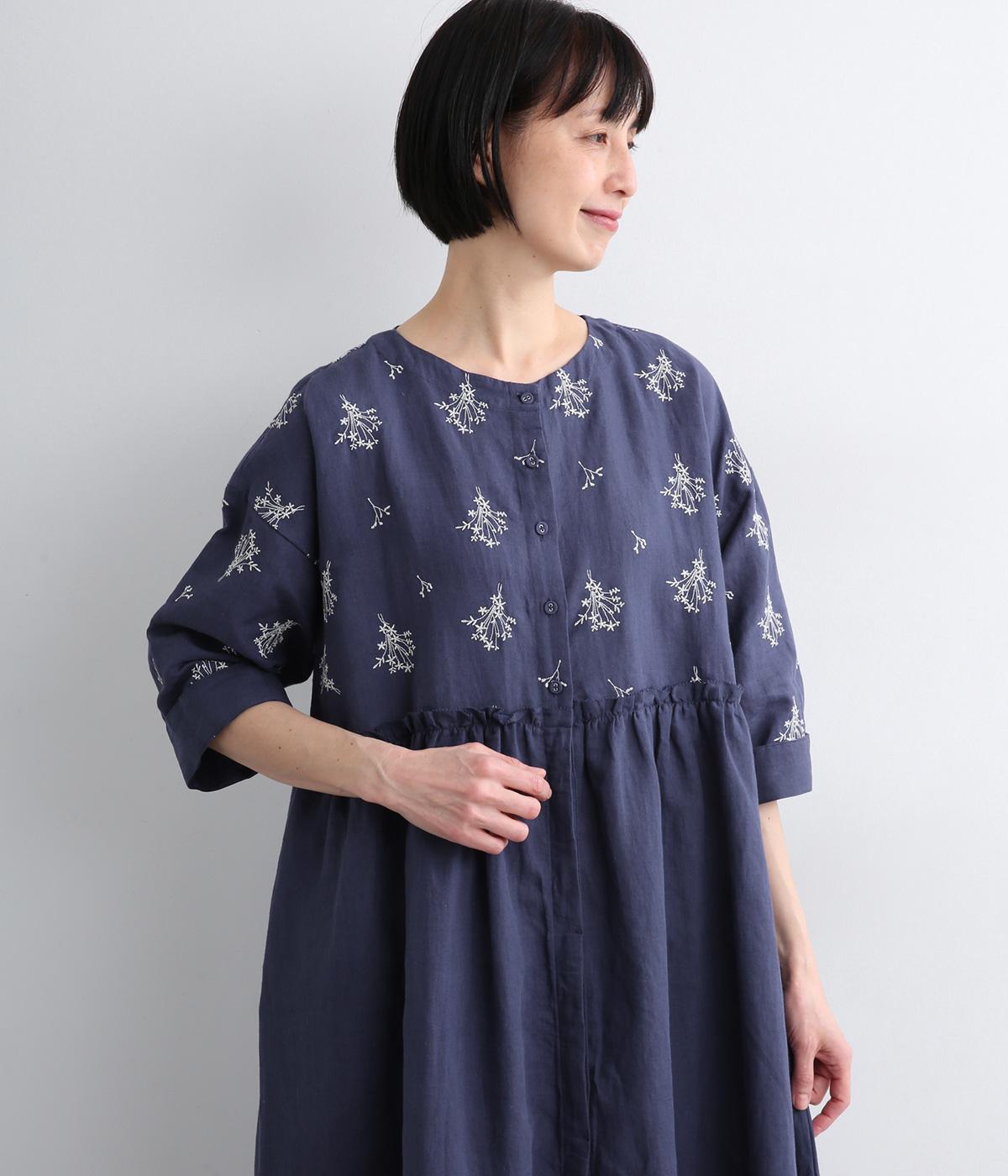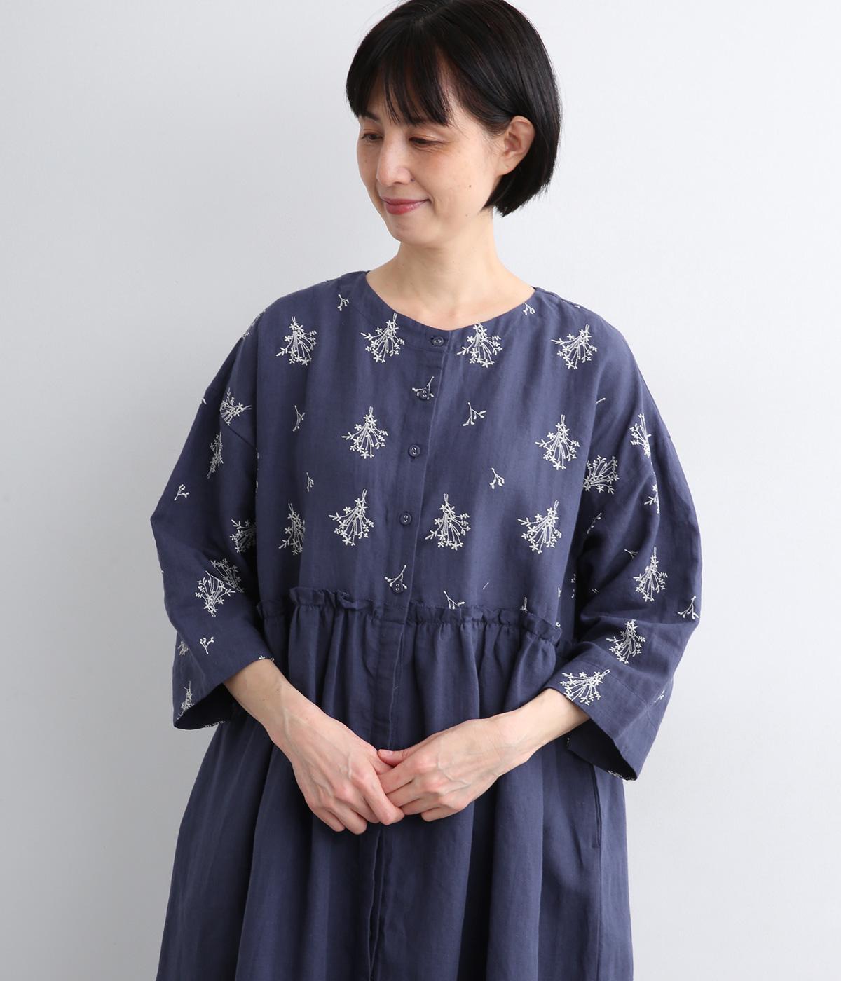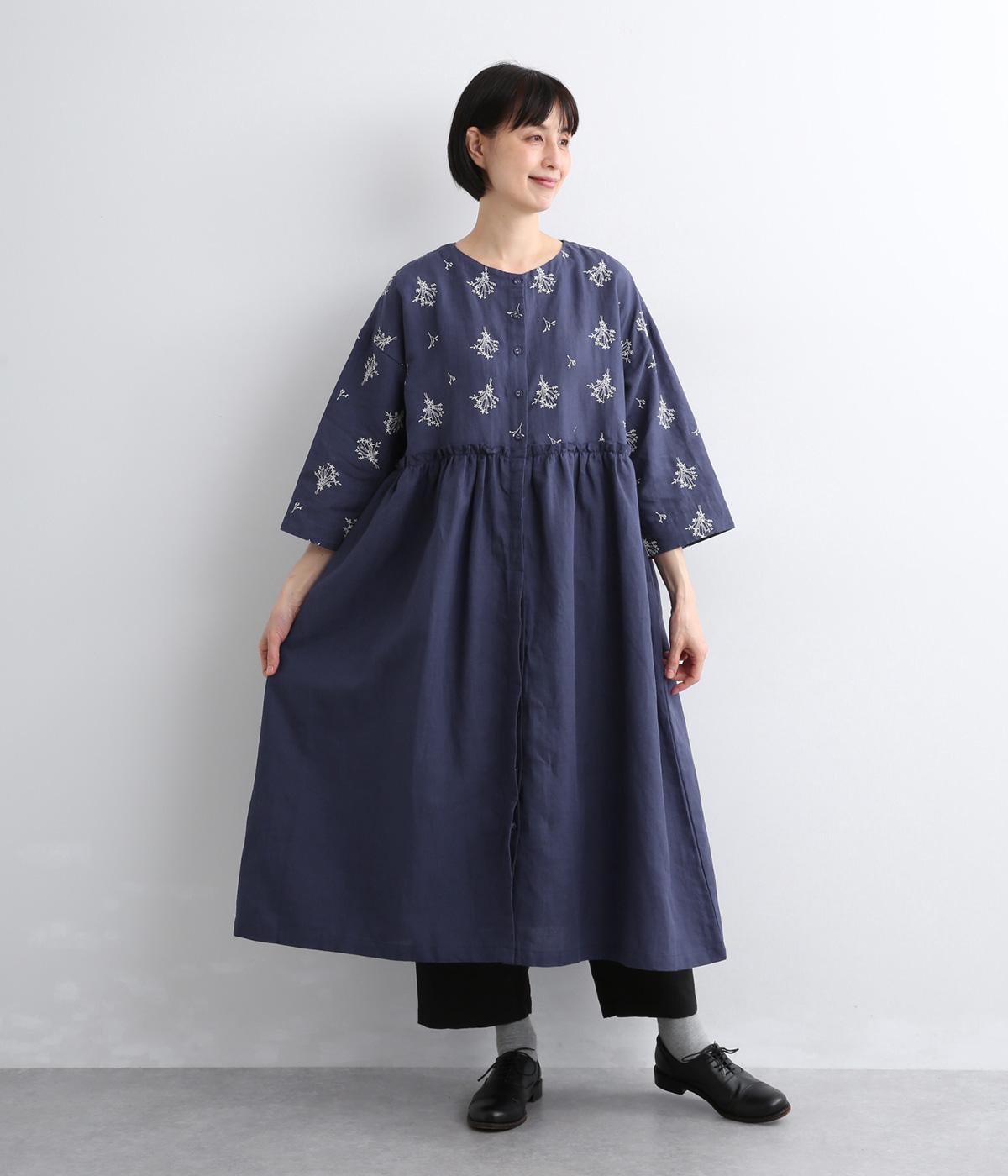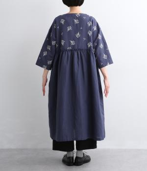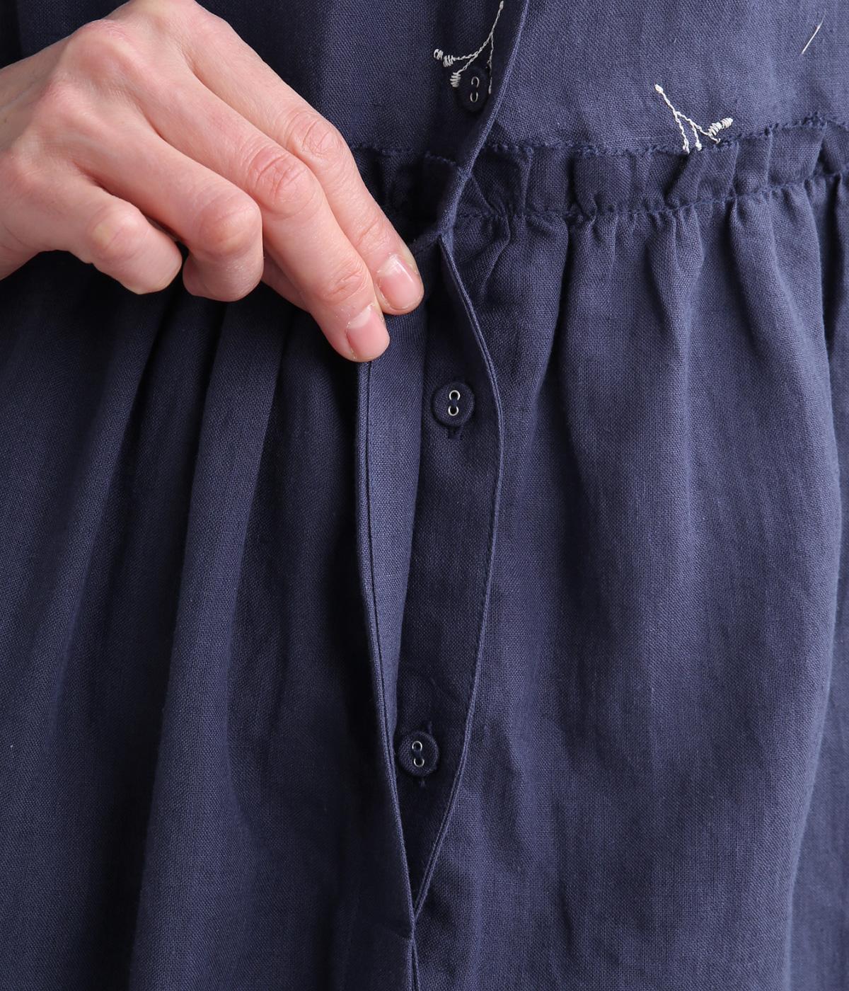 リネンボタニカル刺繍切替え前開きワンピース(ネイビー-F)