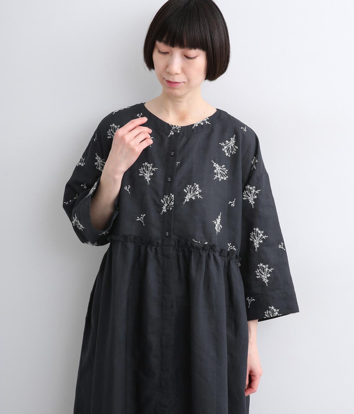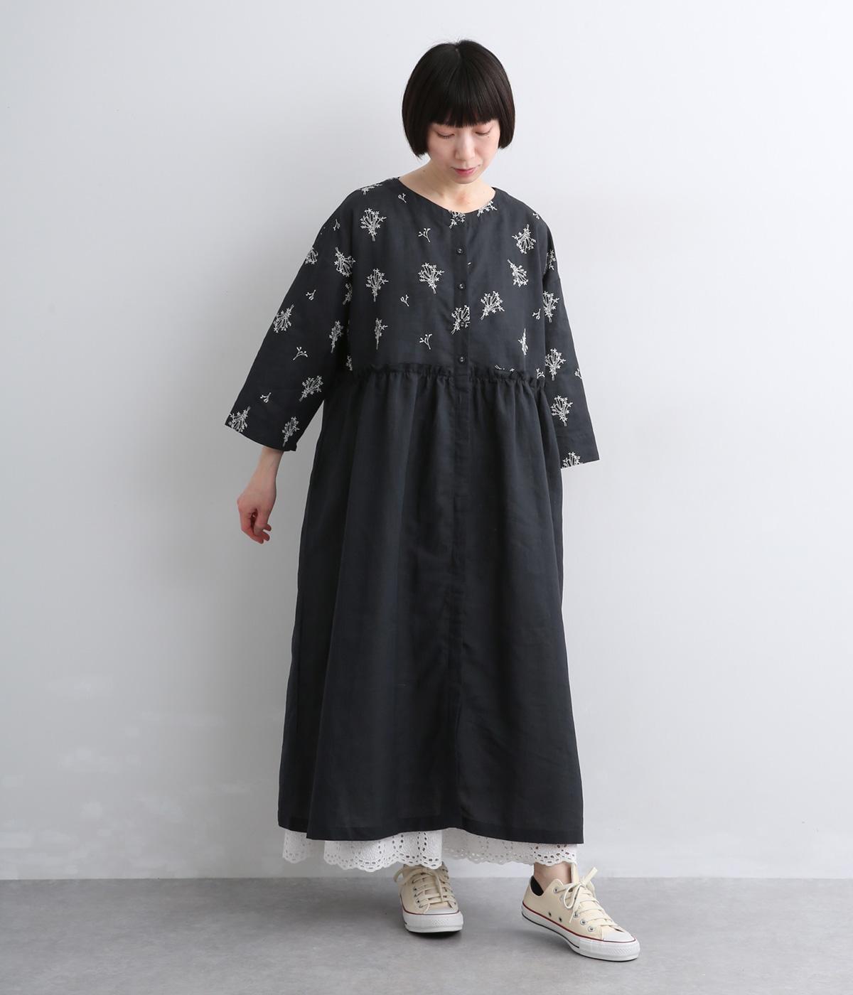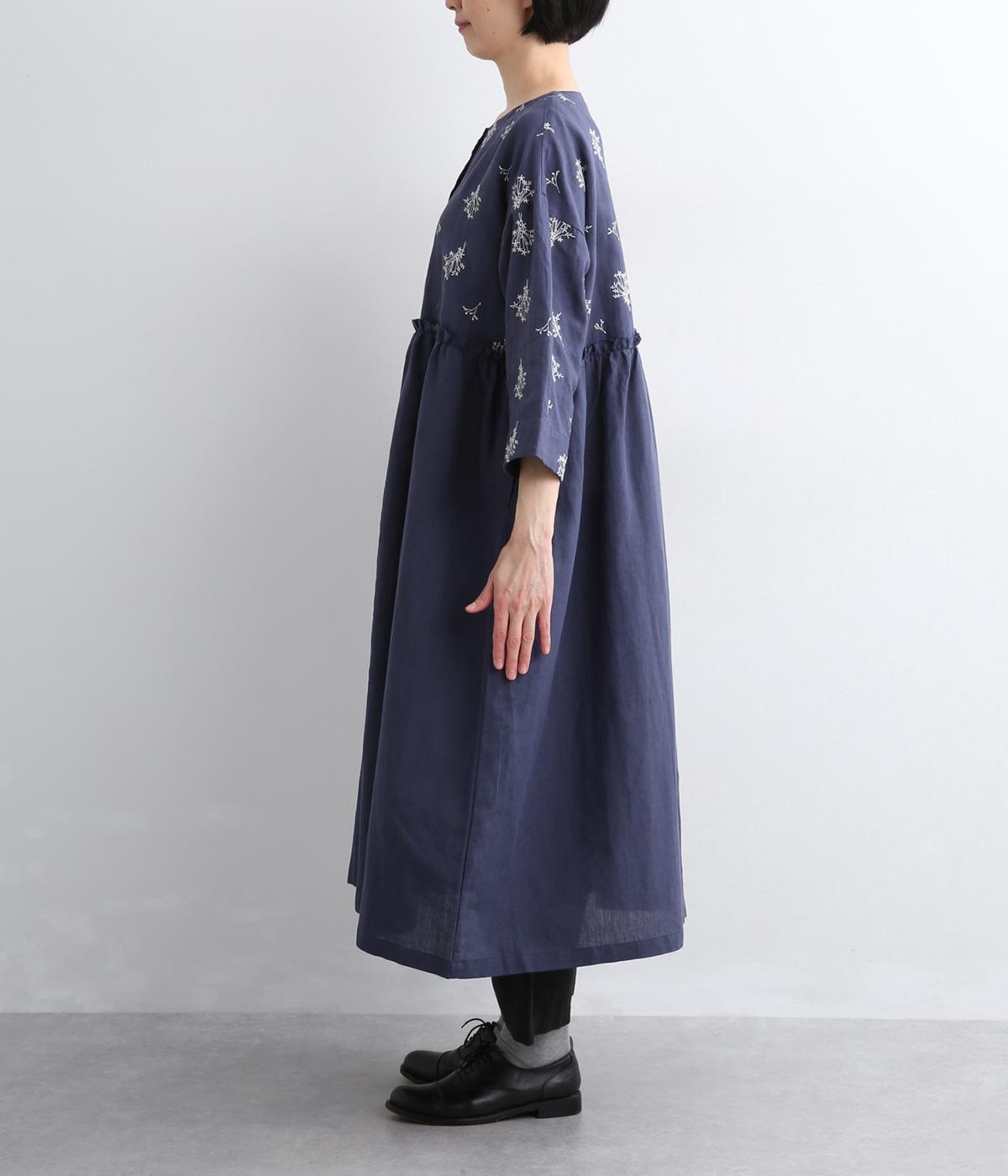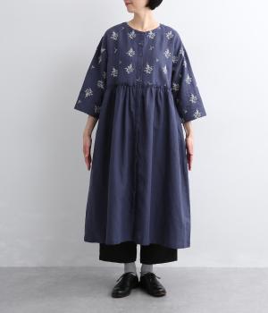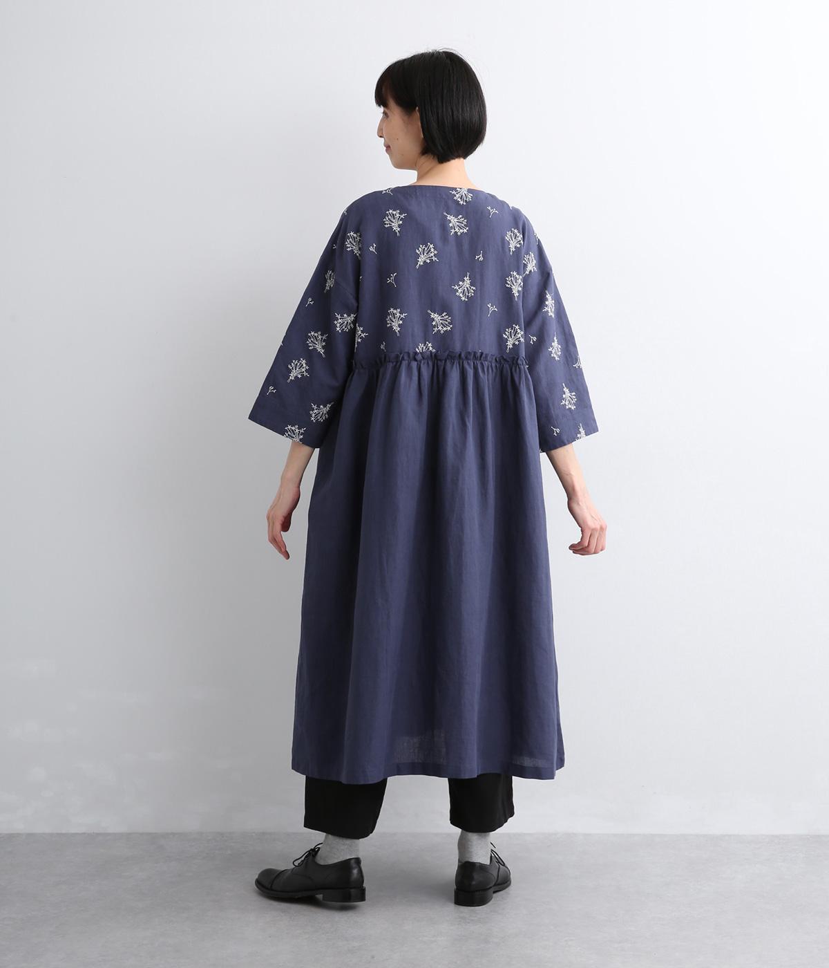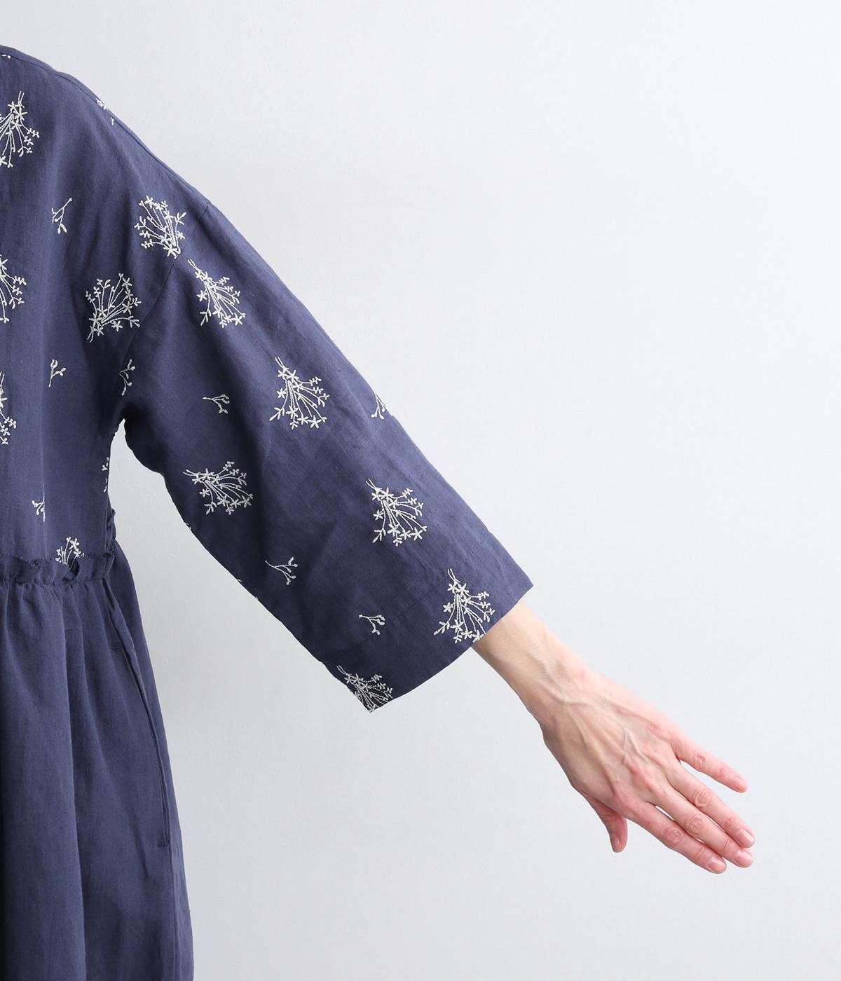 リネンボタニカル刺繍切替え前開きワンピース(ネイビー-F)