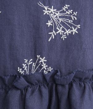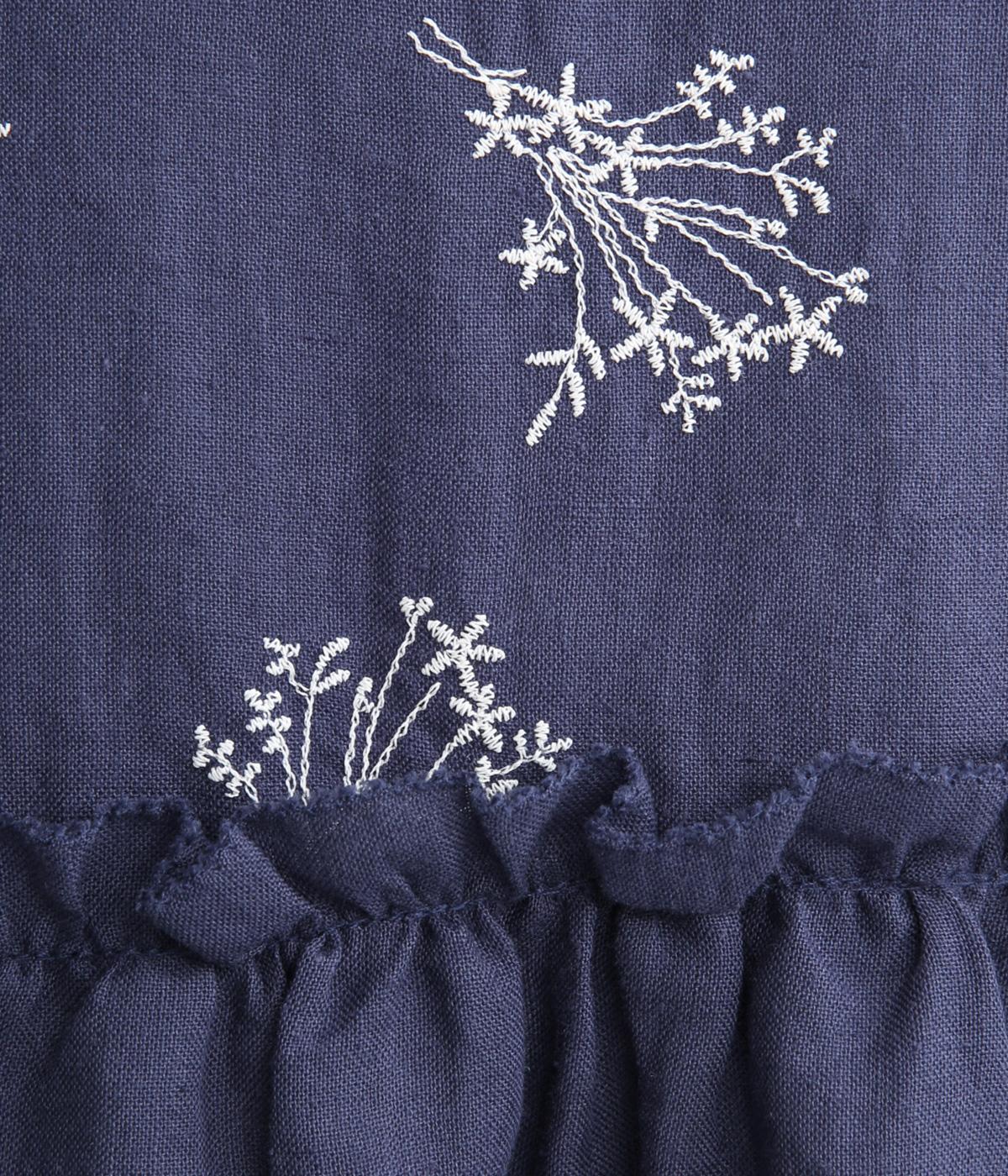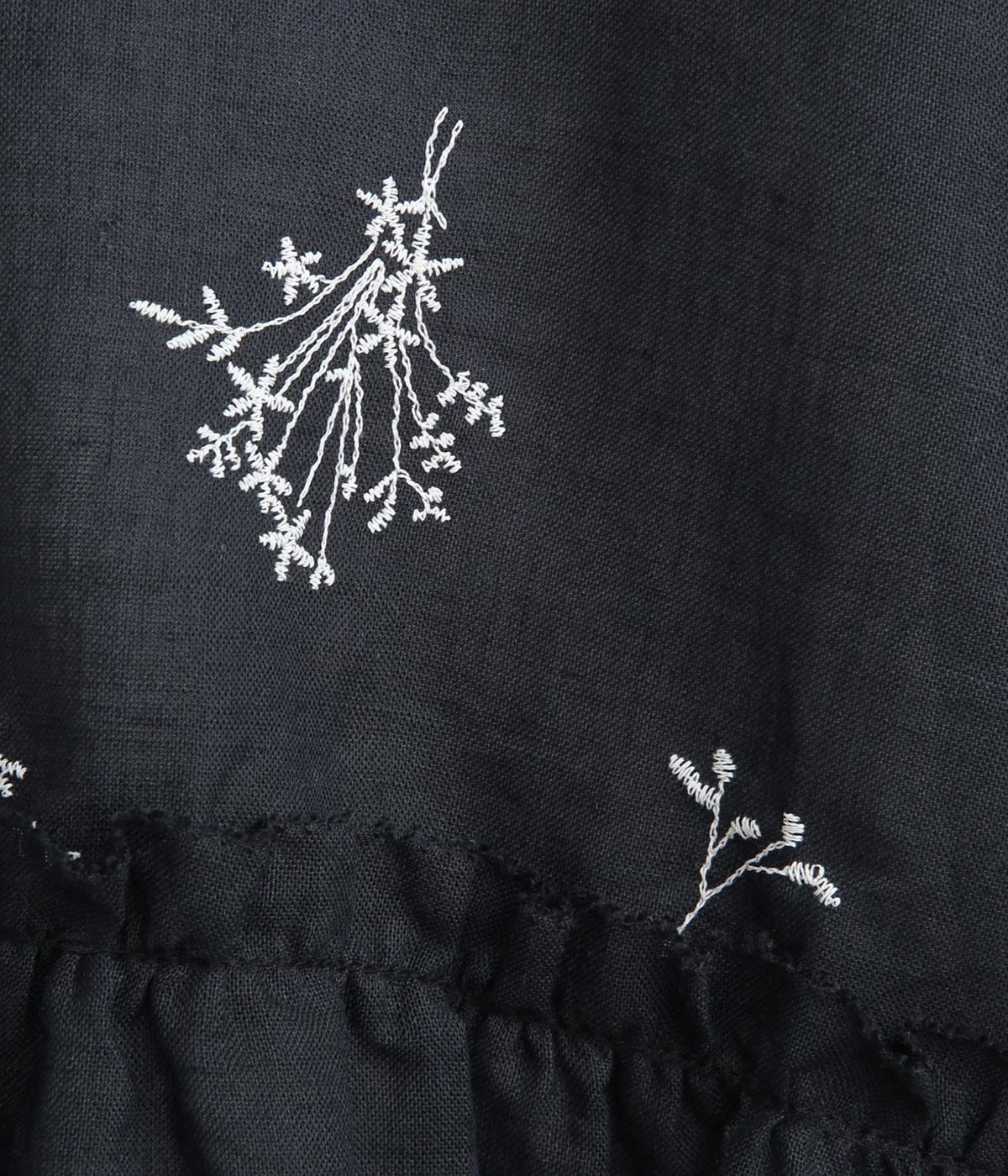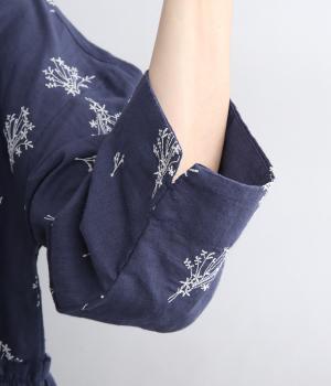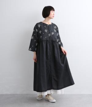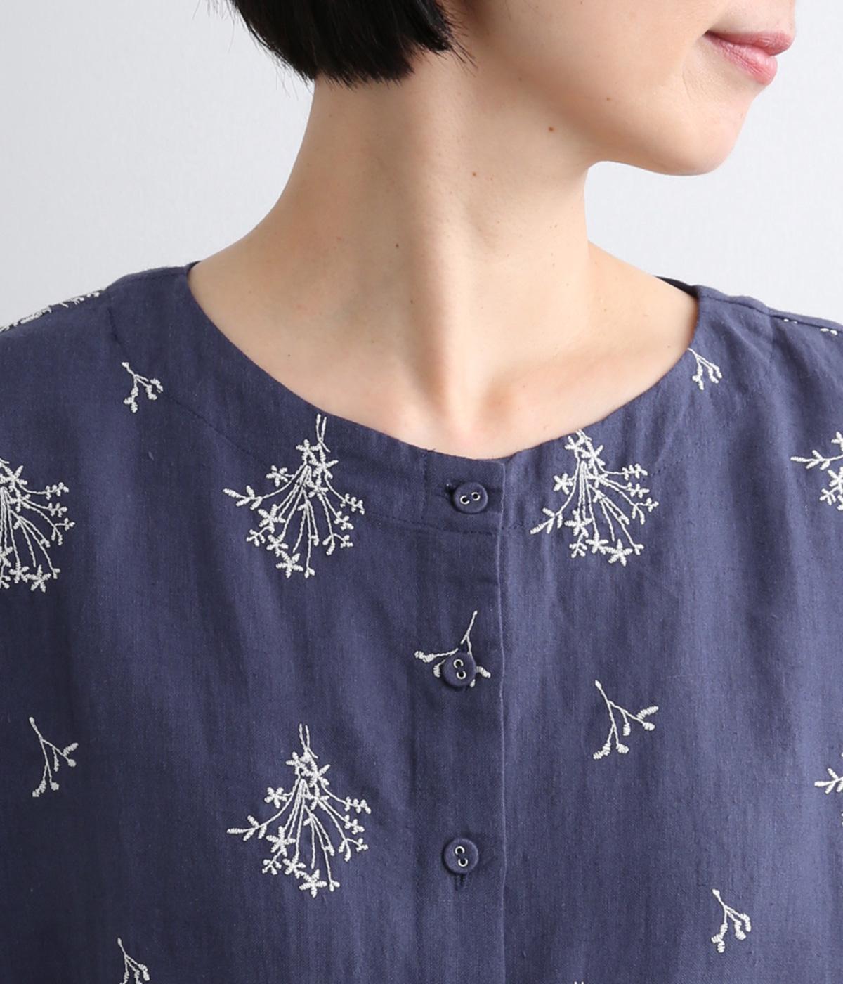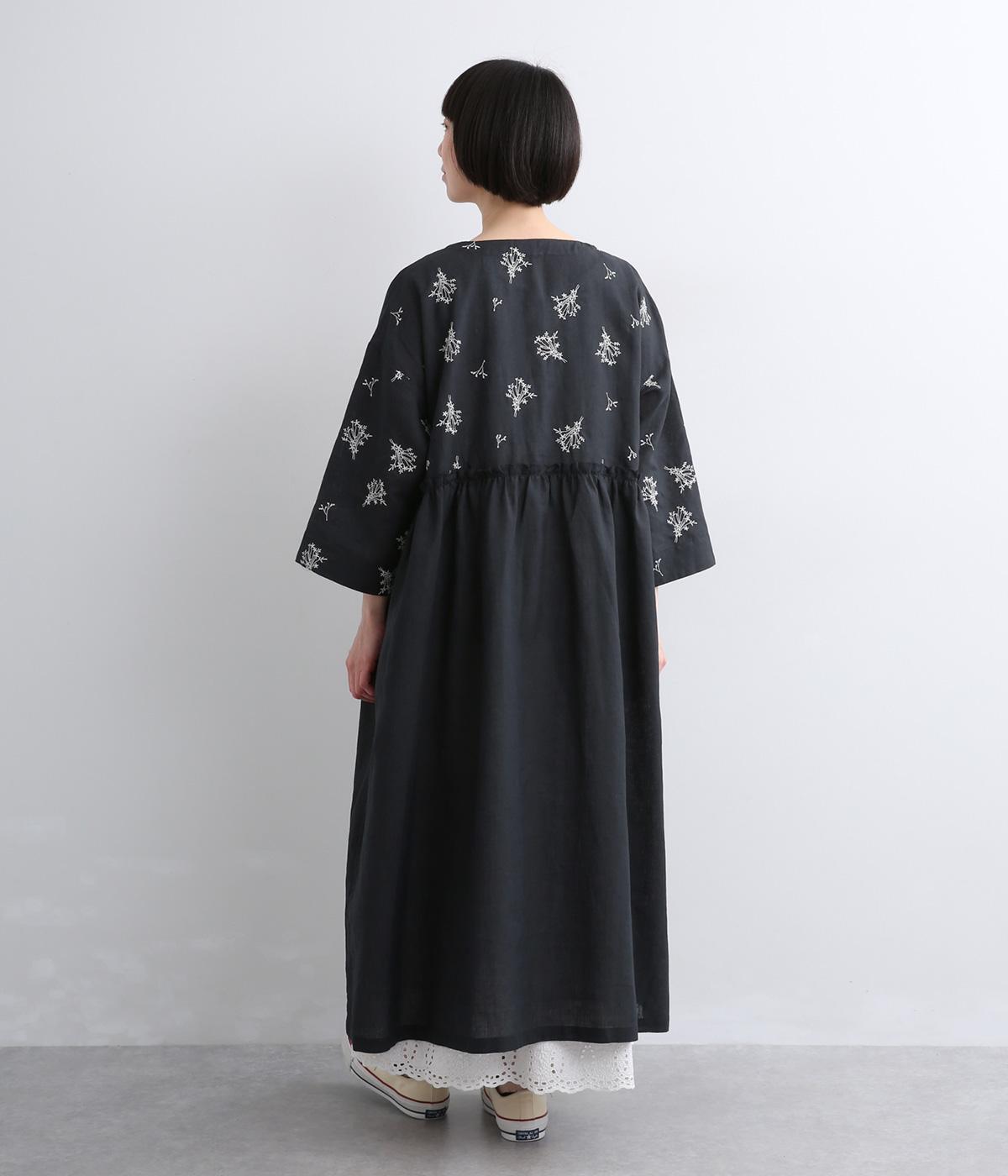 リネンボタニカル刺繍切替え前開きワンピース(ネイビー-F)