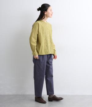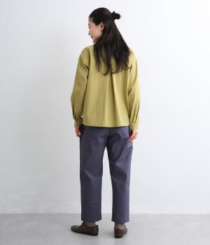 コットンに少量のポリウレタンをまぜてストレッチ性を持たせました。やわらかで動きに寄り添ってくれるのでデイリー使いに最適。季節問わず活躍する生地感です。