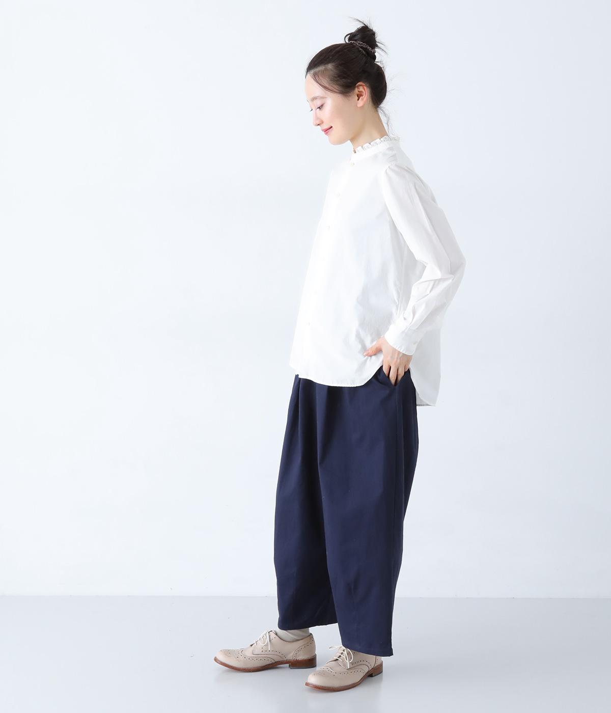 ウエスト下のタックや裾のダーツが立体的なシルエットをうむコクーンパンツ。体のラインを拾いにくいゆとりのあるフォルムが◎です。丈はやや短めに設定しているのでボリュームがありつつも好バランスな着こなしに。ウエストにはゴムと紐をぐるりと通してイージーな着用感にもこだわっています。