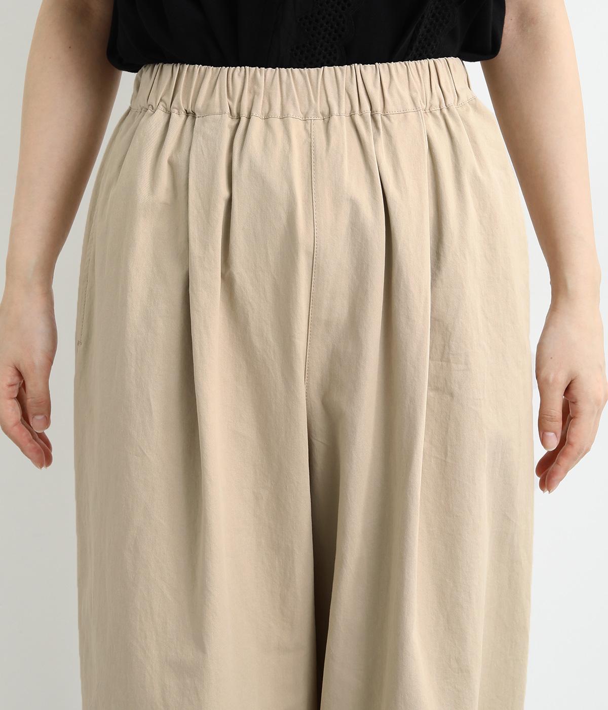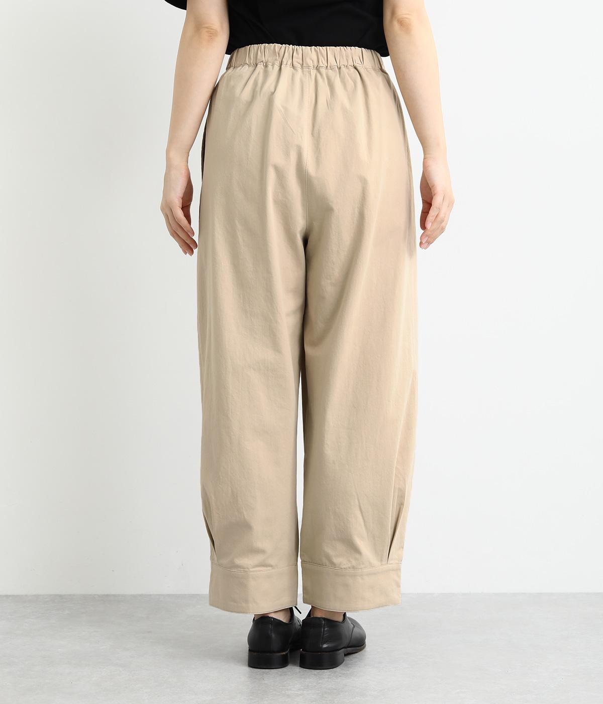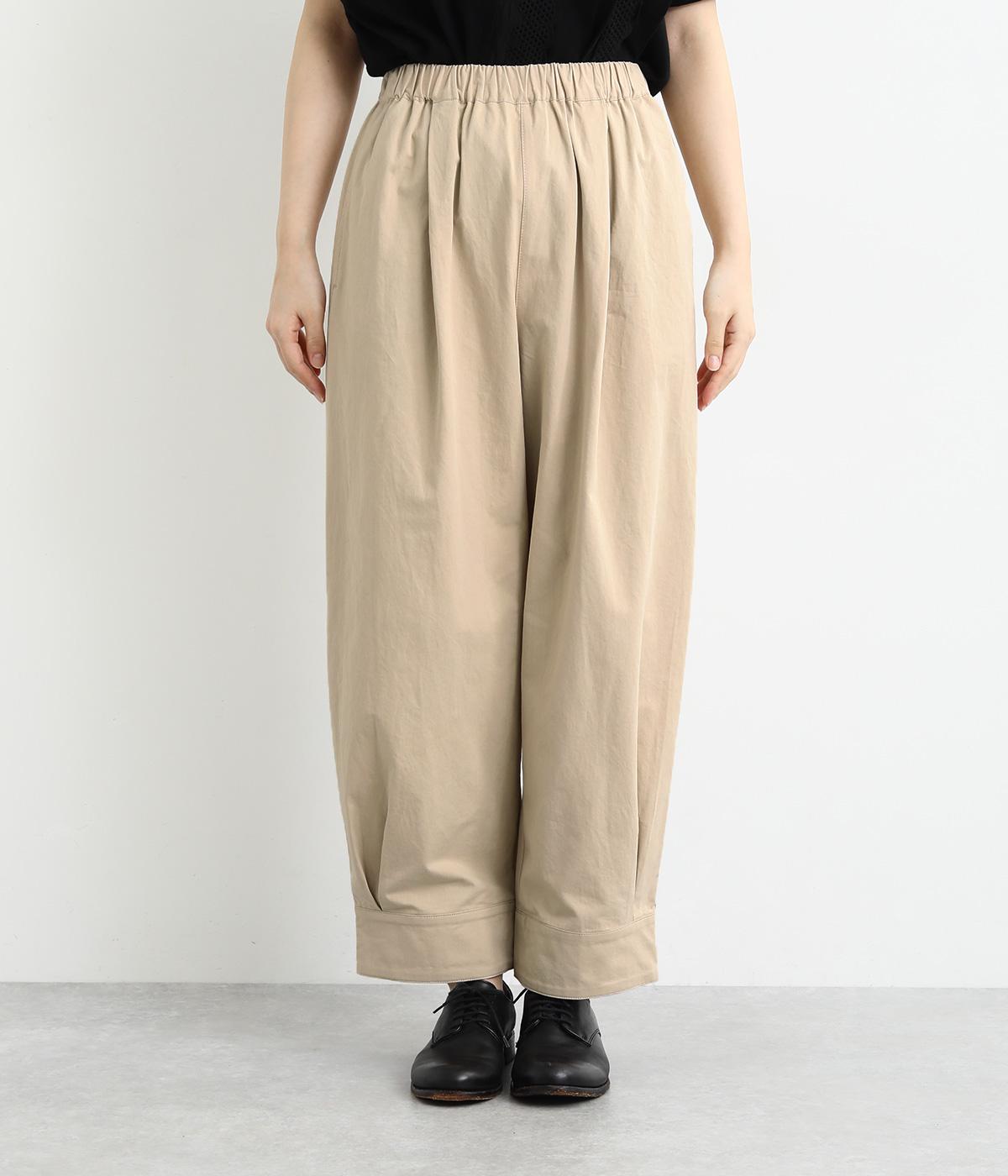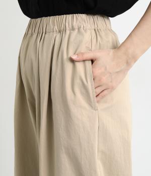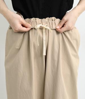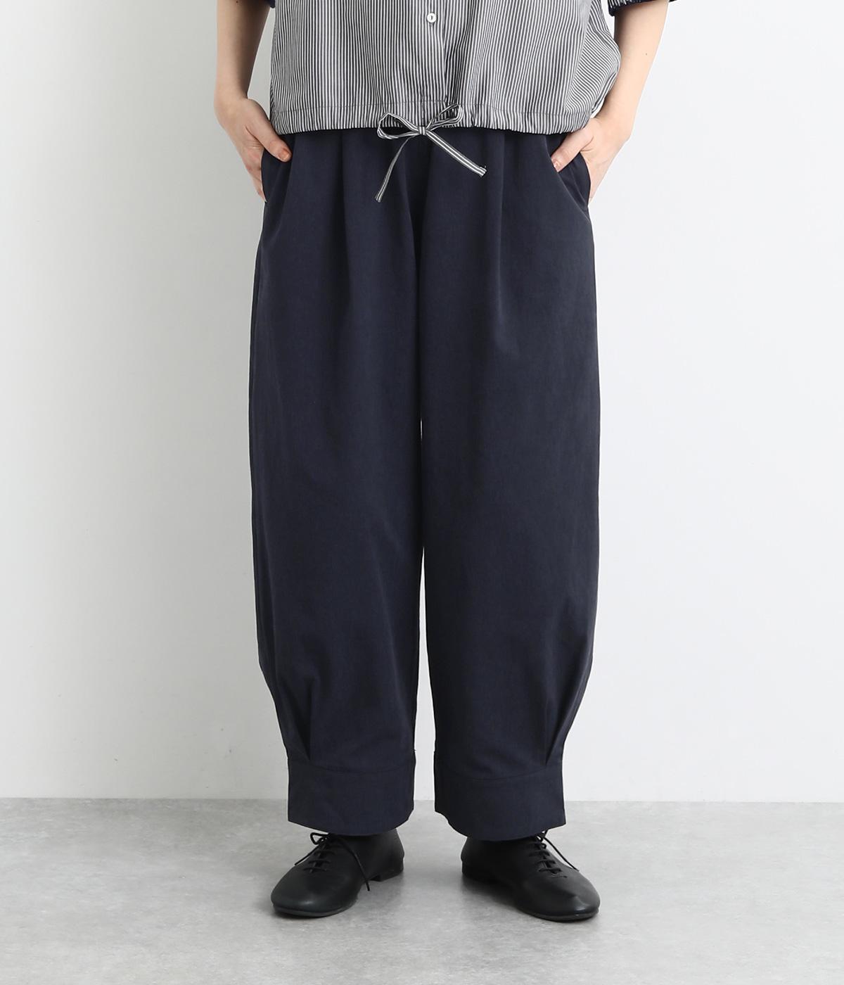 裾をまとめてタックを入れた、立体感のあるコクーンシルエット。ヒップから太ももまわりはゆったりとした作りで、脚のラインをひろわずにすっきりと見せてくれます。ウエストは総ゴム&内ヒモつきのリラックス仕様です。