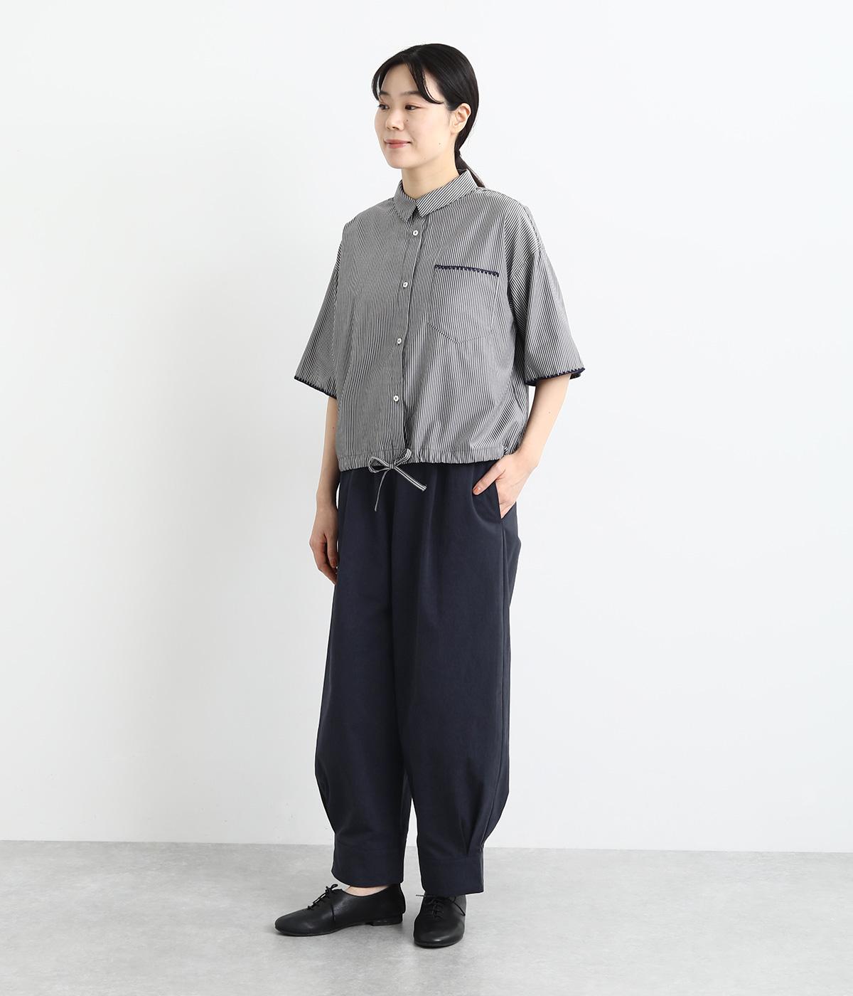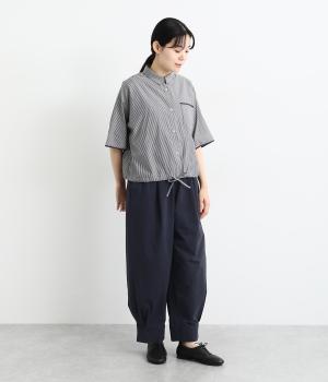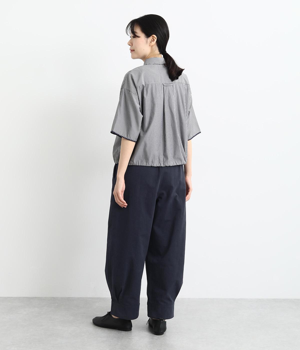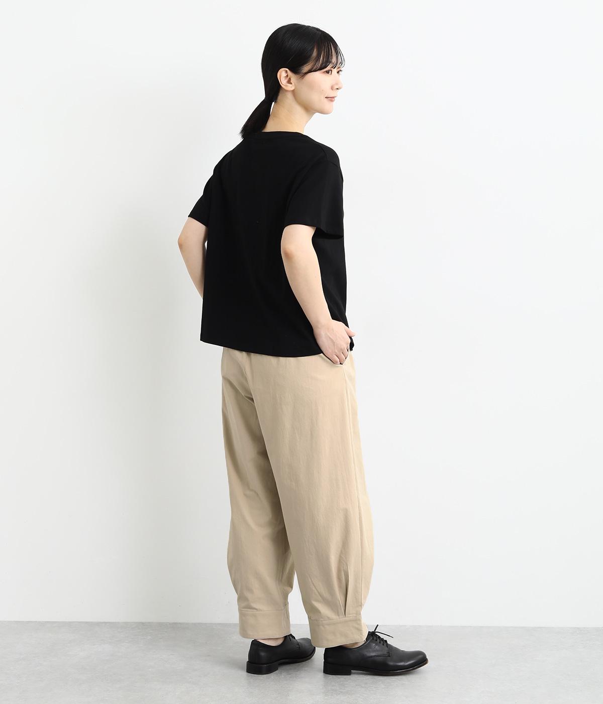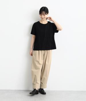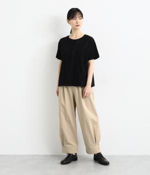 裾をまとめてタックを入れた、立体感のあるコクーンシルエット。ヒップから太ももまわりはゆったりとした作りで、脚のラインをひろわずにすっきりと見せてくれます。ウエストは総ゴム&内ヒモつきのリラックス仕様です。