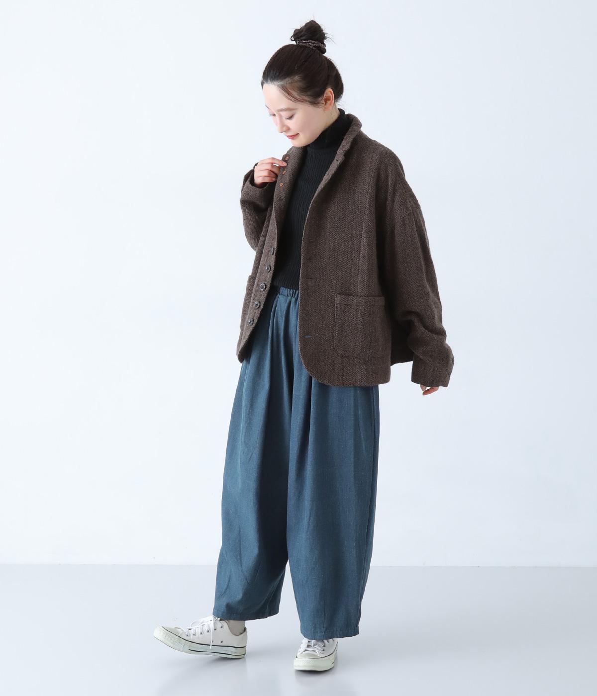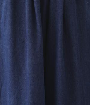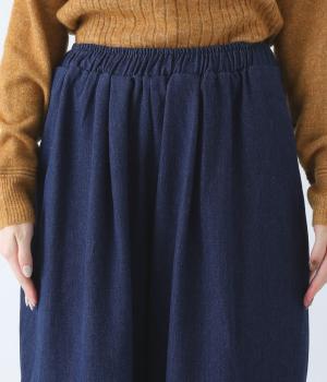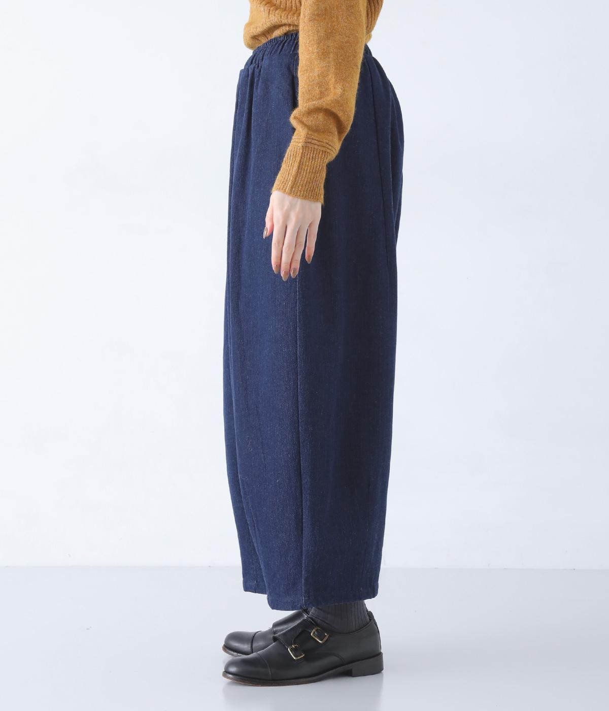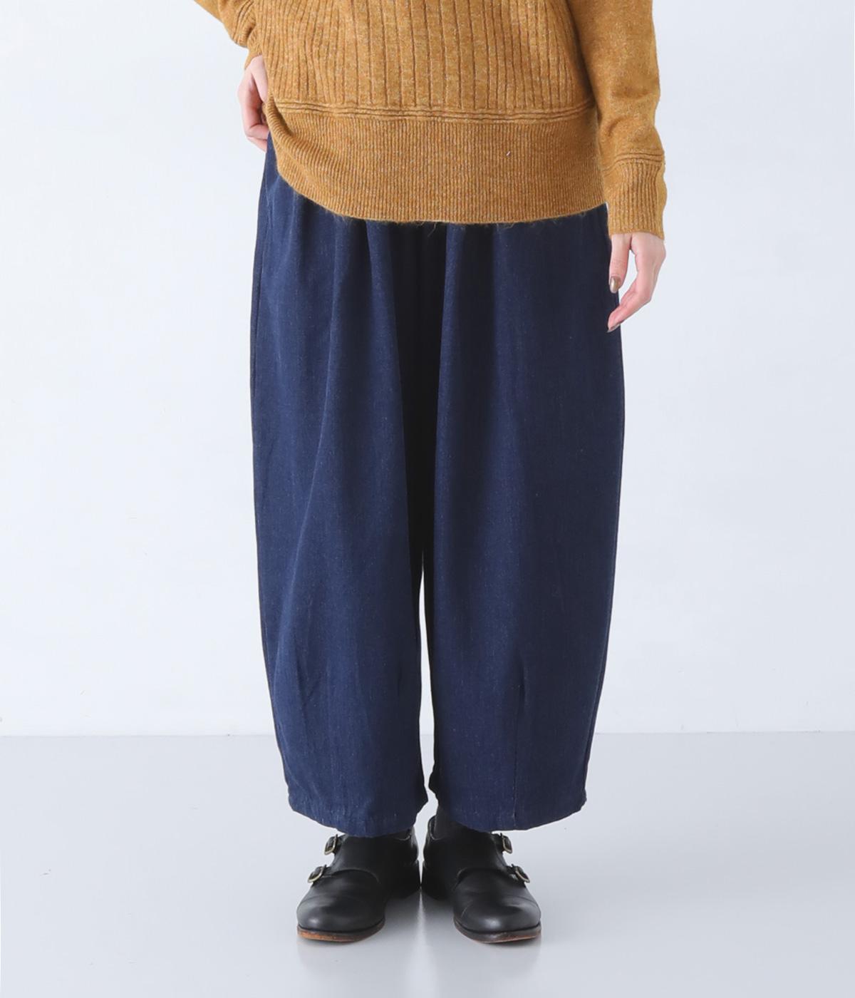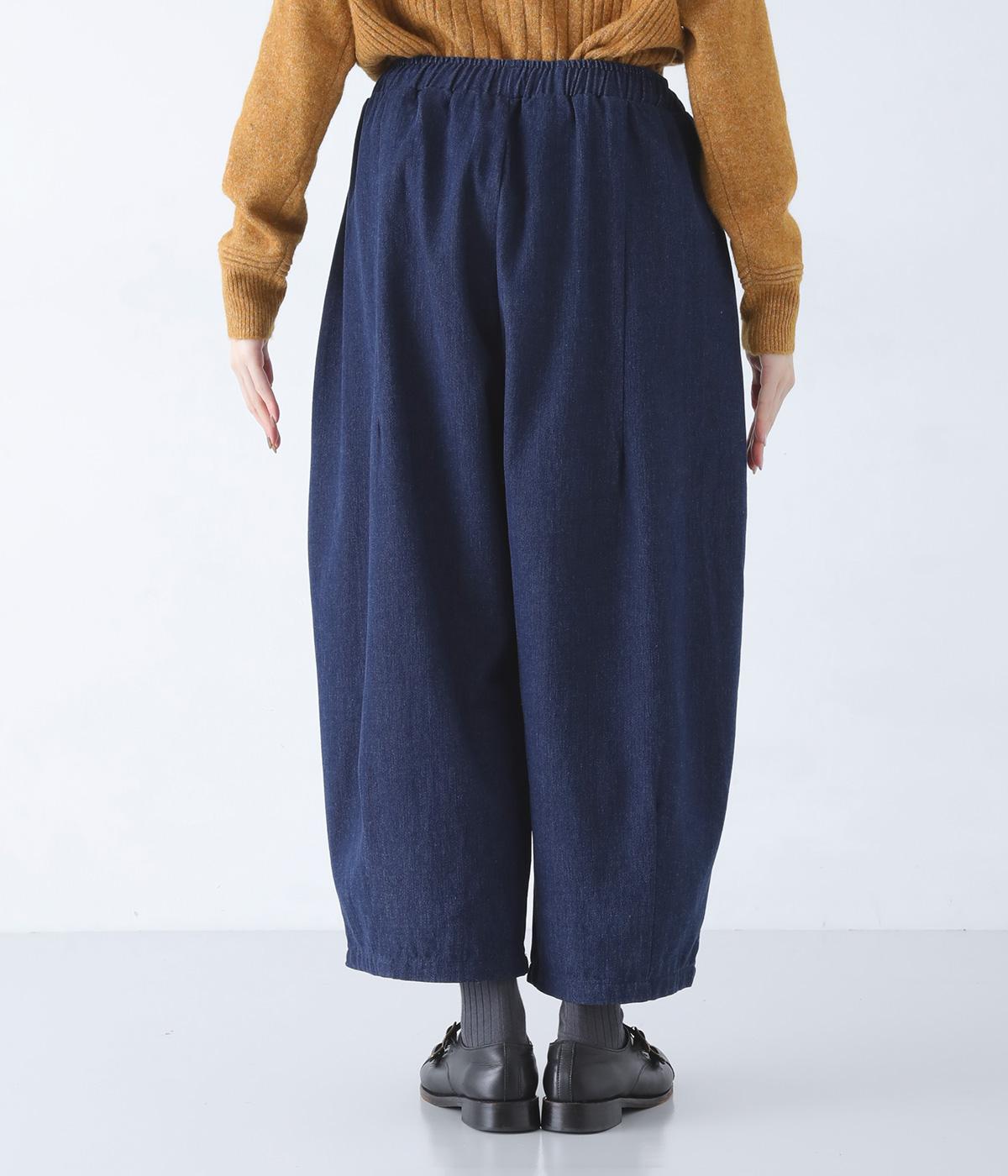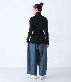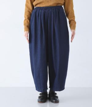 前ウエストにタックを、裾にダーツを施して丸みを帯びたコクーンシルエットに仕上げました。やわらかな生地がドレープを描きながら横への広がりをおさえ、丁度良いボリューム感に整えてくれます。ウエストは総ゴム仕様で、フィット感を高める内紐つきです。