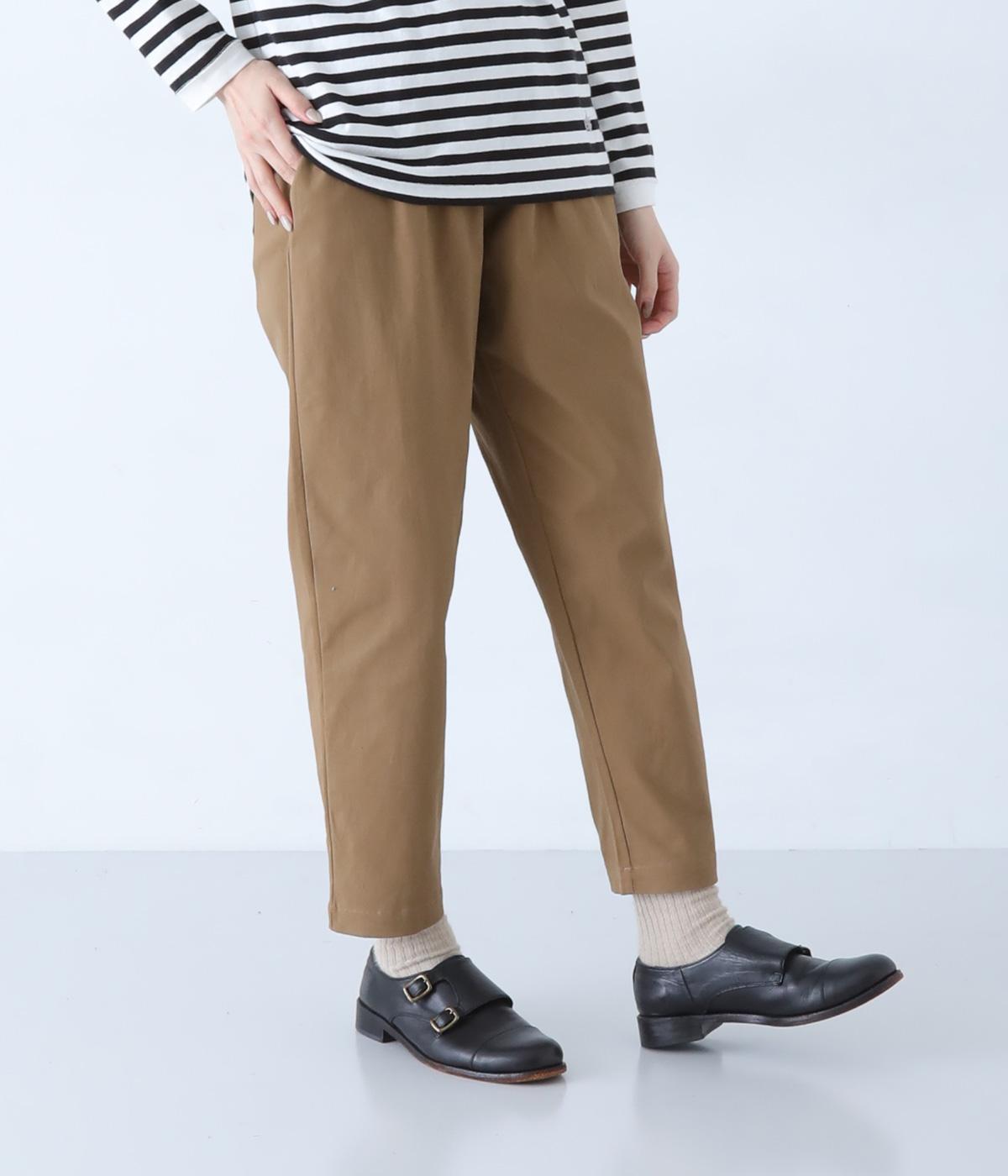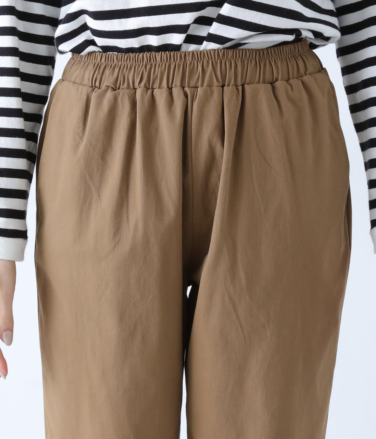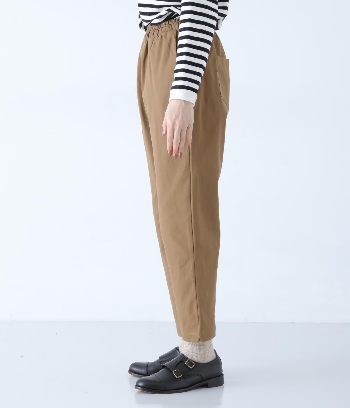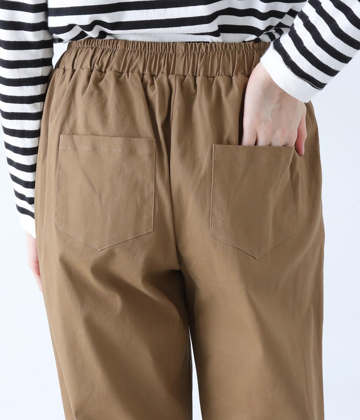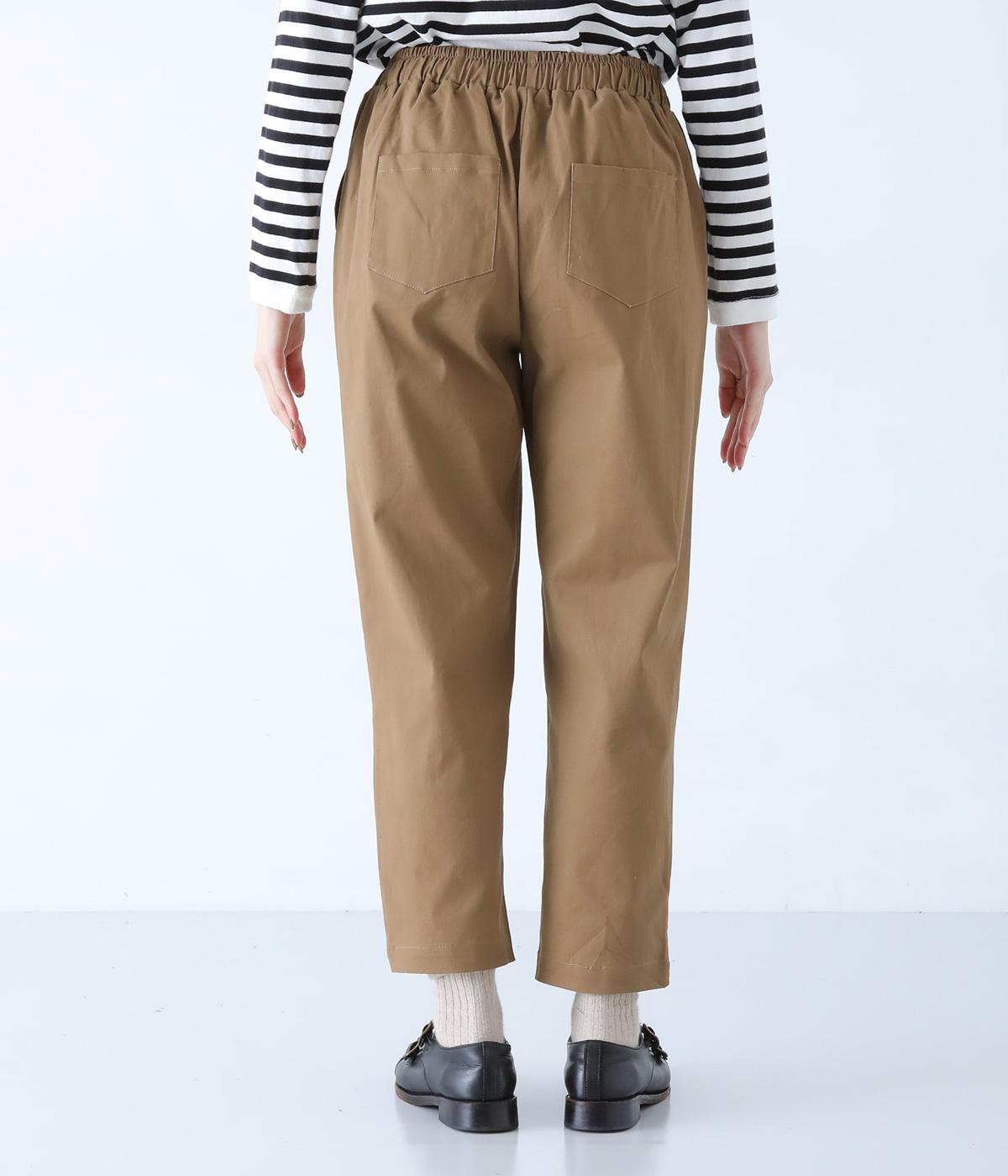 脚のラインをすっきりと見せる裾に向かって細くしたテーパードパンツ。トップスにボリュームが出やすい秋冬にもバランスの良い着こなしがたのしめます。ヒップポケットが後ろ姿のアクセントになりつつ、お尻のラインをさりげなくカバー。ウエストは総ゴム仕様で内紐つきです。