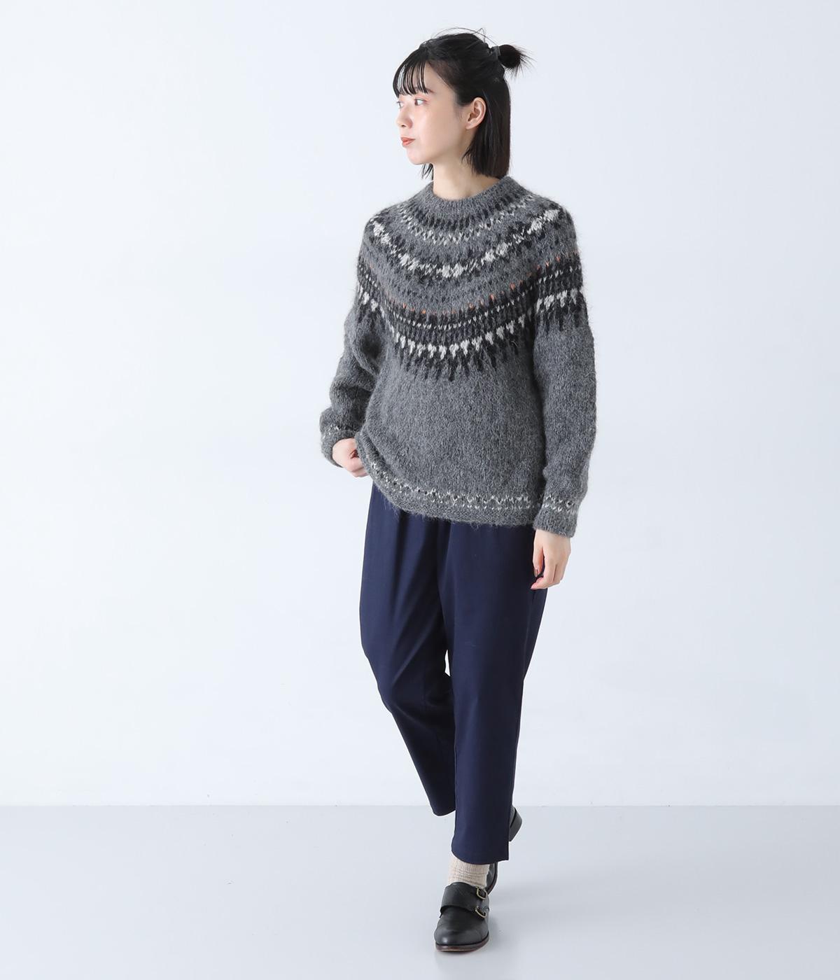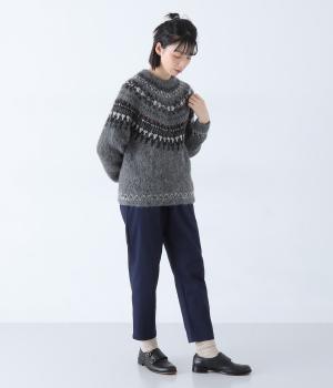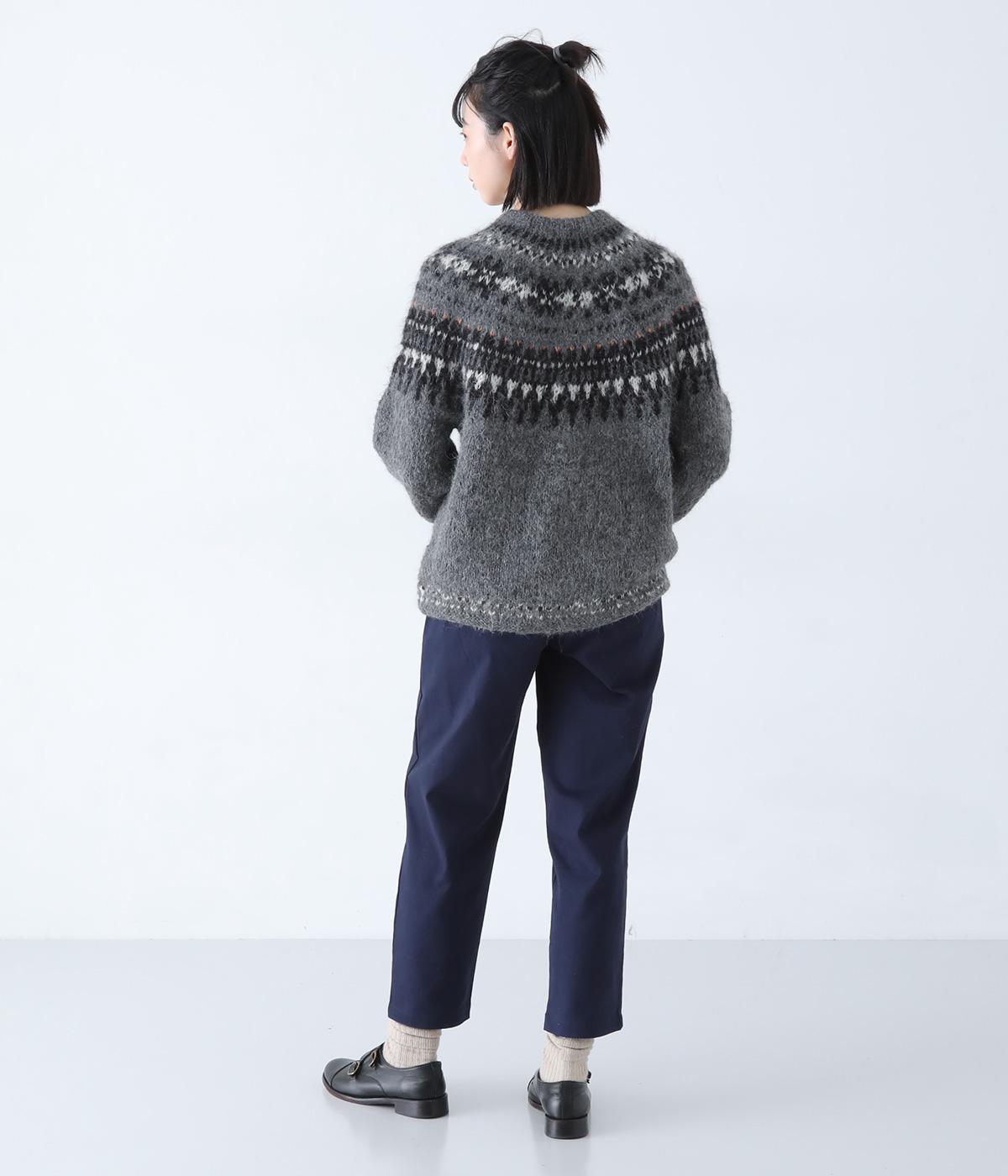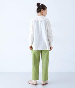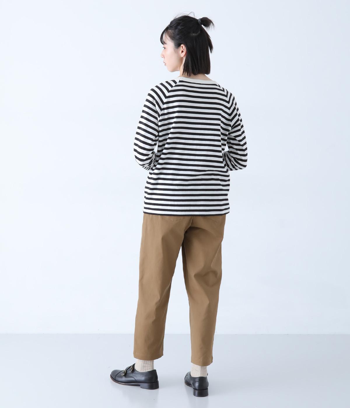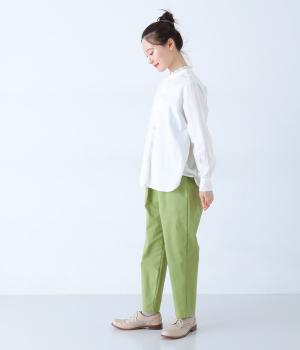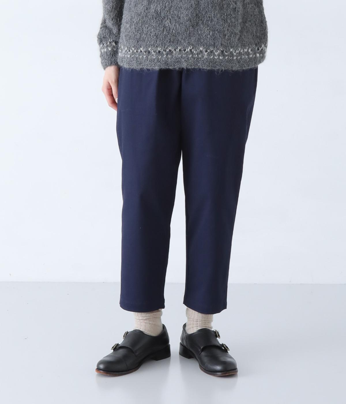 脚のラインをすっきりと見せる裾に向かって細くしたテーパードパンツ。トップスにボリュームが出やすい秋冬にもバランスの良い着こなしがたのしめます。ヒップポケットが後ろ姿のアクセントになりつつ、お尻のラインをさりげなくカバー。ウエストは総ゴム仕様で内紐つきです。